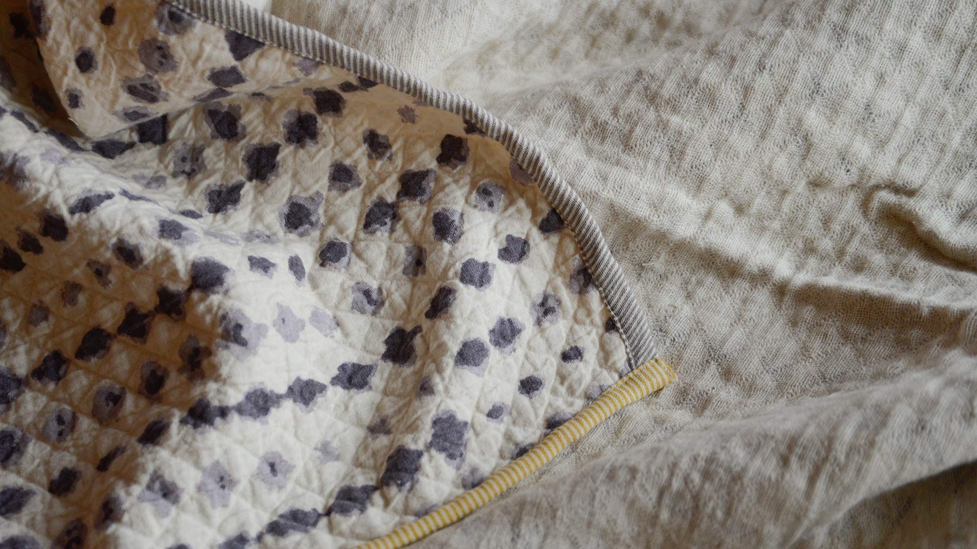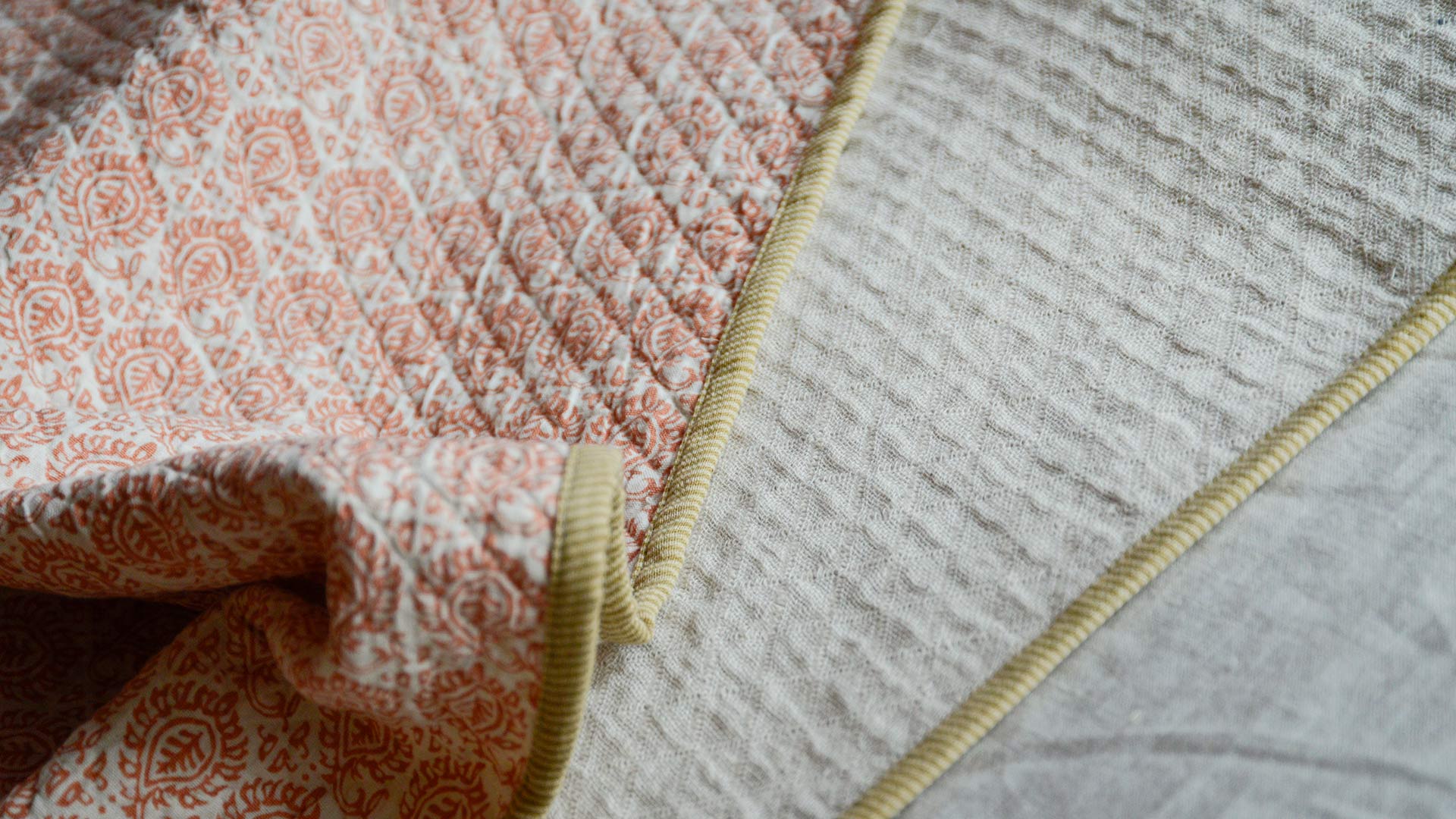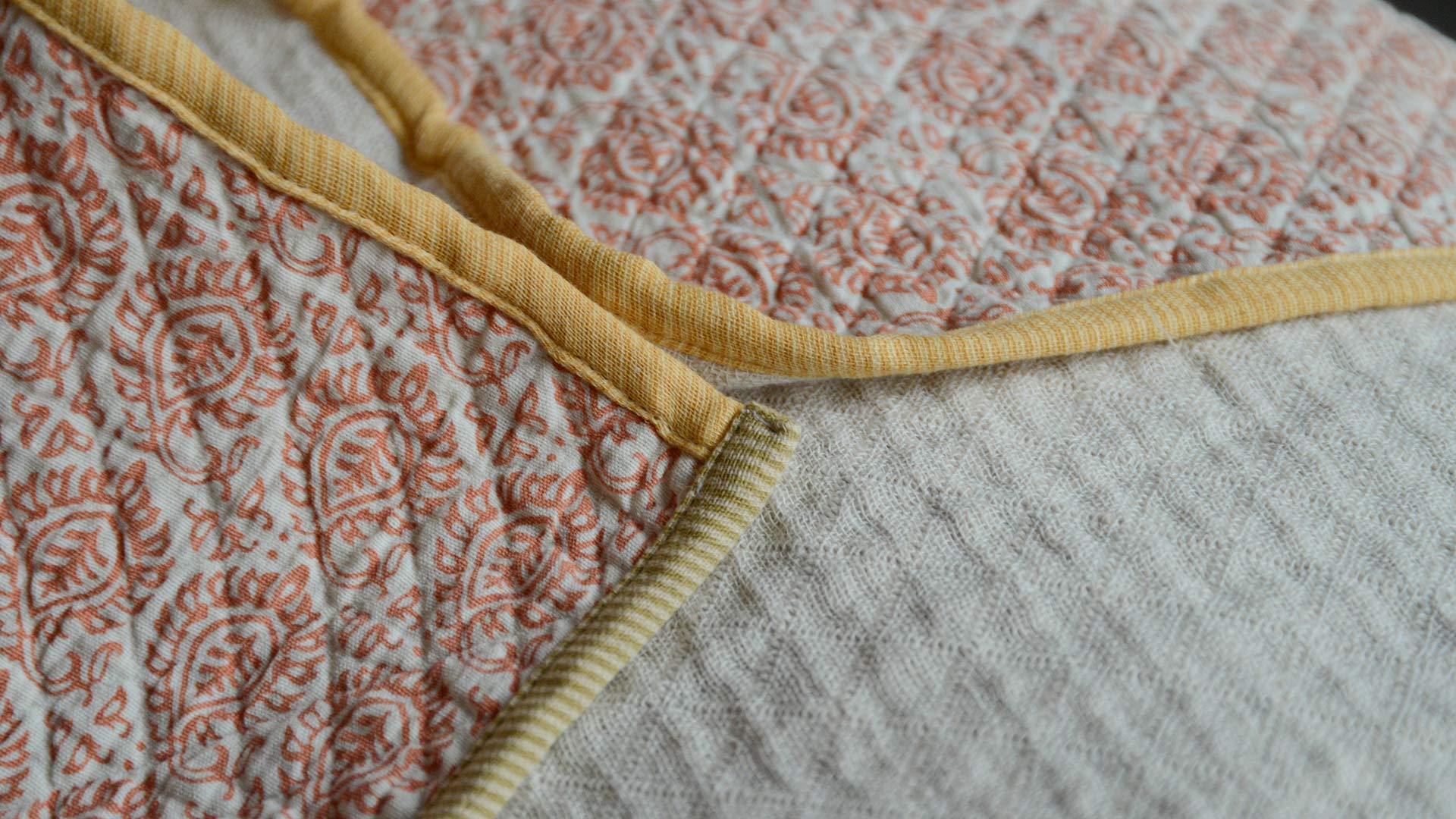 Terracotta Tile: warm pink-orange block print pattern over warm ivory, with contrast edging in yellow and beige Mustard Diamond: deep mustard yellow filigree diamonds over warm ivory, with contrast edging in baby pink and blue Ink Blots: dark grey-blue ink blots striped over warm ivory, with contrast edging in pale, purplish grey and yellow