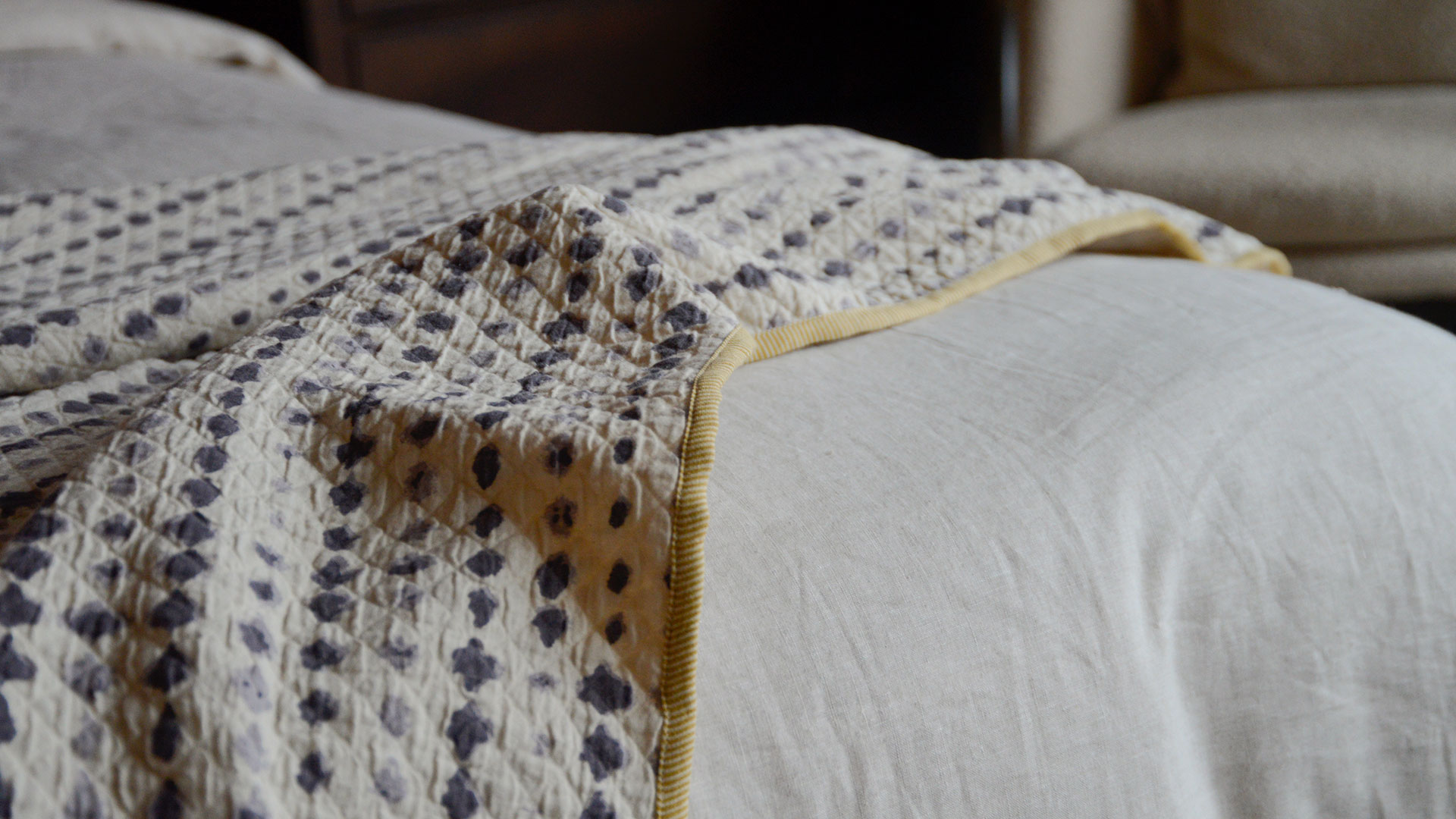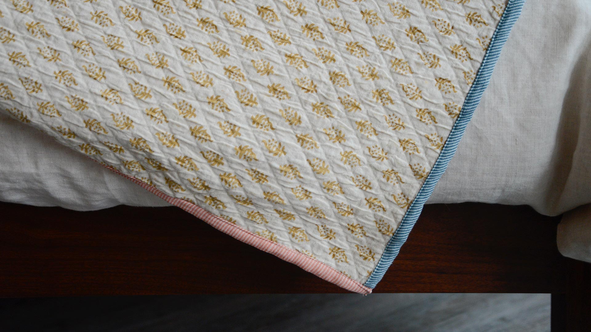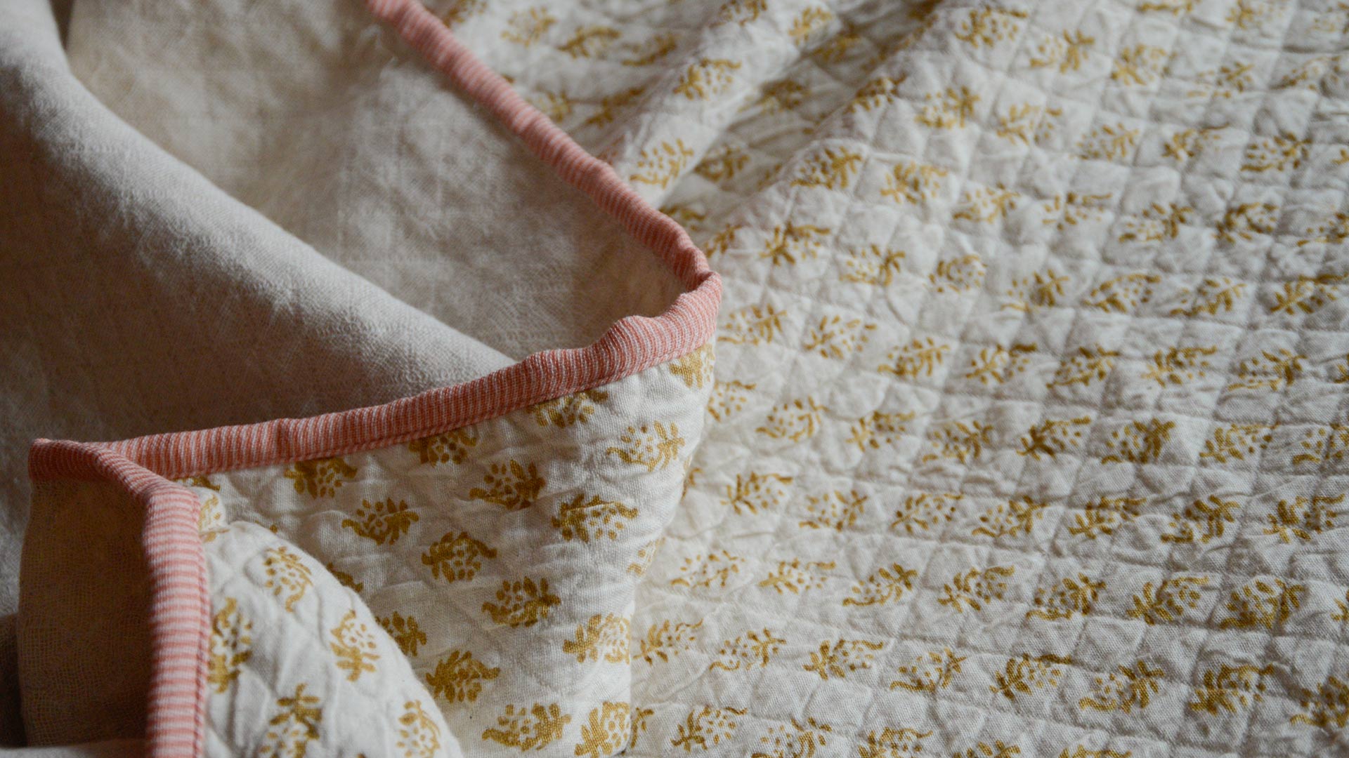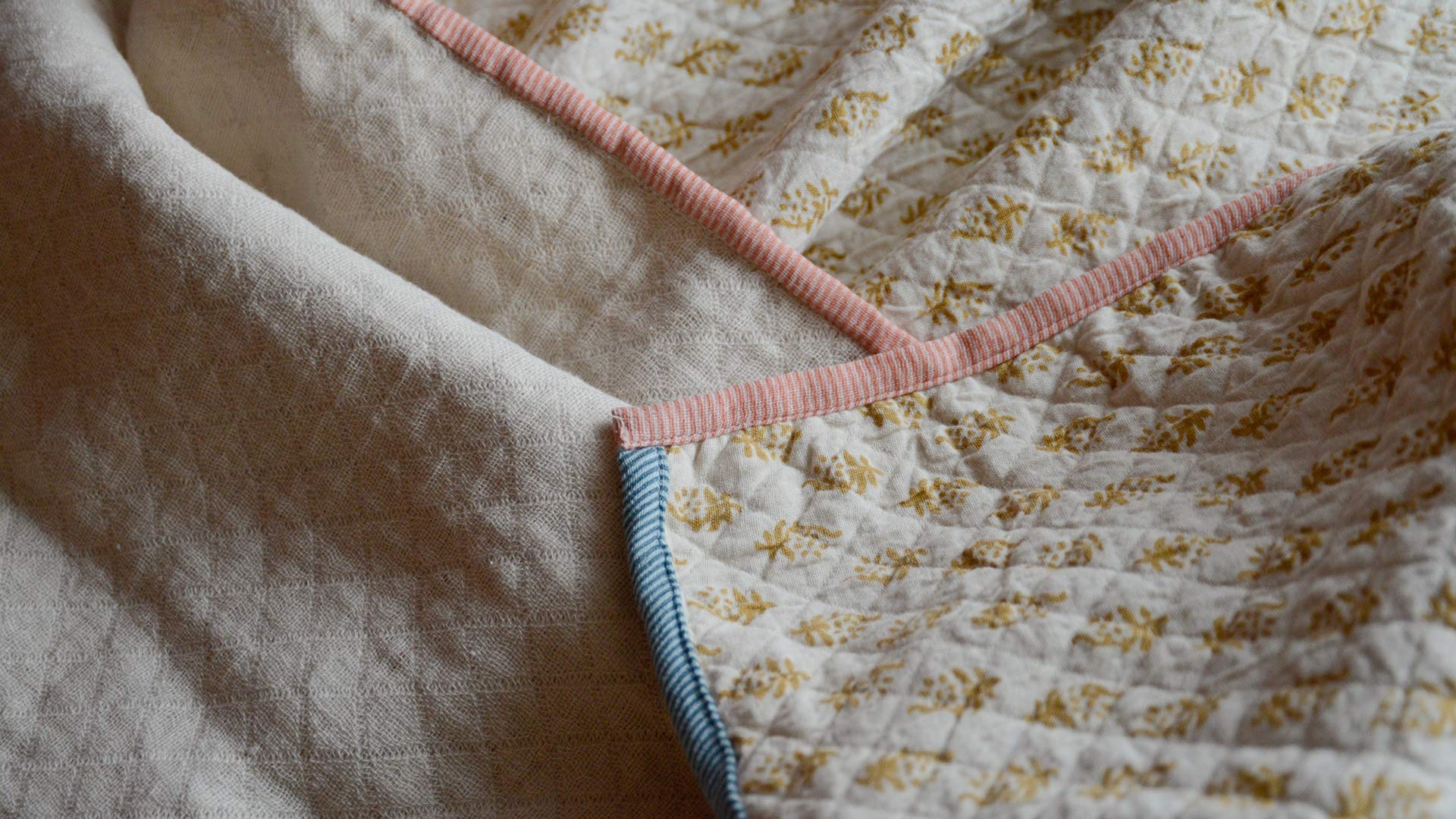 Terracotta Tile: warm pink-orange block print pattern over warm ivory, with contrast edging in yellow and beige Mustard Diamond: deep mustard yellow filigree diamonds over warm ivory, with contrast edging in baby pink and blue Ink Blots: dark grey-blue ink blots striped over warm ivory, with contrast edging in pale, purplish grey and yellow