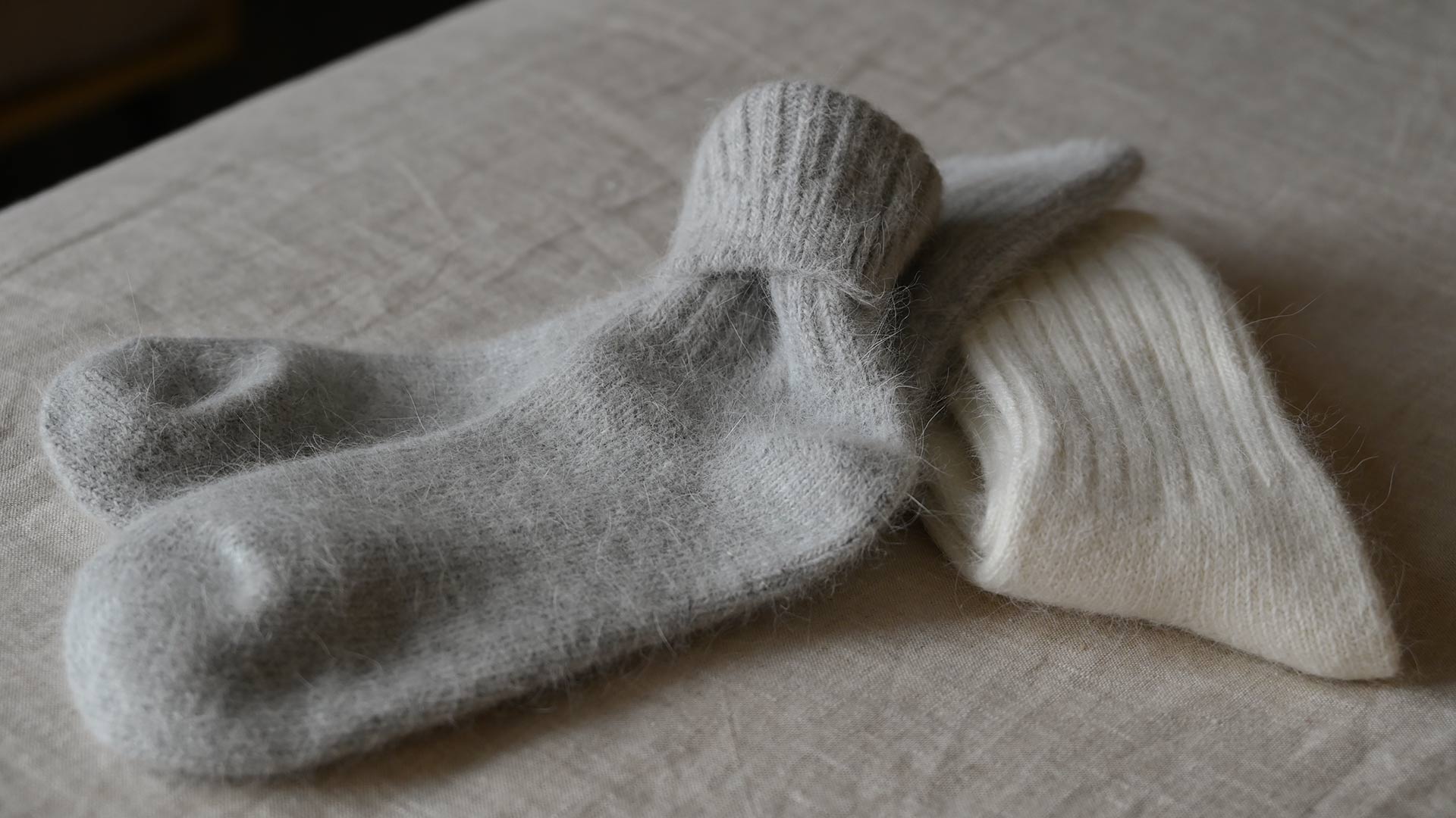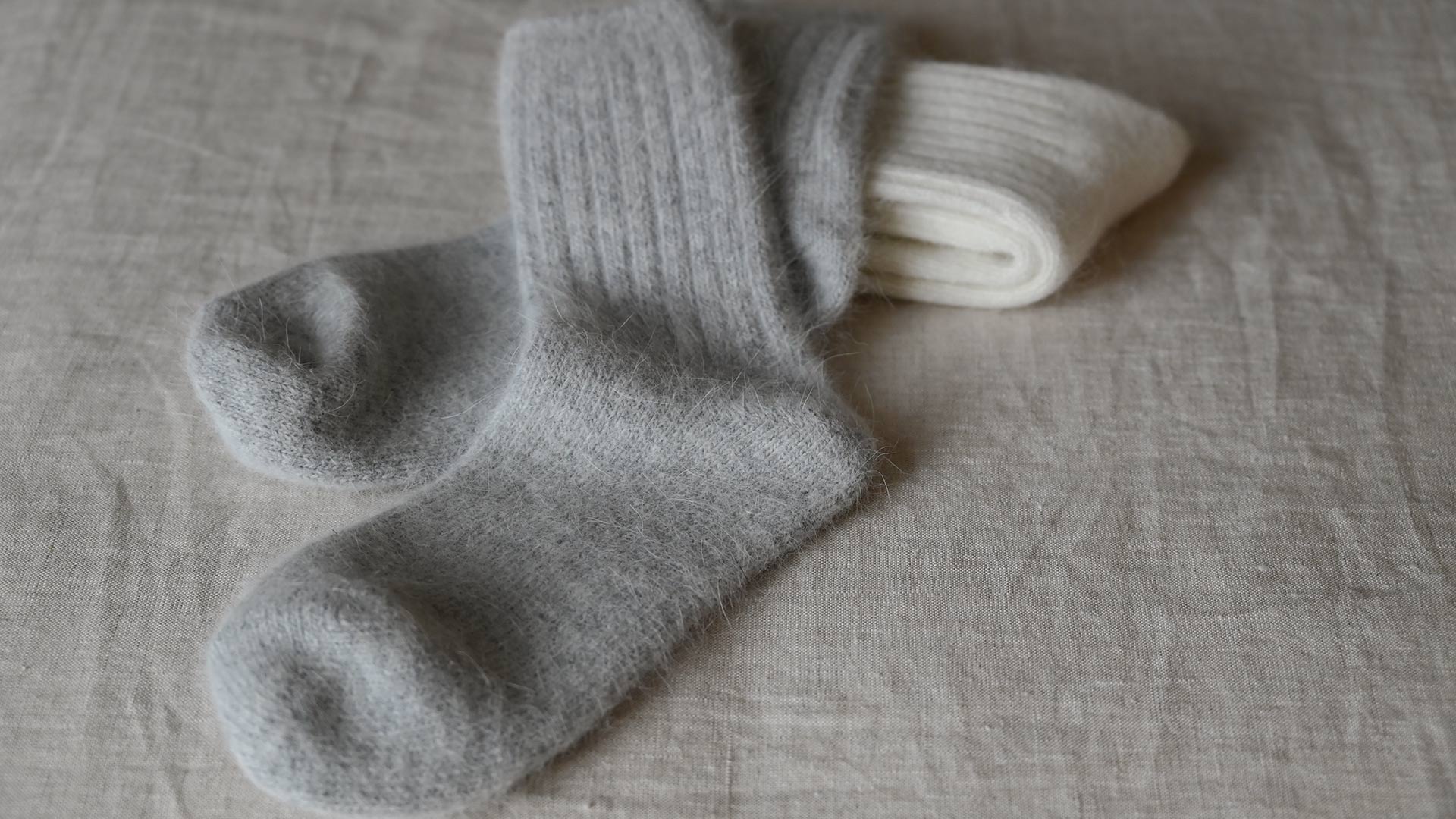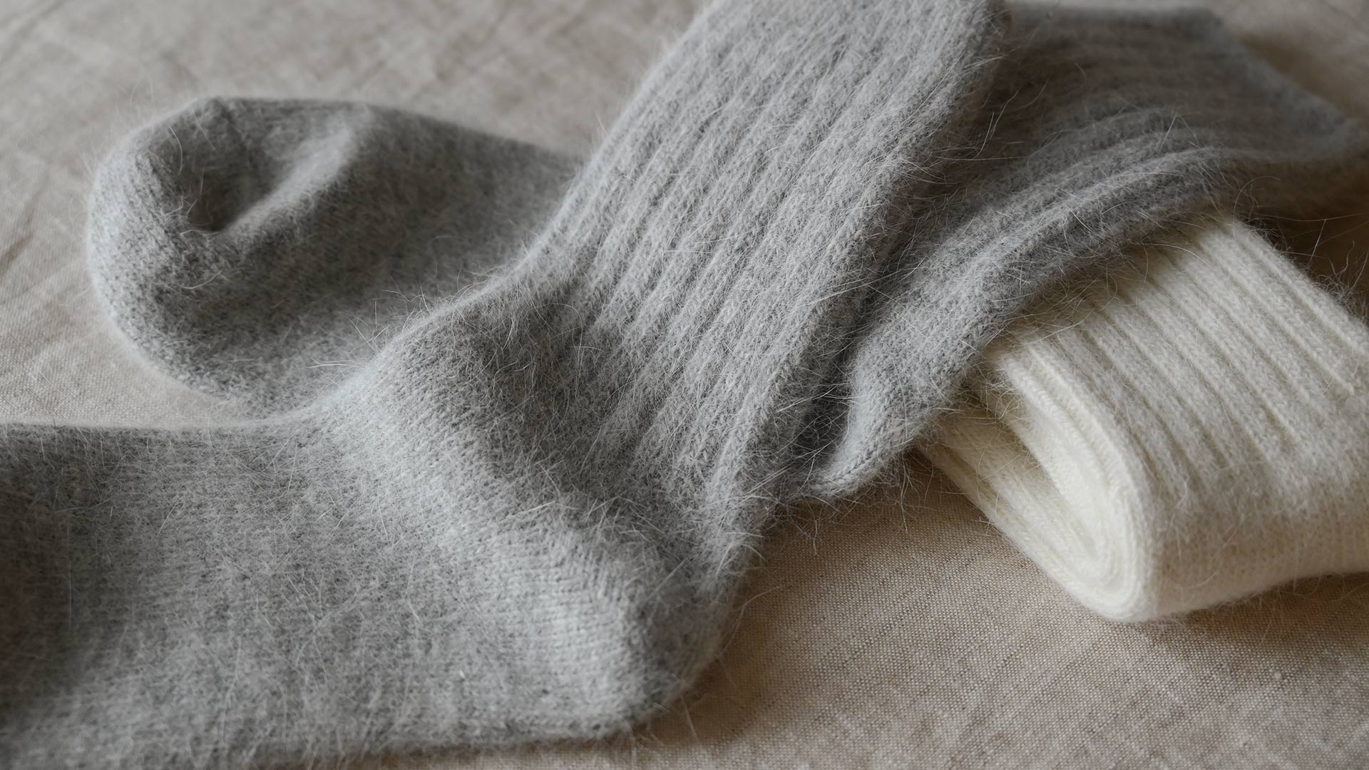 A collection of soft, cosy socks from Chalk, made with Angora wool. Tactile and stretchy, with a ribbed detail to the ankle, these socks are perfect to wear in bed, on cosy nights in, or with your favourite winter boots.