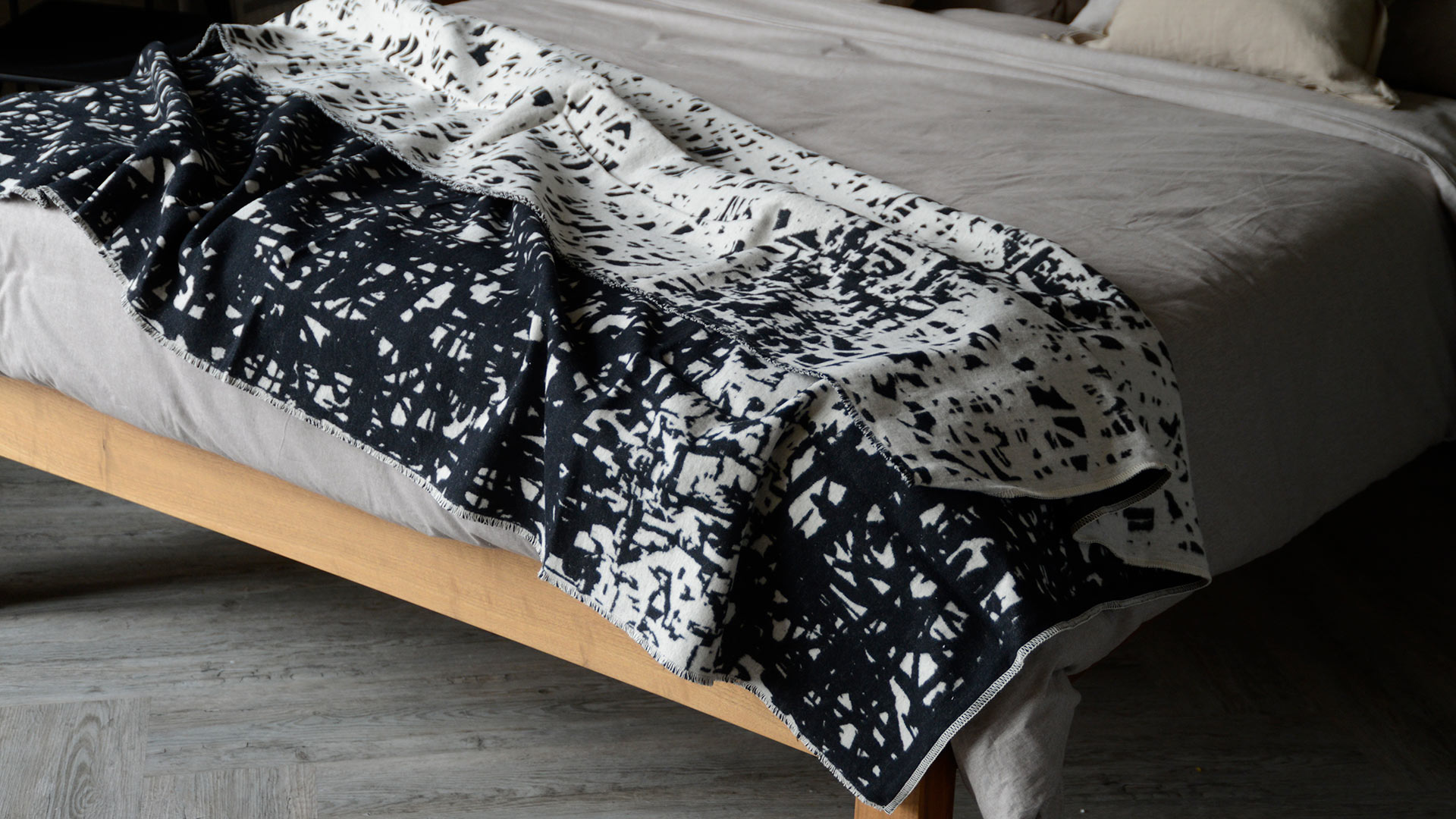 Modern, cosy blankets in a soft cotton-rich fabric. The fabric has a kitten soft, fleecy feel available in two colourways with a modern abstract design. These blankets a great choice for over the end of your bed, to update your bedroom scheme. Complete with matching shoulder bag.