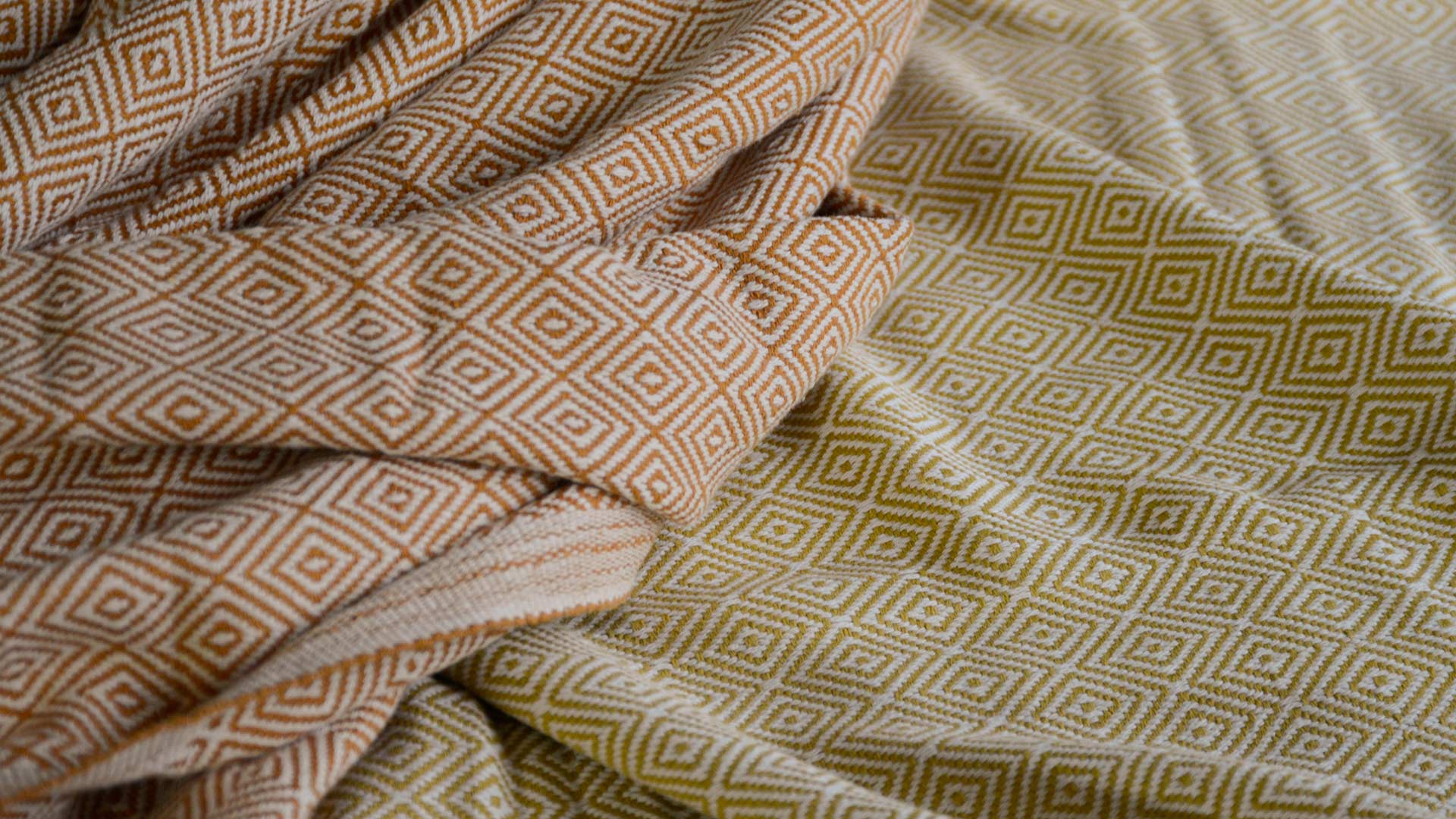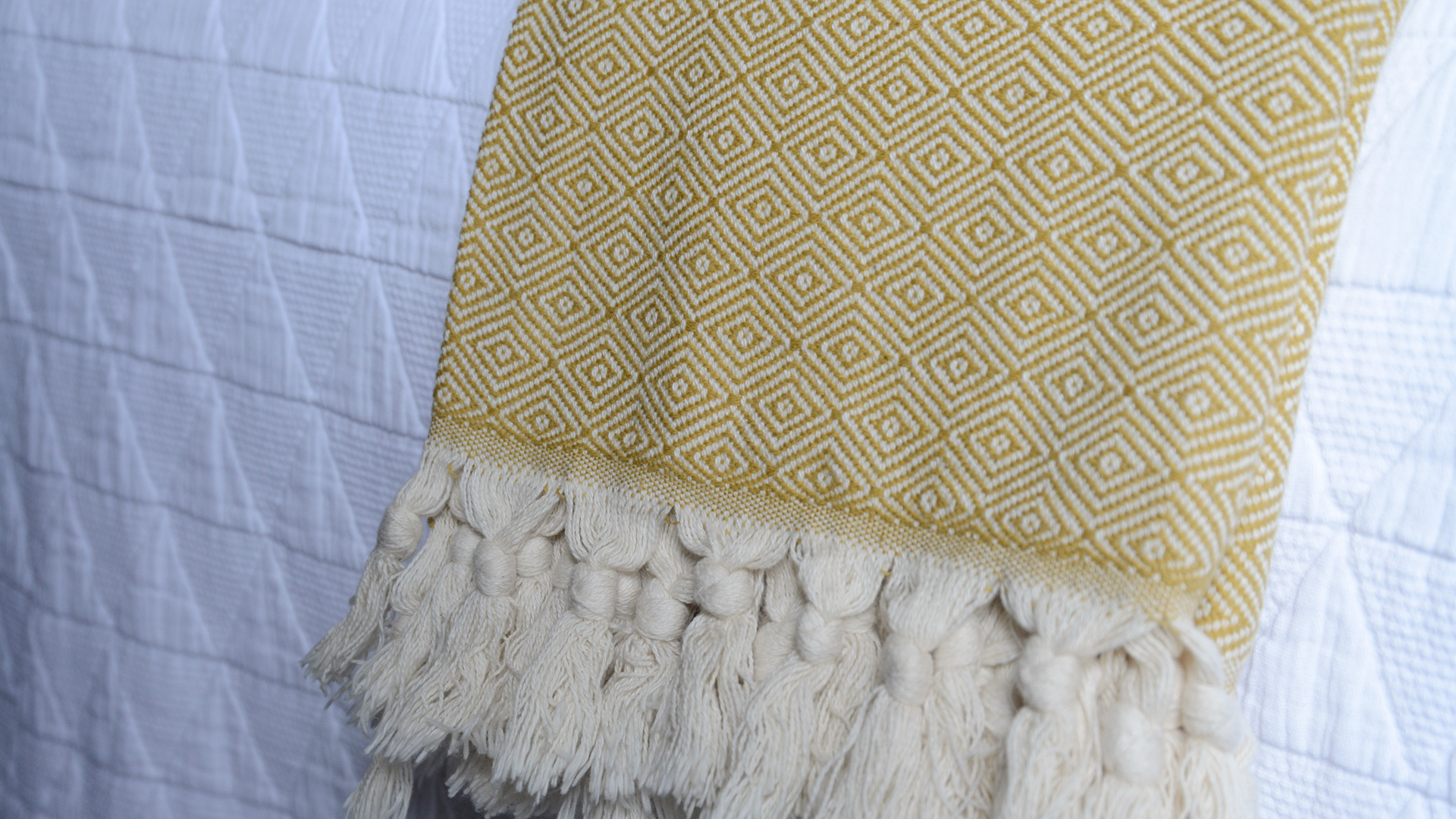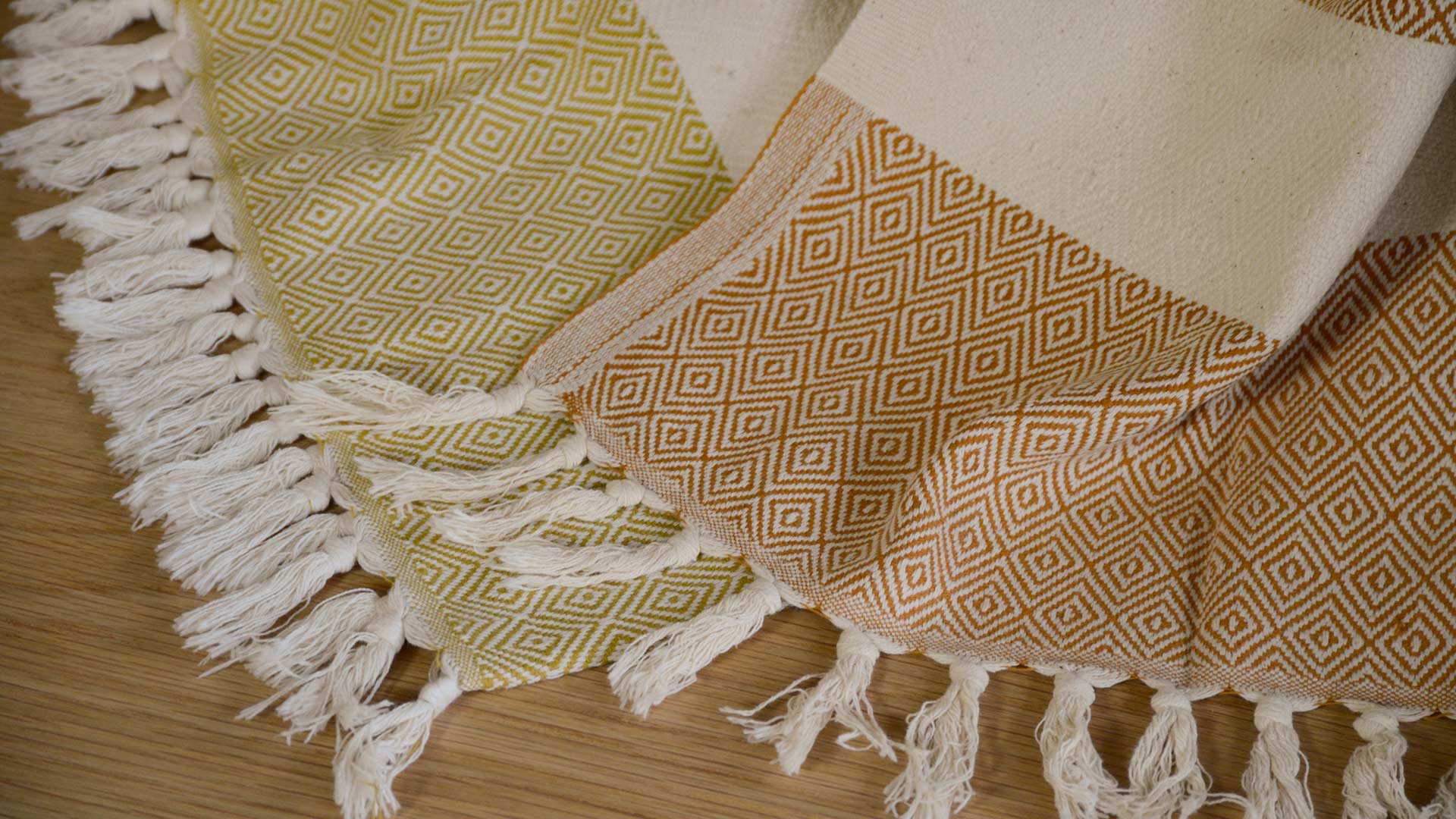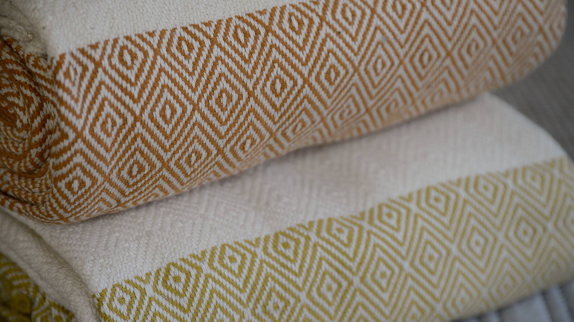 A collection of hand crafted cotton blankets with an contemporary diamond pattern. In Tan or Chartruese colour-ways. Woven by master weavers using traditional methods and natural materials.