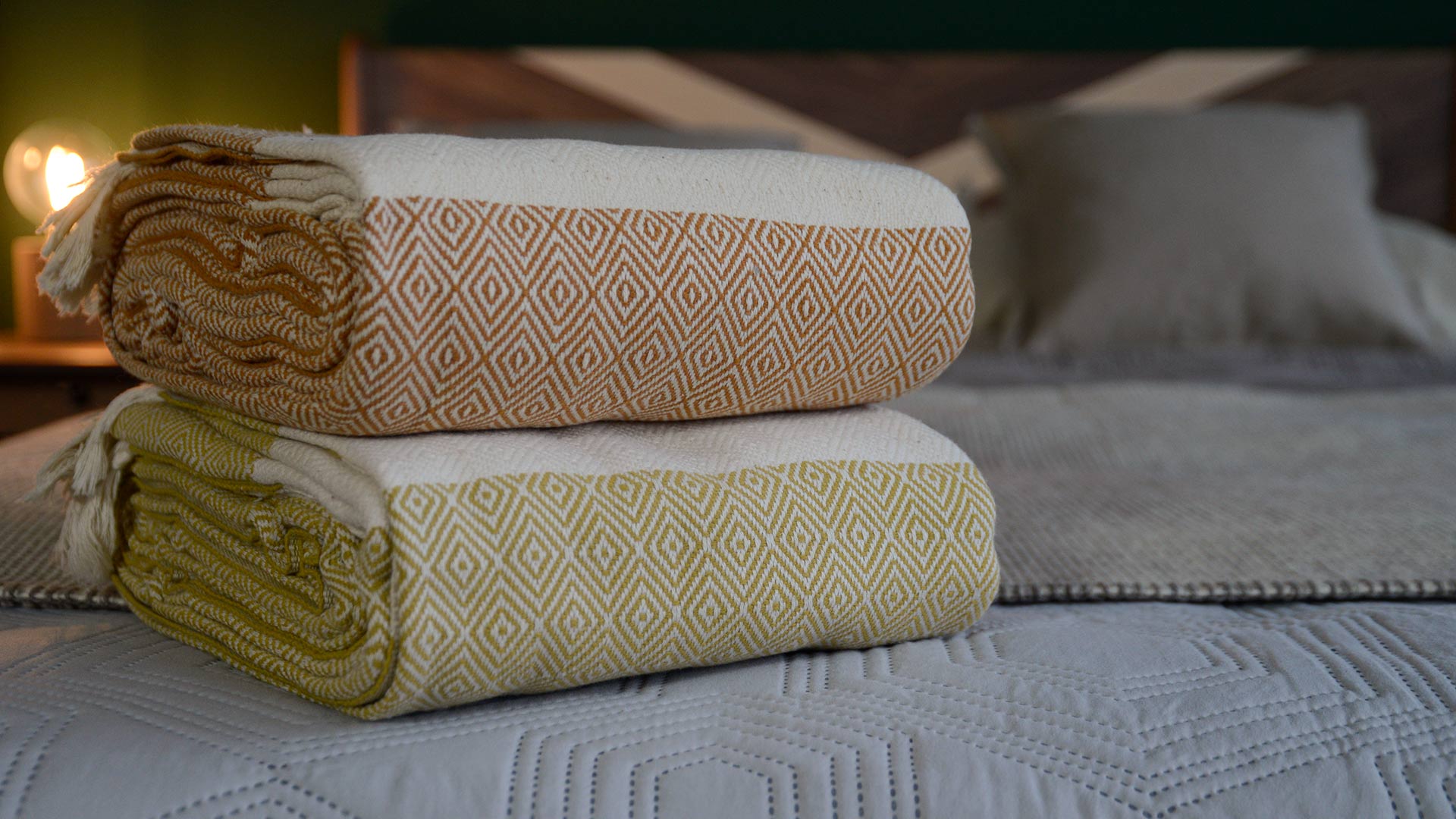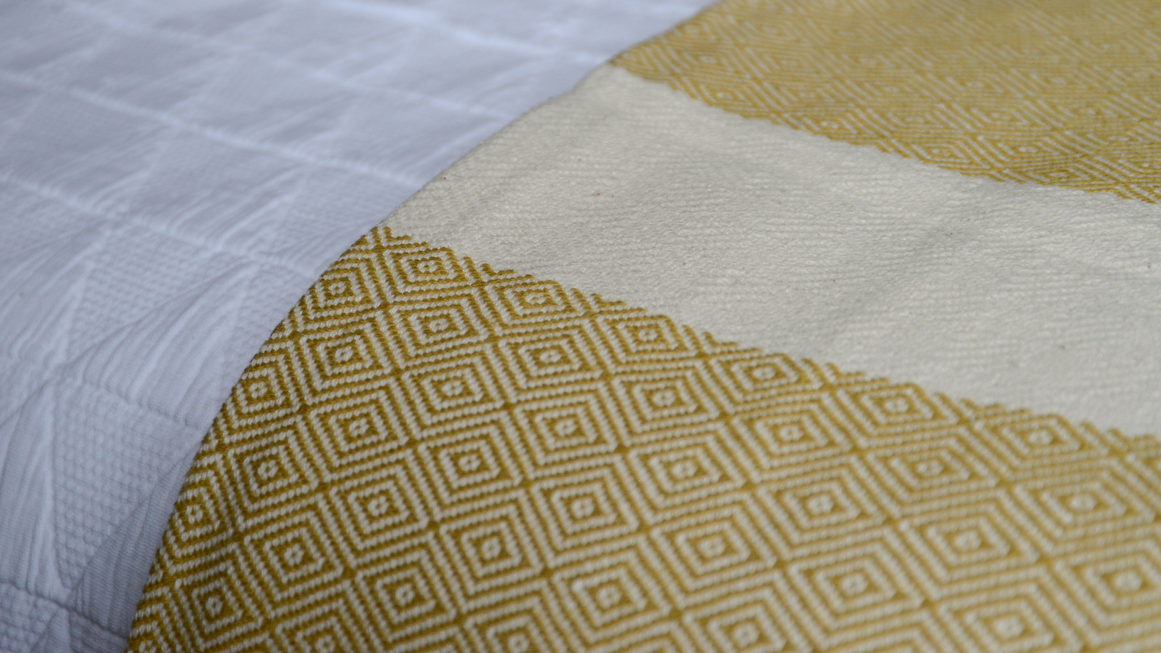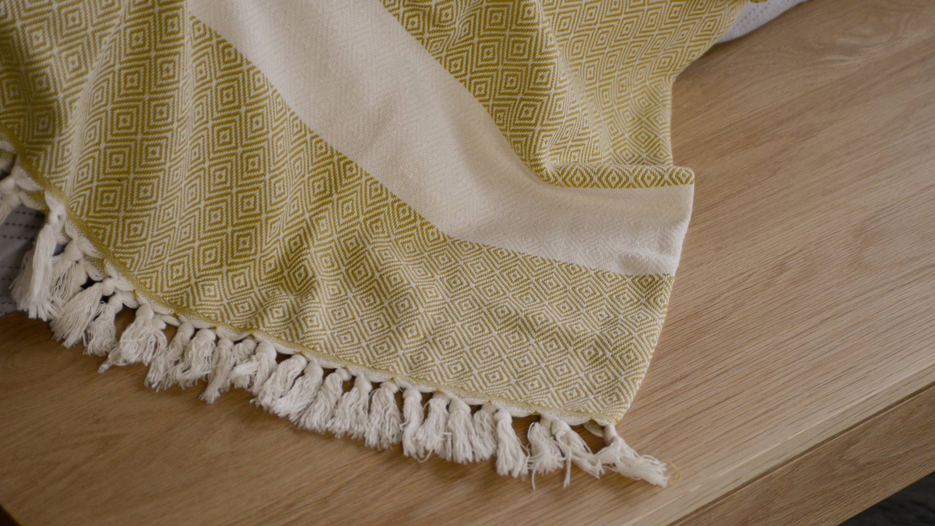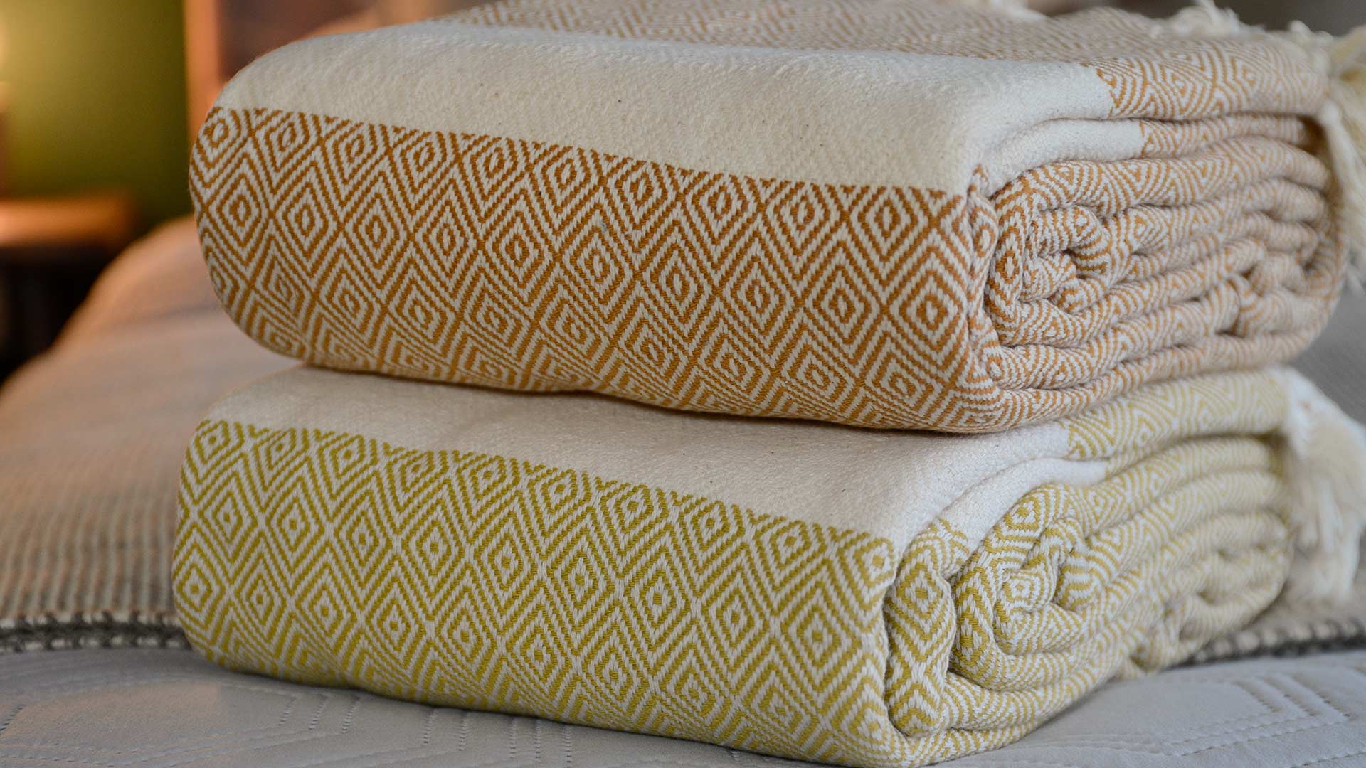 A collection of hand crafted cotton blankets with an contemporary diamond pattern. In Tan or Chartruese colour-ways. Woven by master weavers using traditional methods and natural materials.