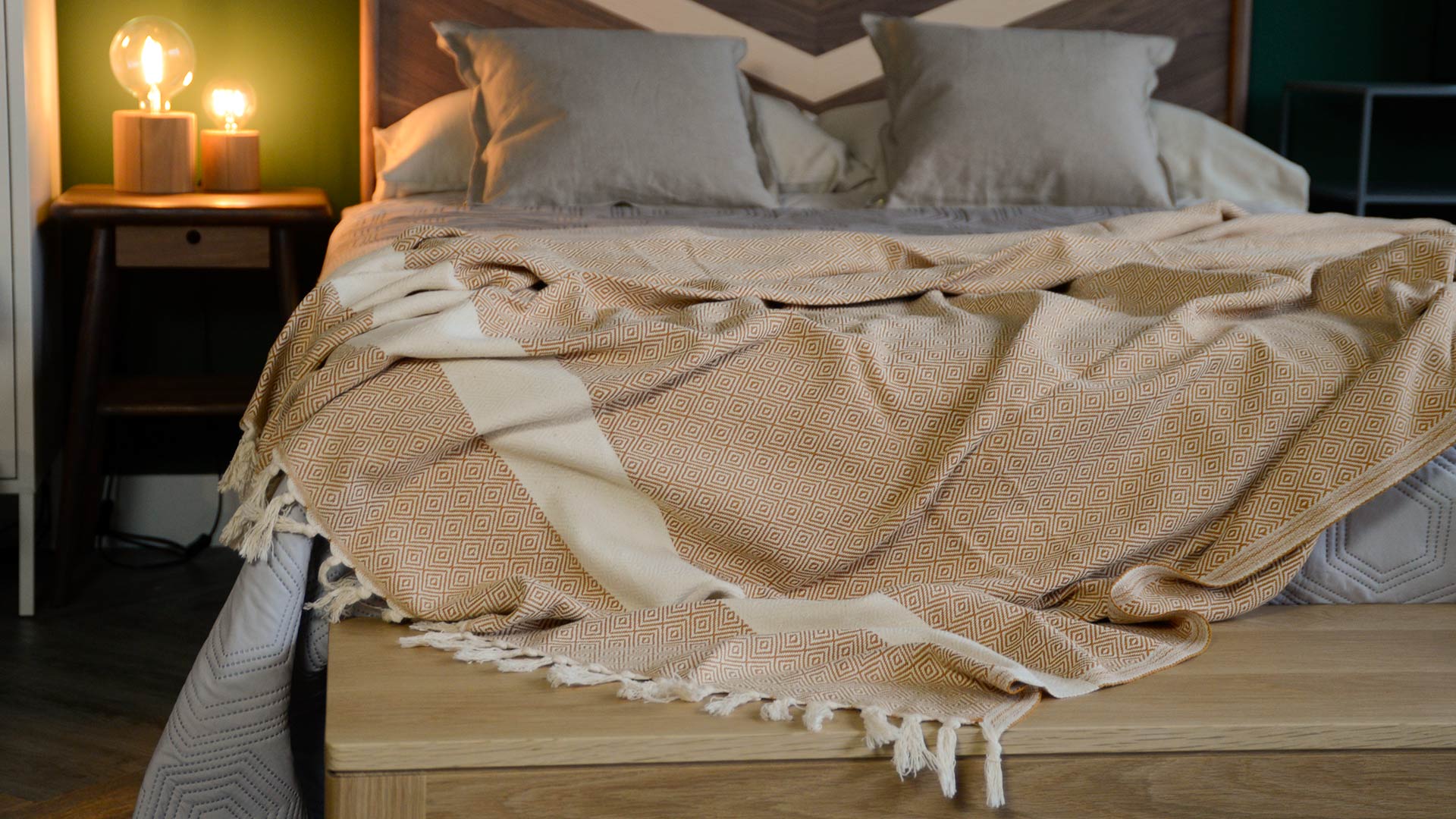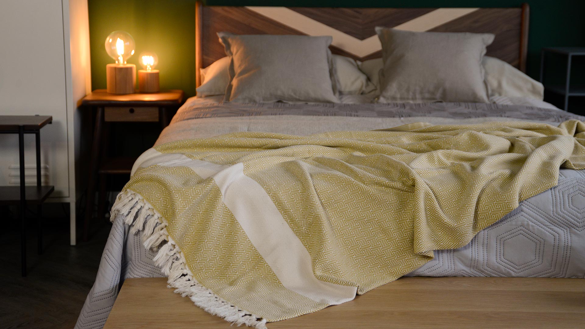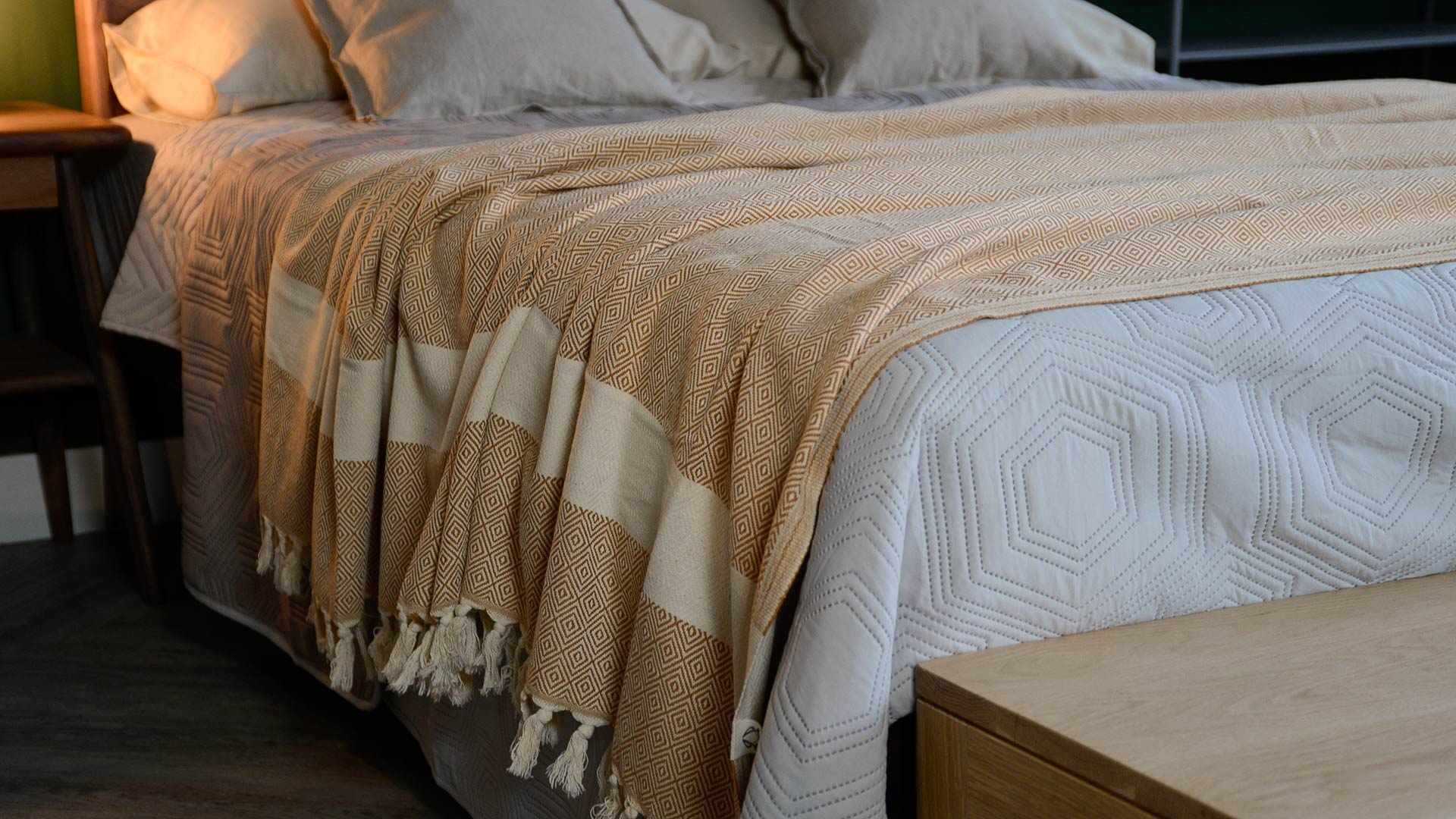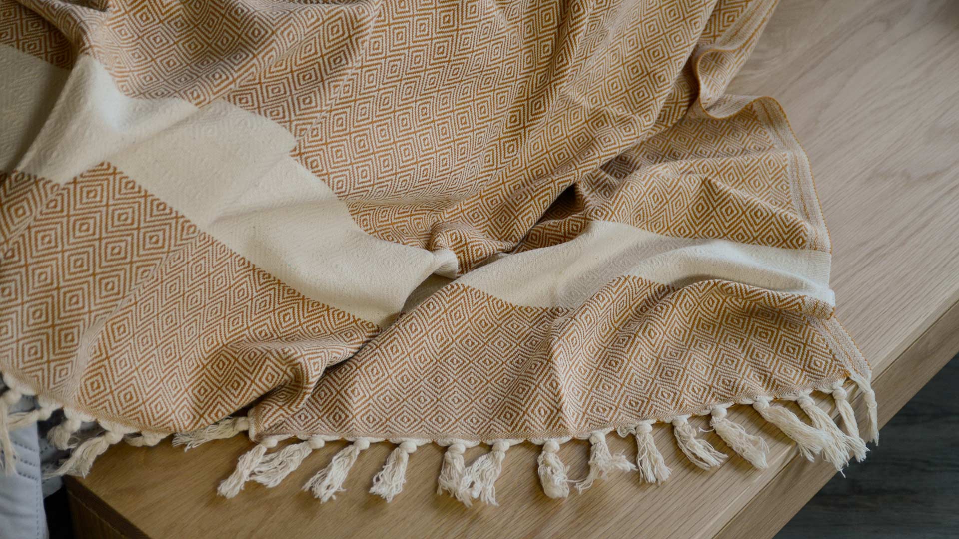 A collection of hand crafted cotton blankets with an contemporary diamond pattern. In Tan or Chartruese colour-ways. Woven by master weavers using traditional methods and natural materials.