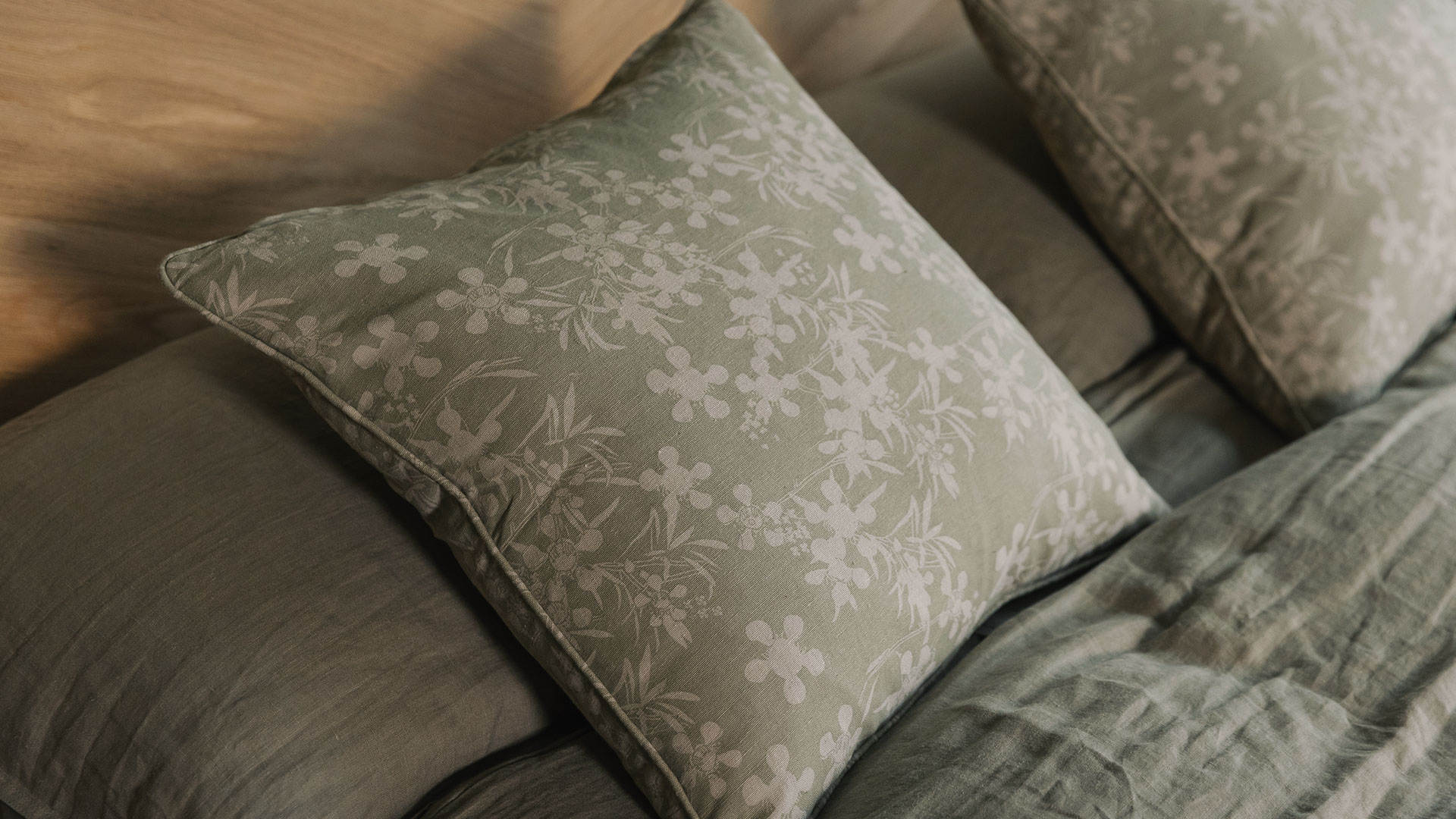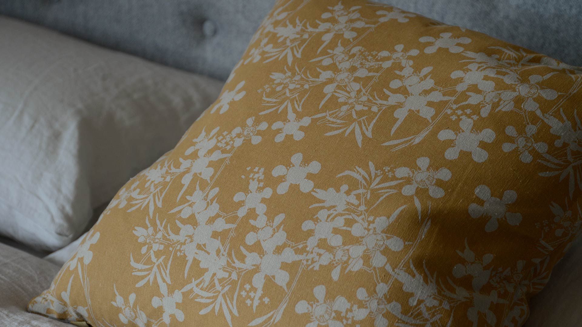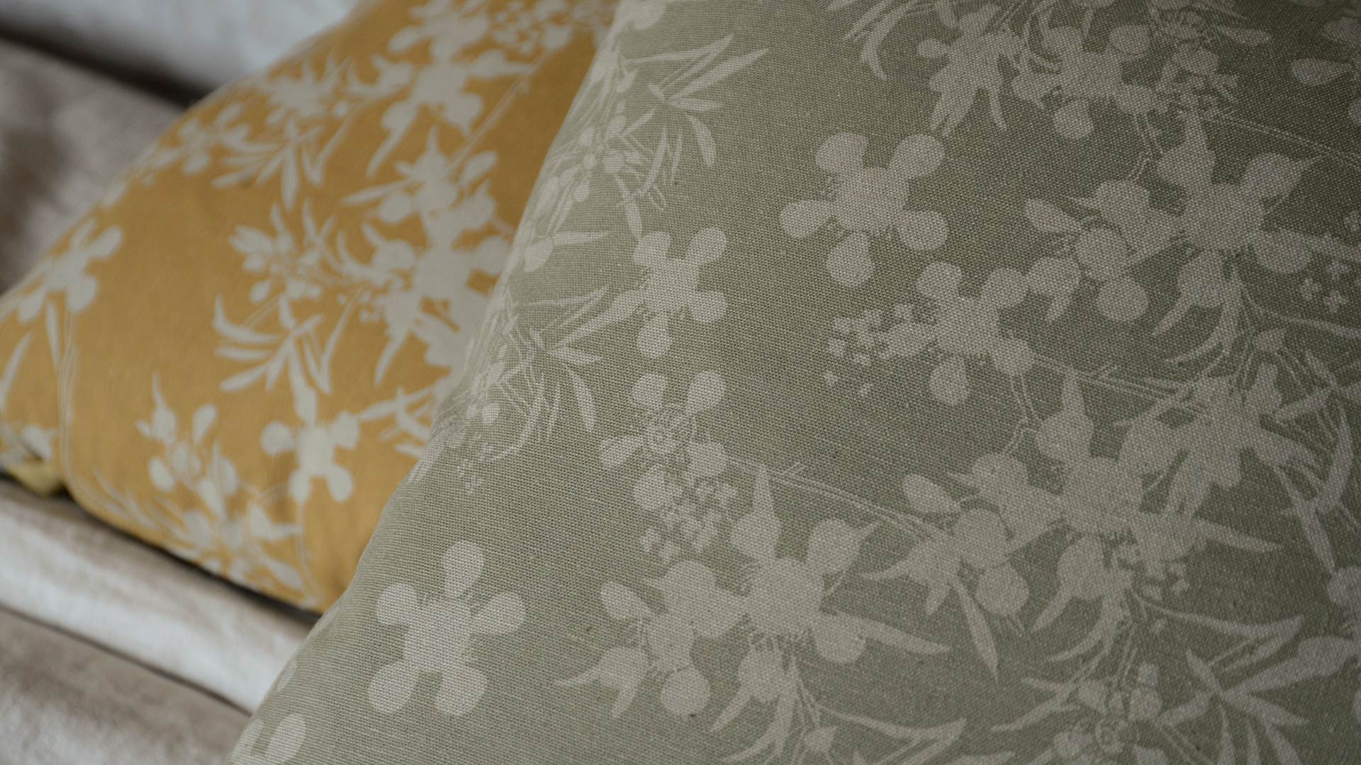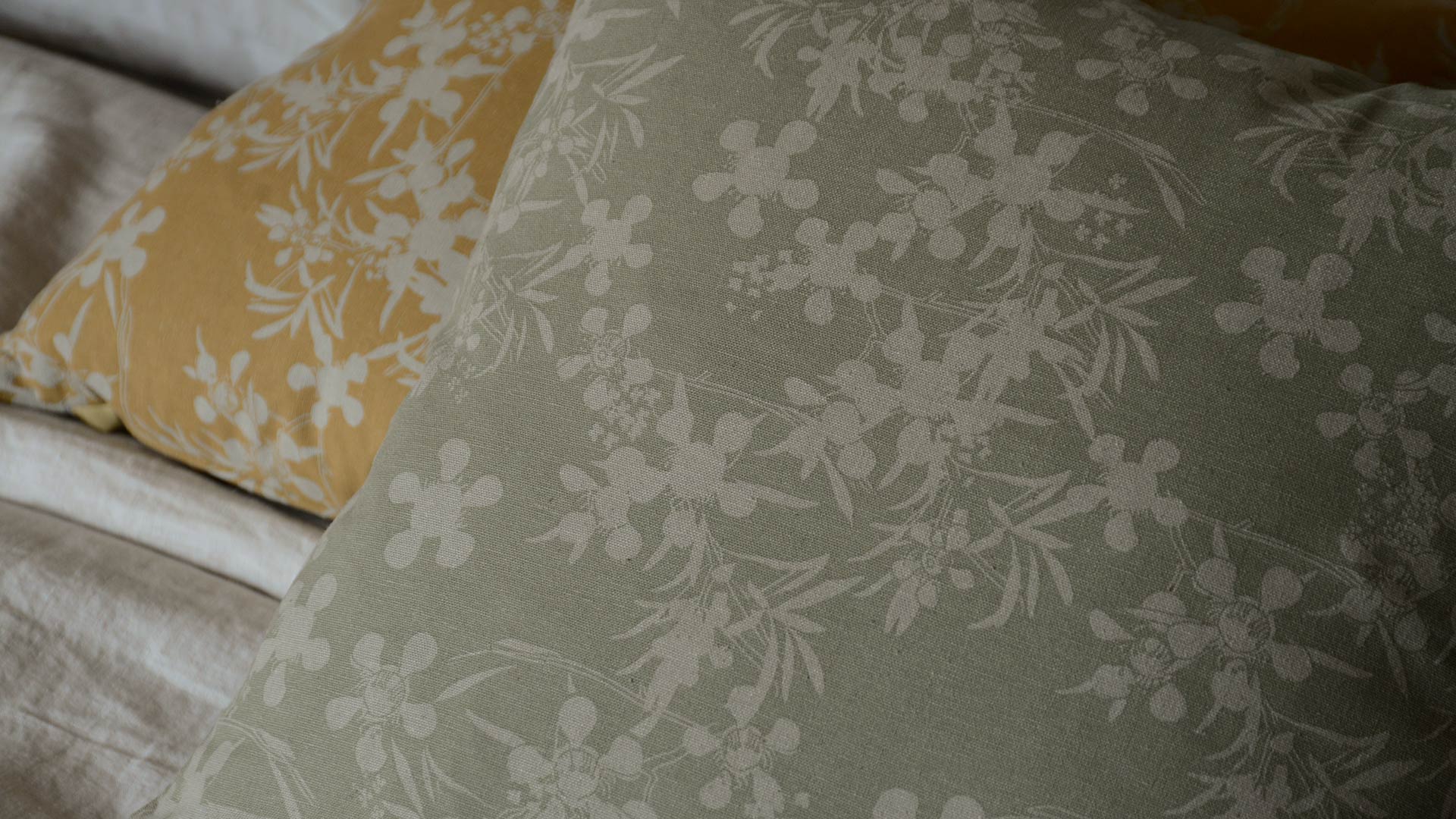 Recycled cotton-blend floral cushions featuring a taupe myrtle flower design. Available in two colour-ways: Honey and Sage.