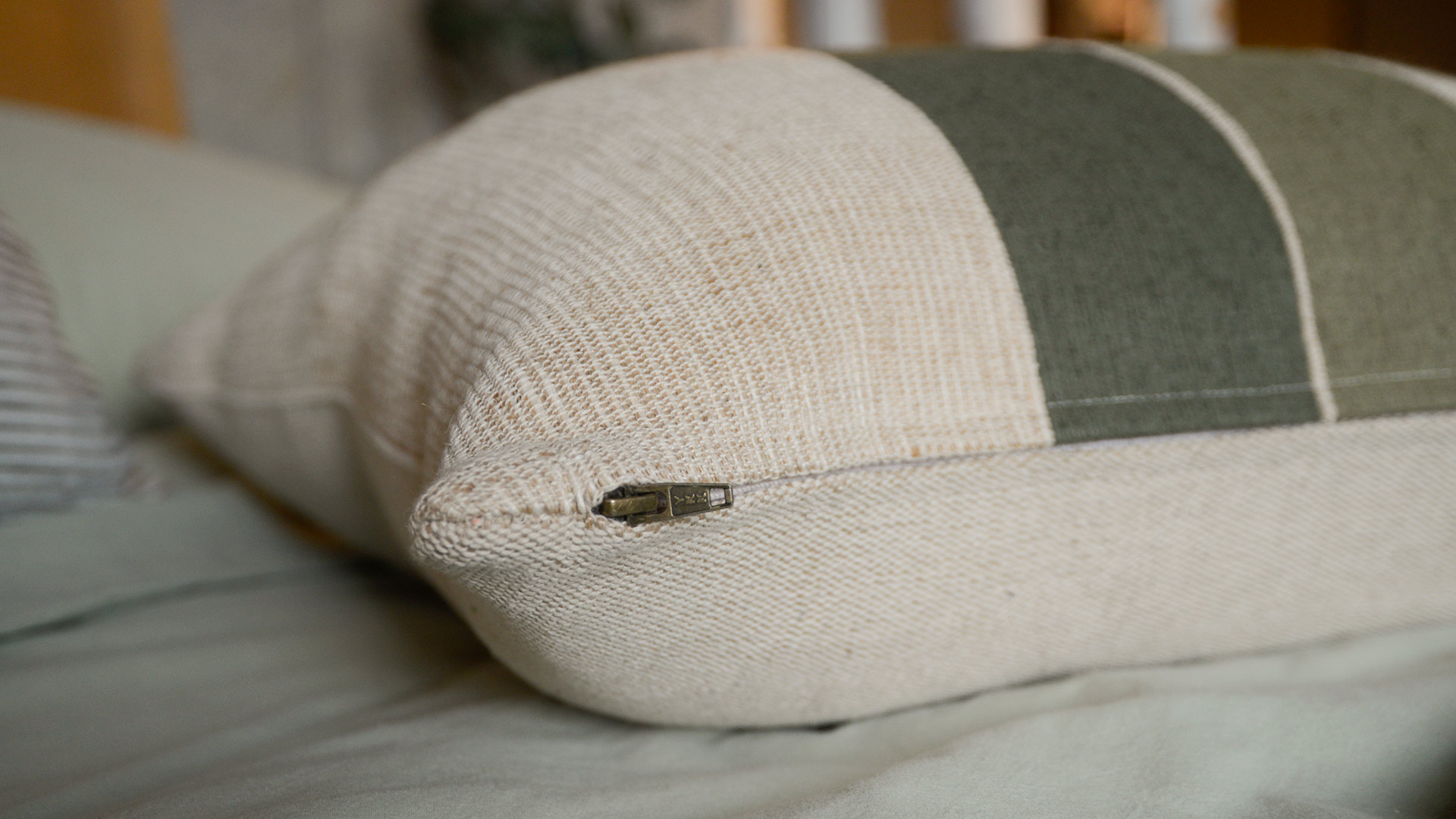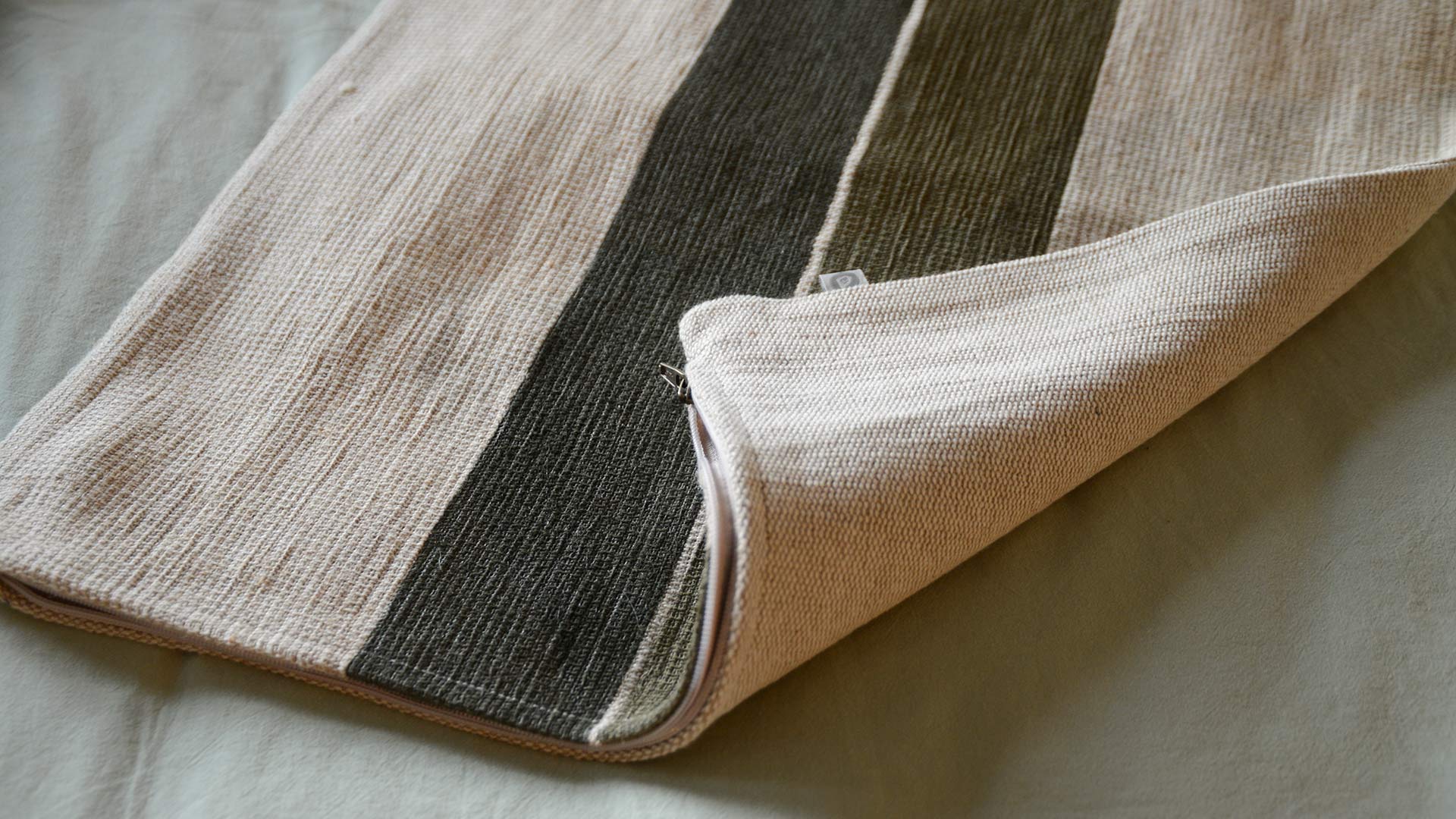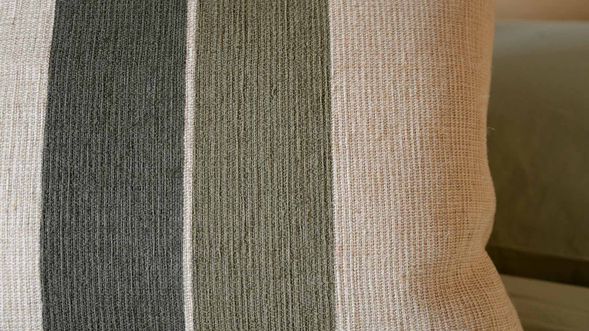 An eye-catching and modern green stripe cushion cover, made from a cotton & jute blend. This textured cushion cover is as comfy and tactile. In a neutral, sand-coloured background with two bold stripes to the front. For interest and intrigue, the stripes are in darker and lighter shades of olive green.