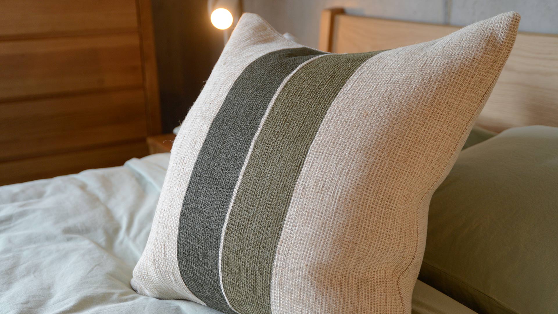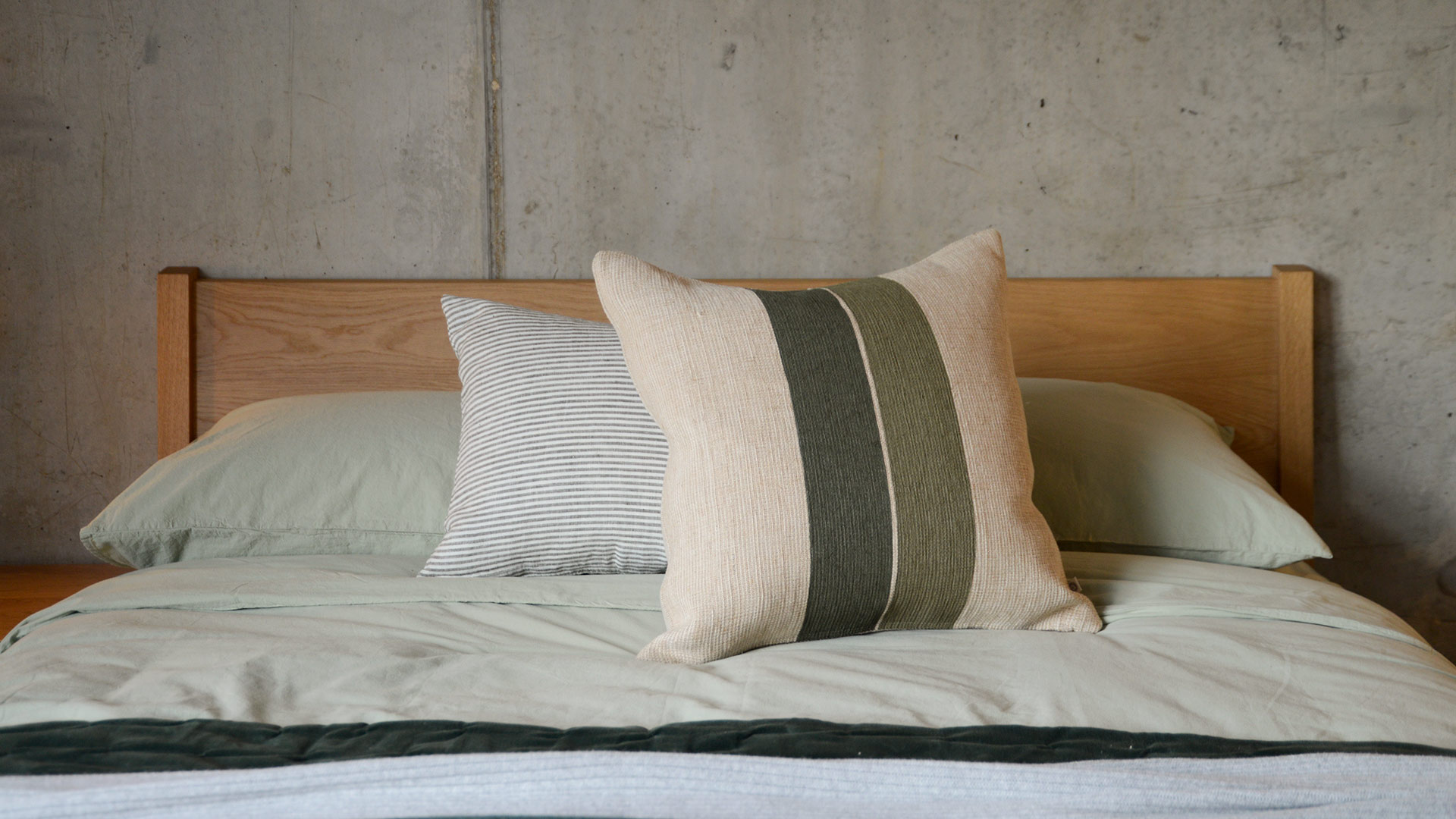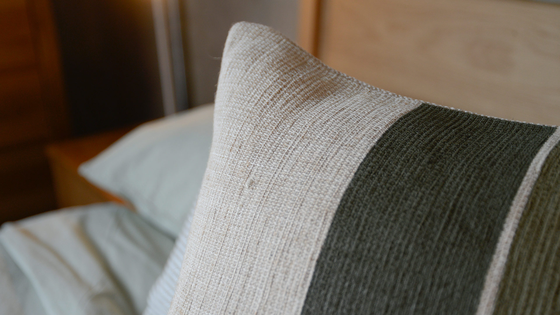 An eye-catching and modern green stripe cushion cover, made from a cotton & jute blend. This textured cushion cover is as comfy and tactile. In a neutral, sand-coloured background with two bold stripes to the front. For interest and intrigue, the stripes are in darker and lighter shades of olive green.
