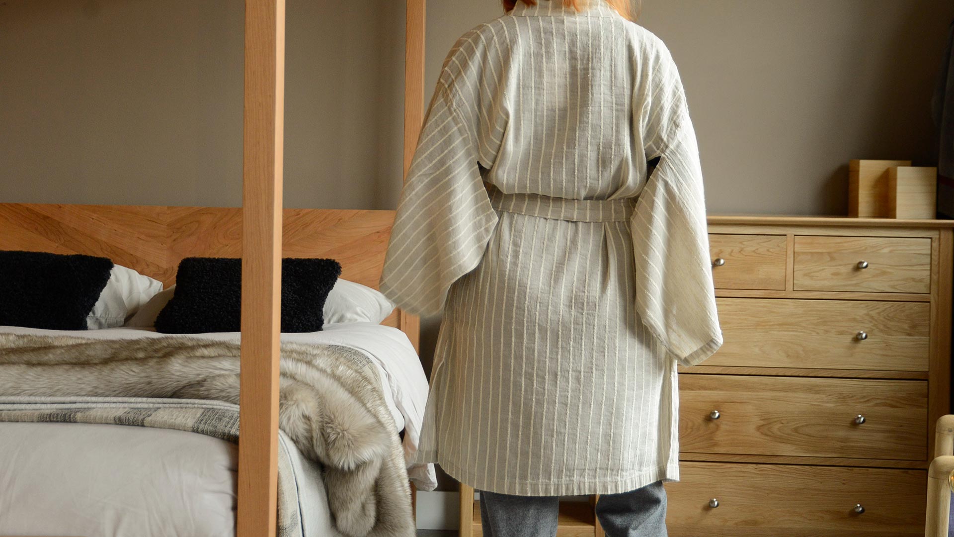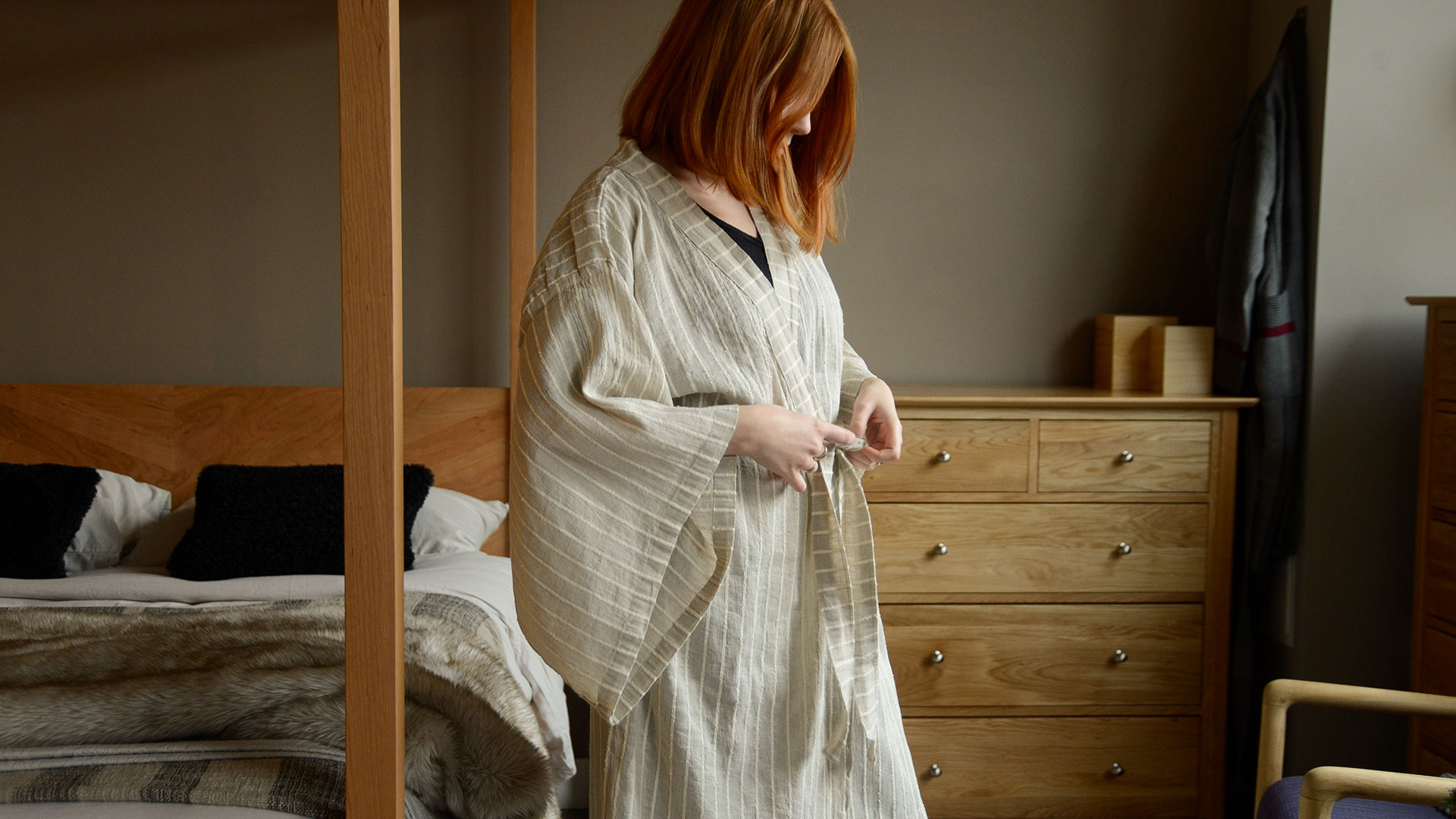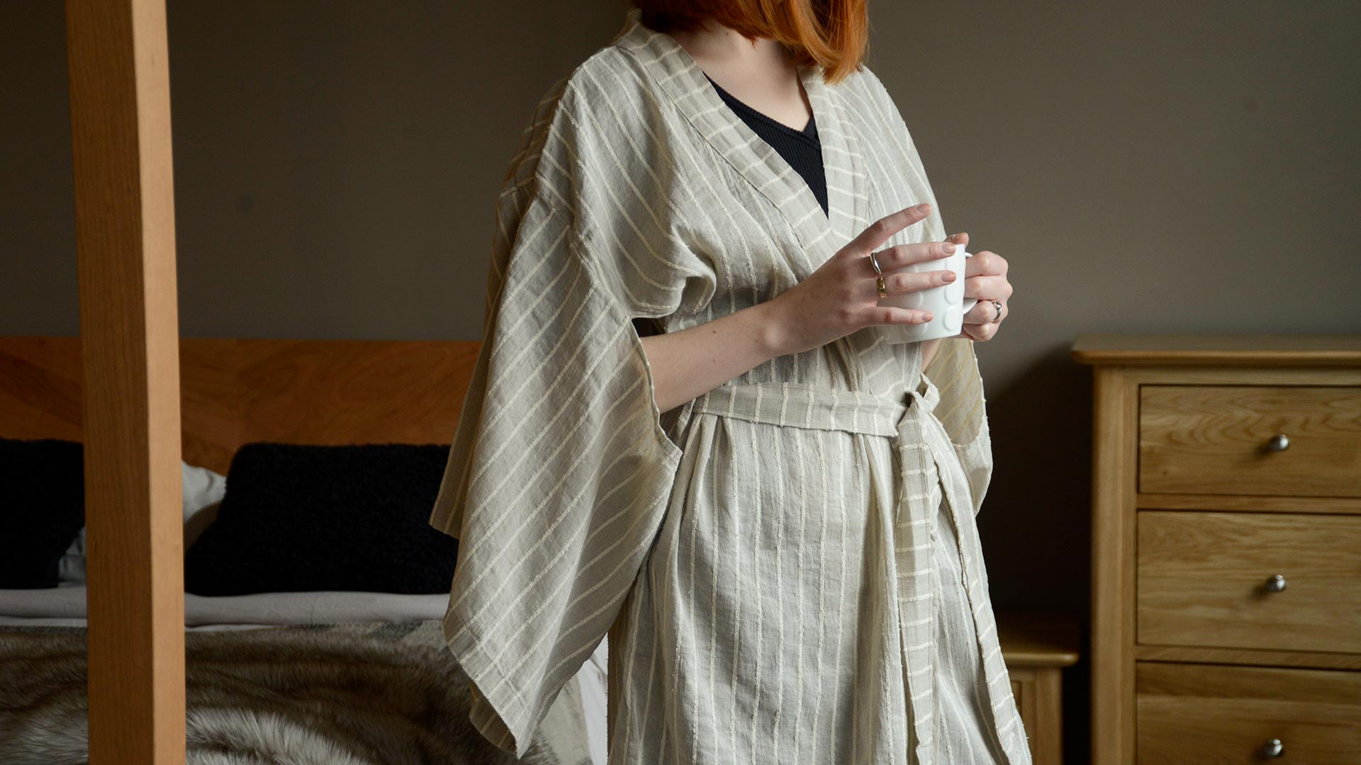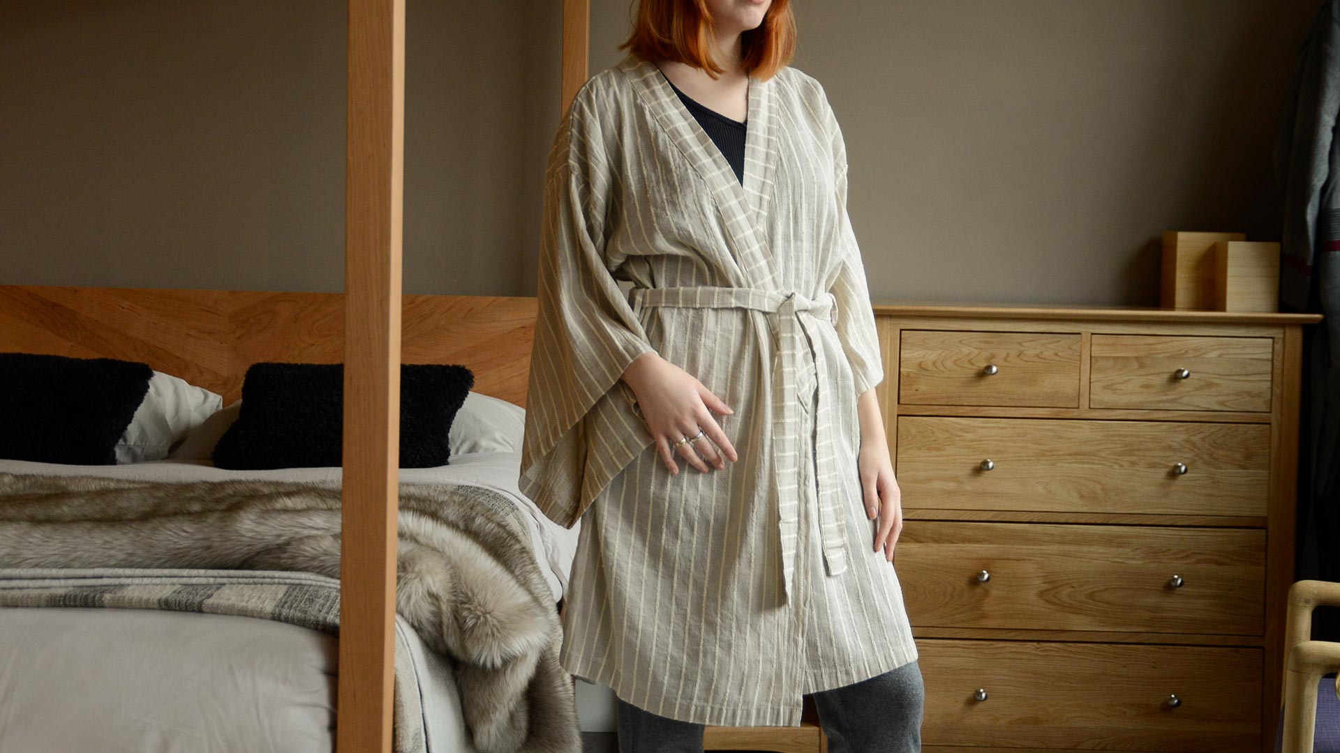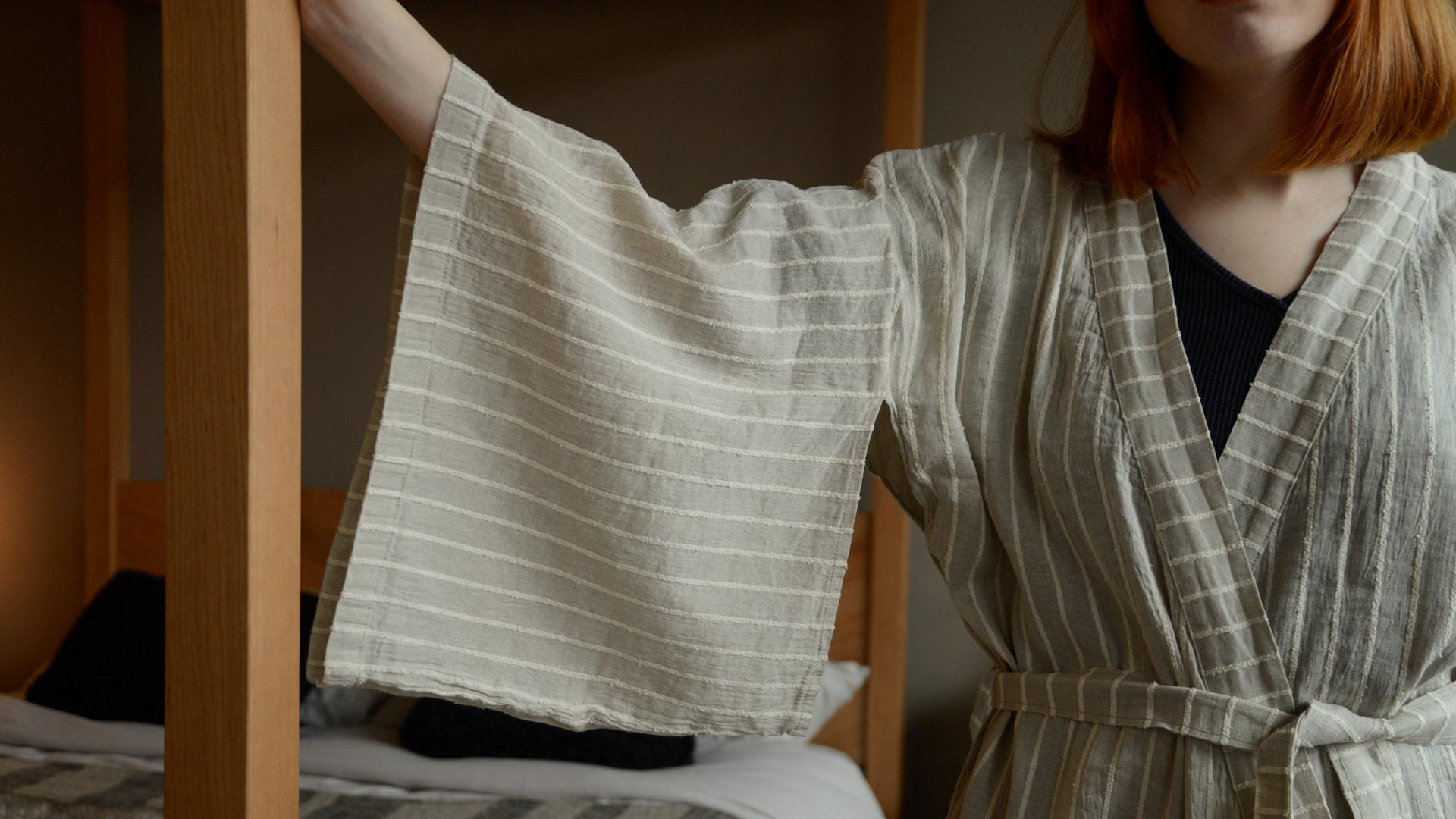 A traditionally crafted Kimono style robe made from a luxurious cotton and linen blend.
