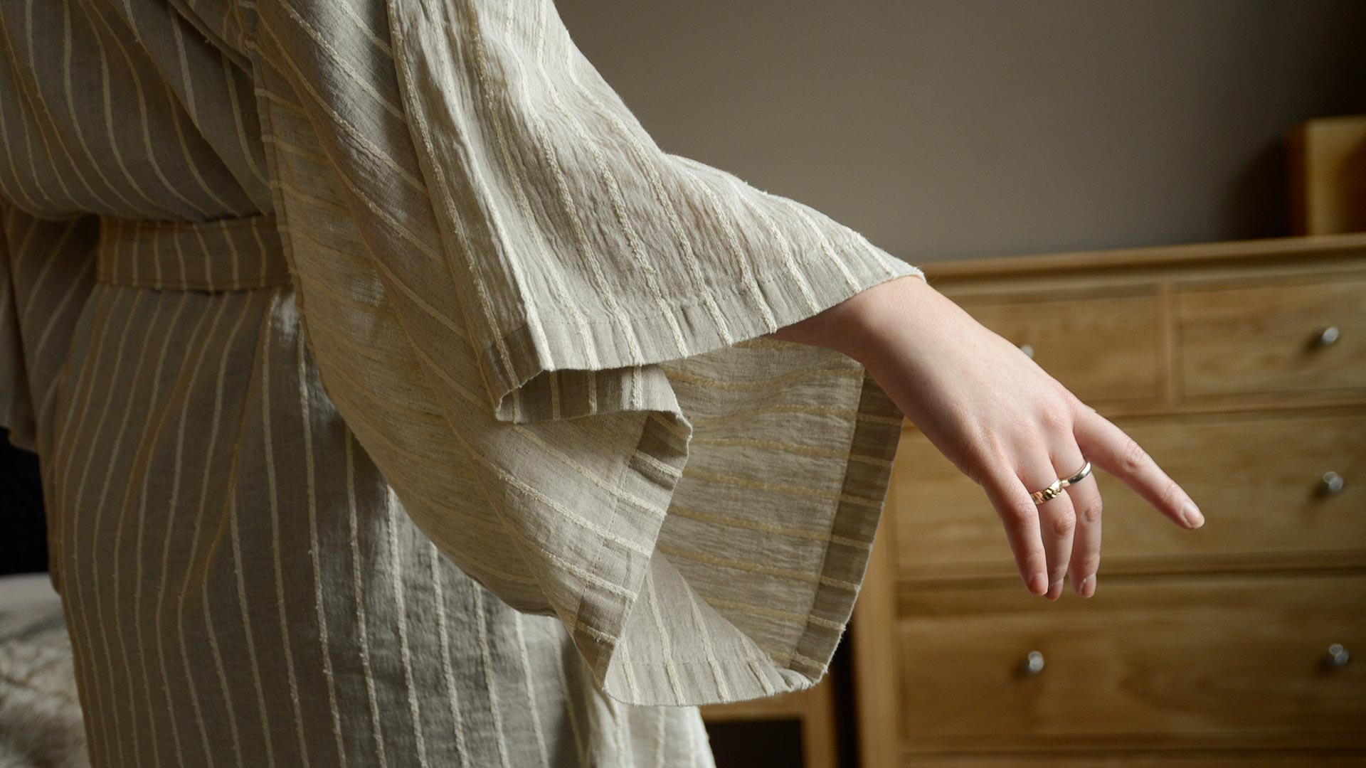 A lightweight linen and cotton blend robe, inspired by the traditional Kimono style. A timeless, light beige shade striped with ivory white. A gentle, relaxed look combined with the elegance of the traditional Kimono.