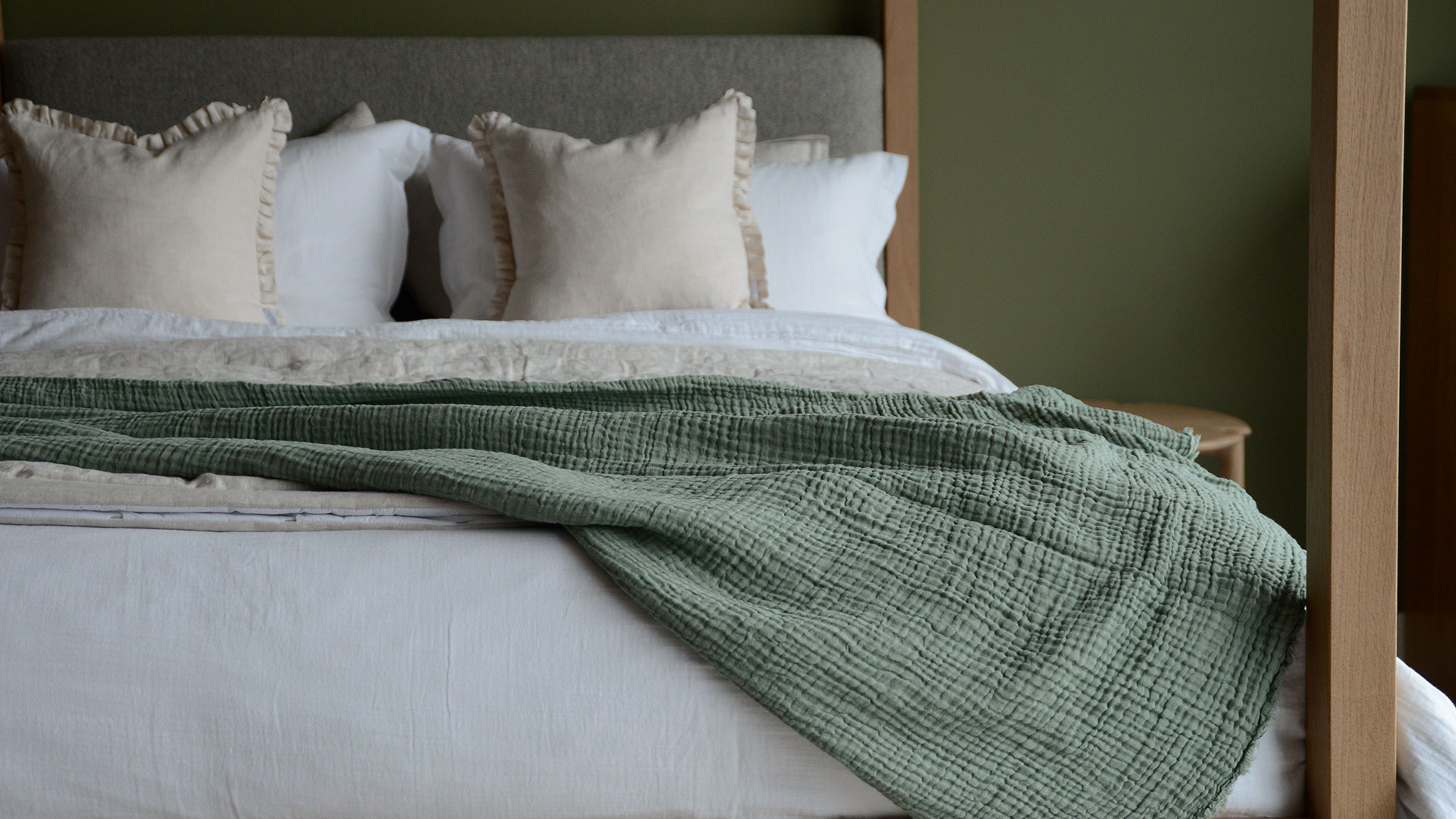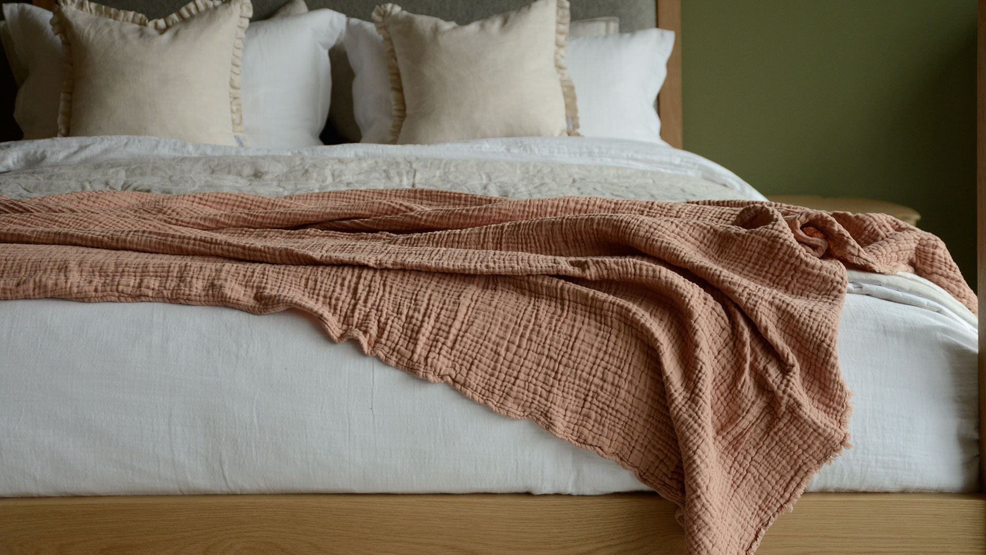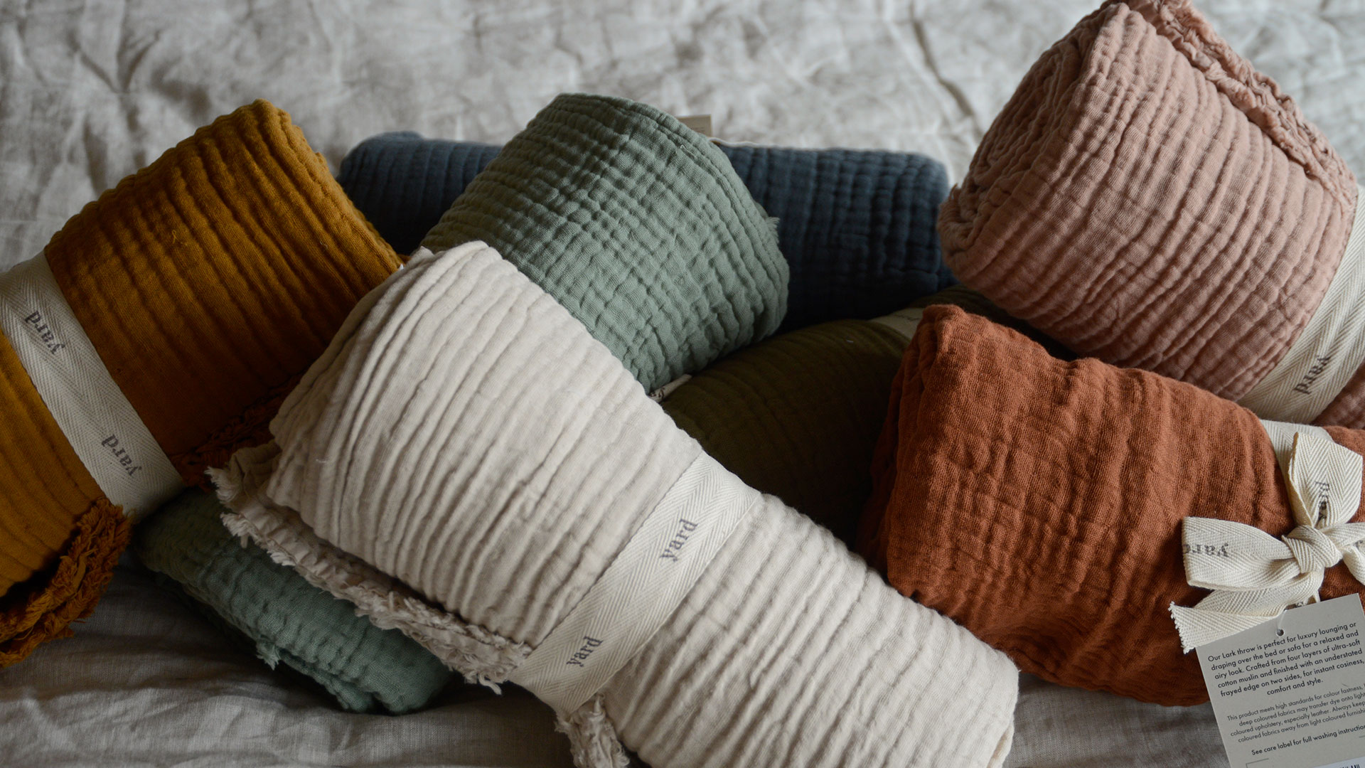 These throws are also crafted from four layers of soft cotton muslin, and available in a range of colours. You can also find larger versions of a selection of these colours as bedspreads, just here.