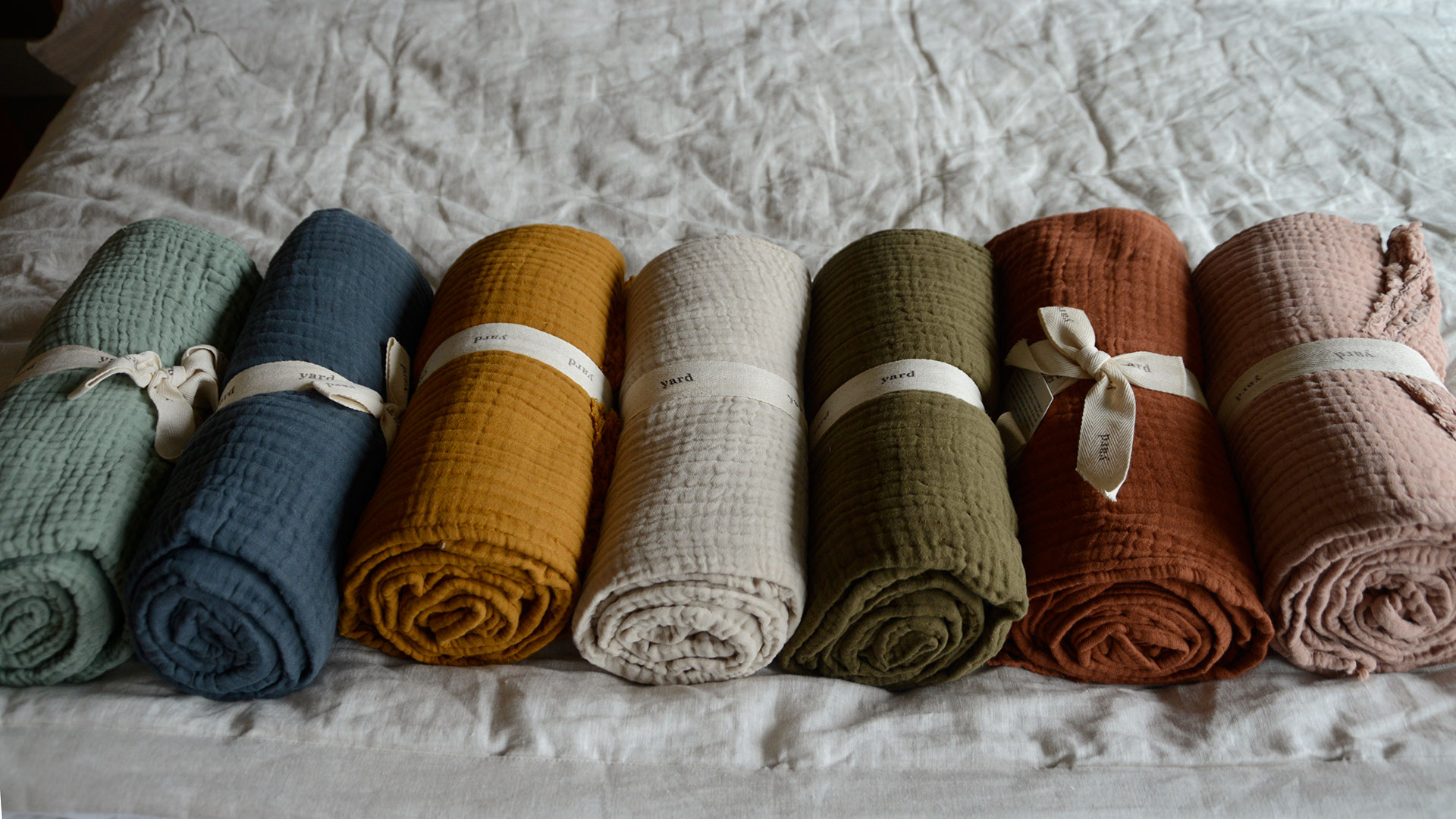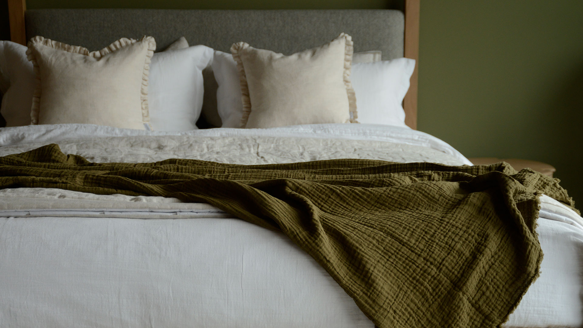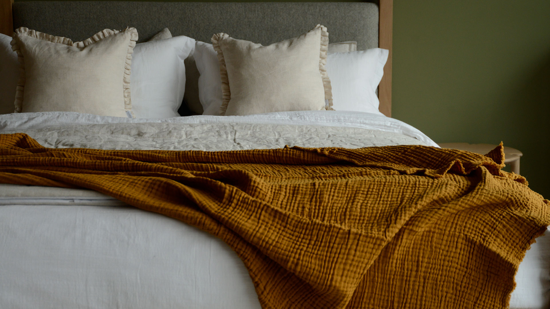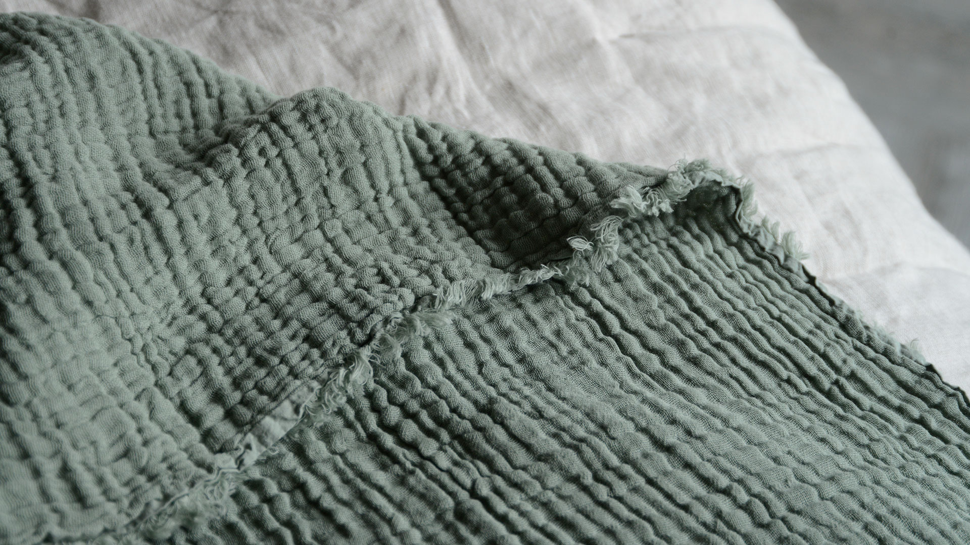 These throws are also crafted from four layers of soft cotton muslin, and available in a range of colours. You can also find larger versions of a selection of these colours as bedspreads, just here.