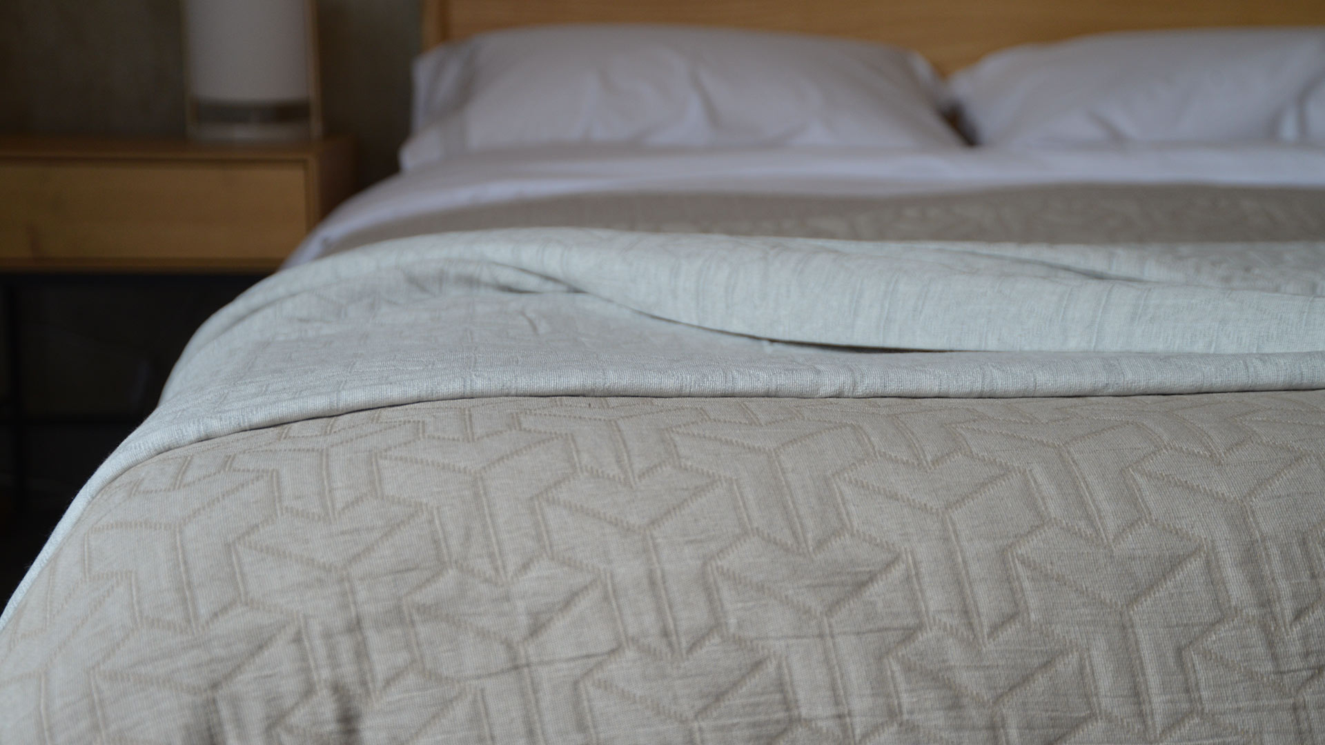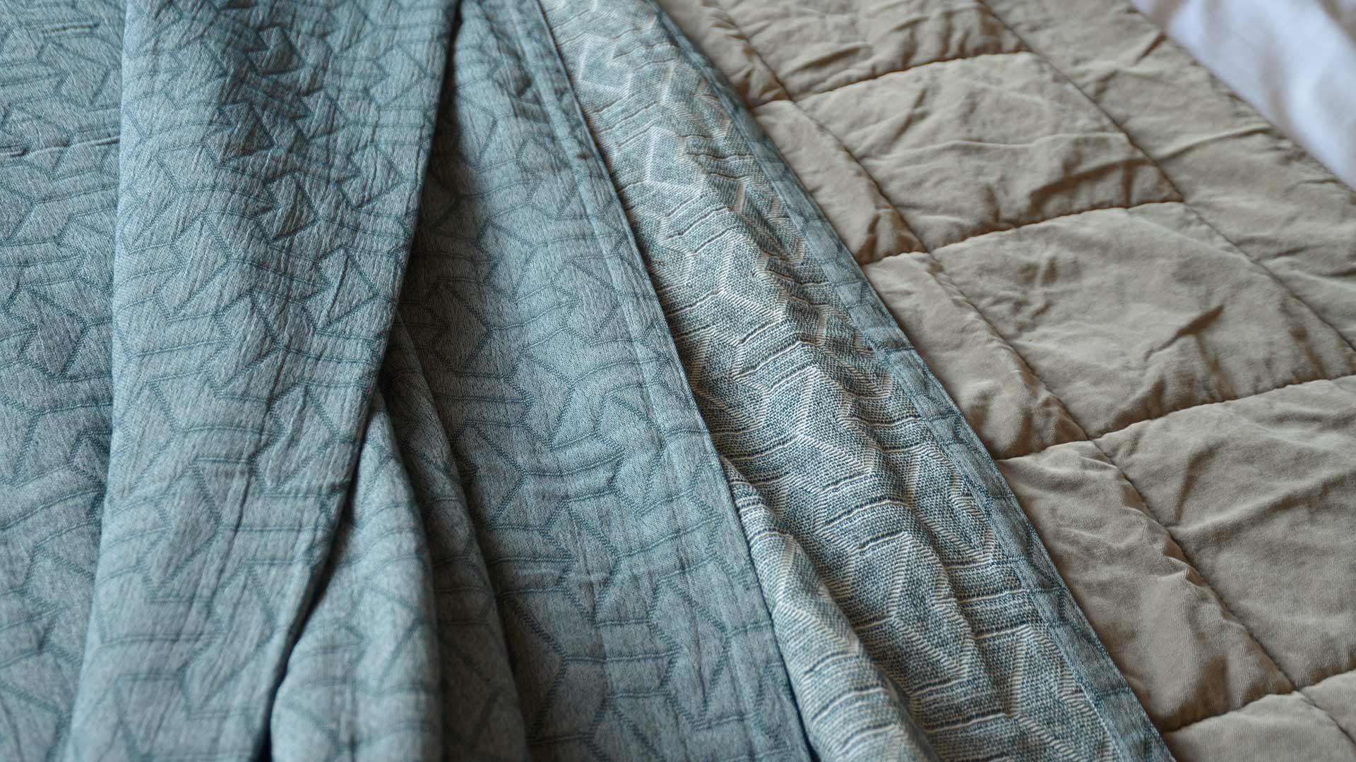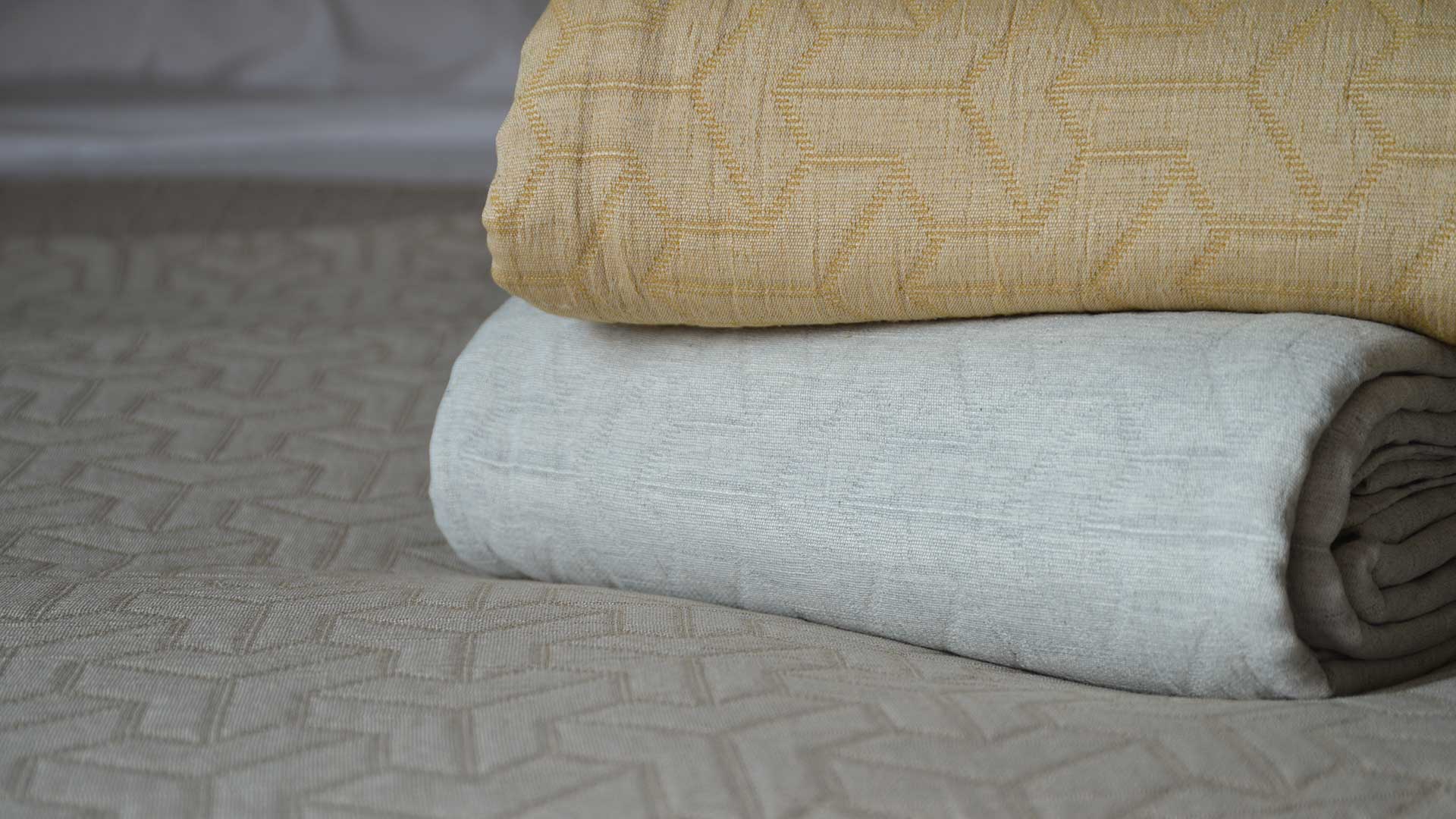 Contemporary, light-weight bedspreads with a textured, geometric pattern. These bed covers are available in three colours: antique gold, pale silver grey or taupe. These large, modern bedspreads are suitable for a double to super-king bed, depending on your bed height. Made with a blend of cotton, recycled cotton and polyester.