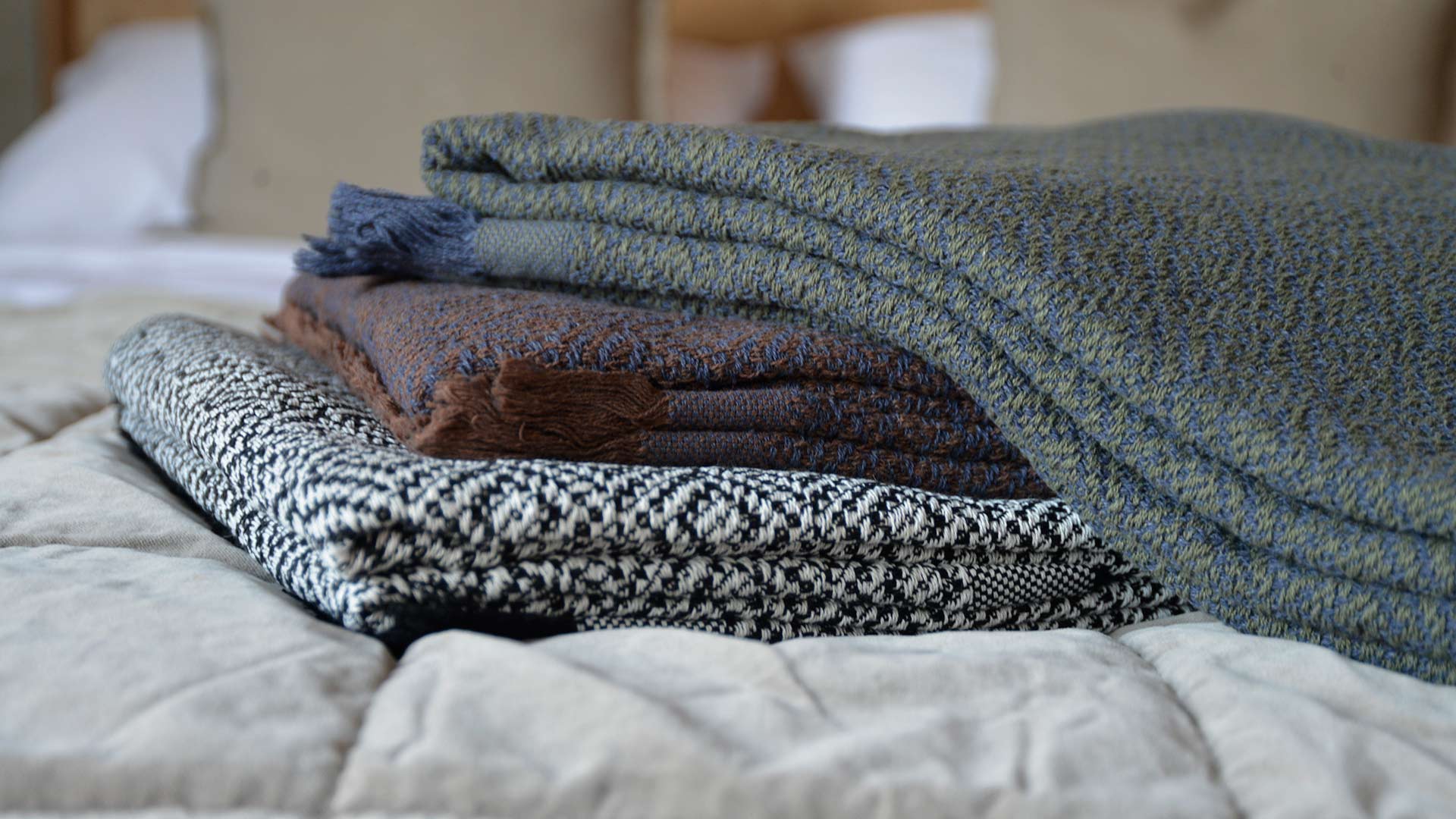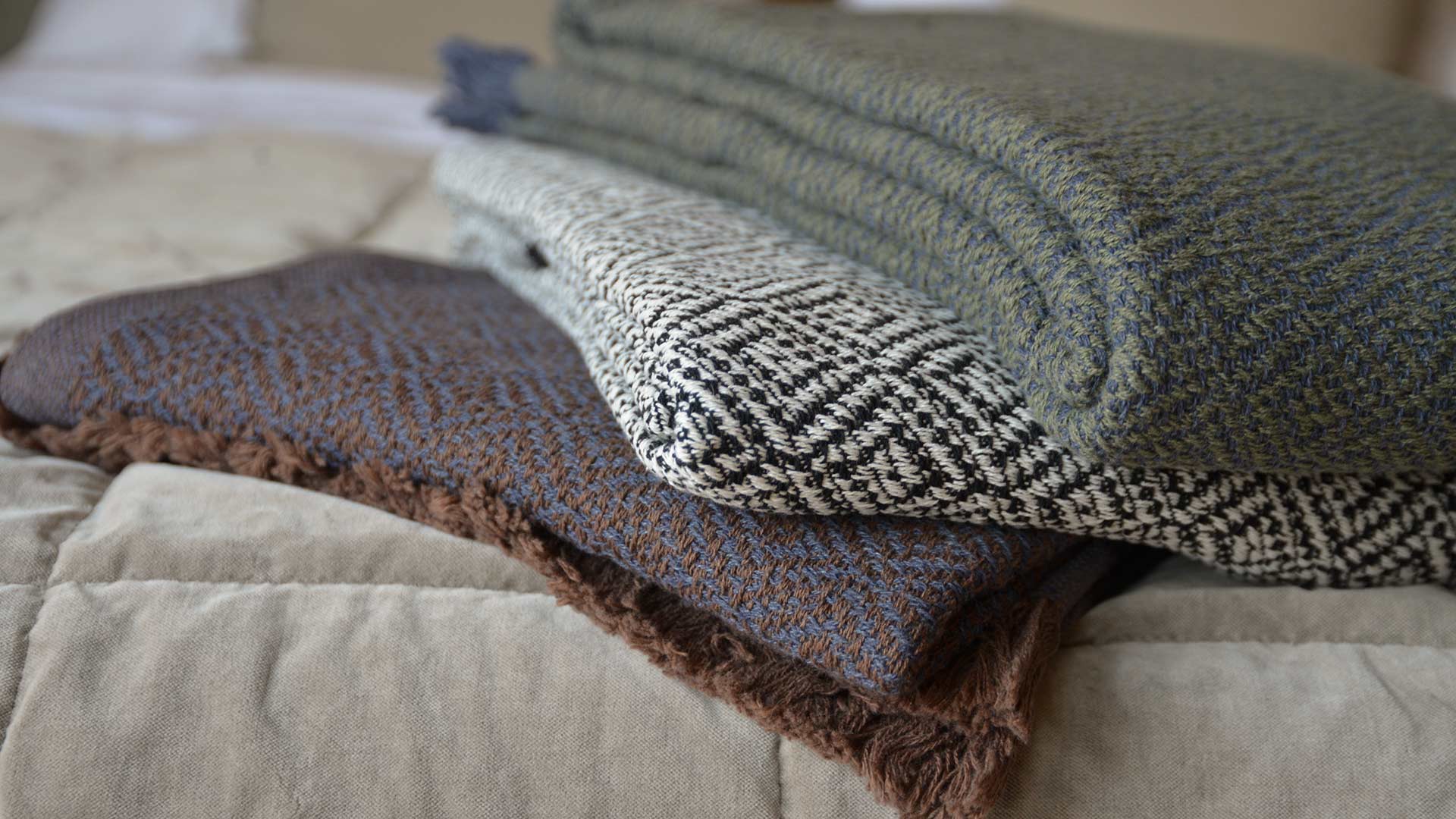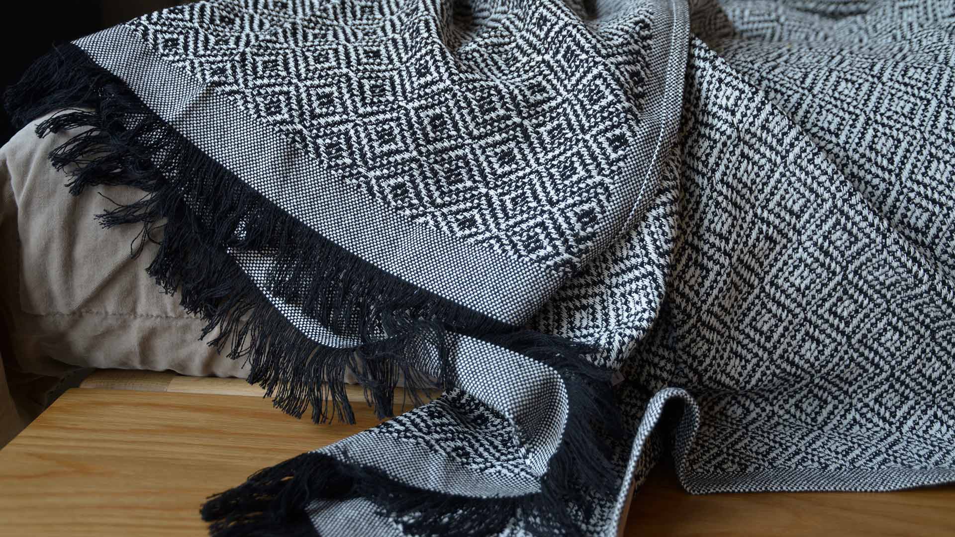 A collection of cotton-rich throws with an elaborate, repeated diamond pattern. In monochrome, russet and olive colourways.
