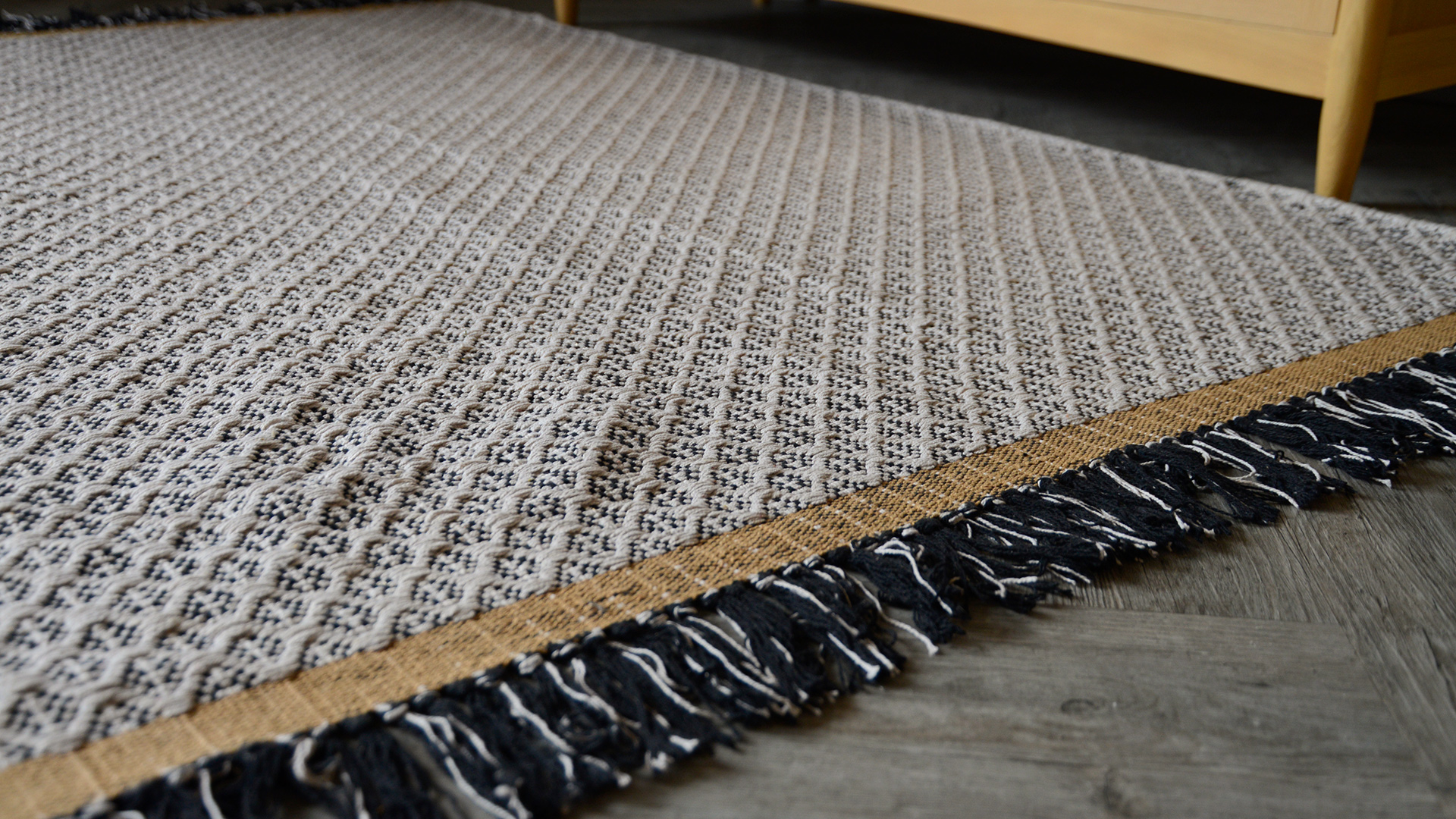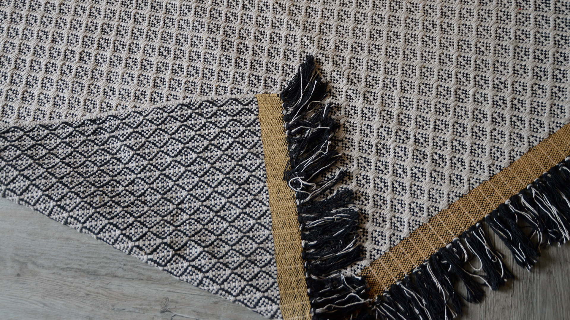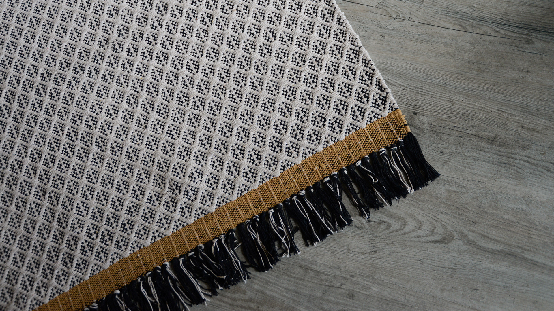 100% cotton woven rugs. Available in two colour-ways – choose from black or mustard to suit your space. Great for drawing the eye in a room or bringing natural tones to  existing colour schemes.