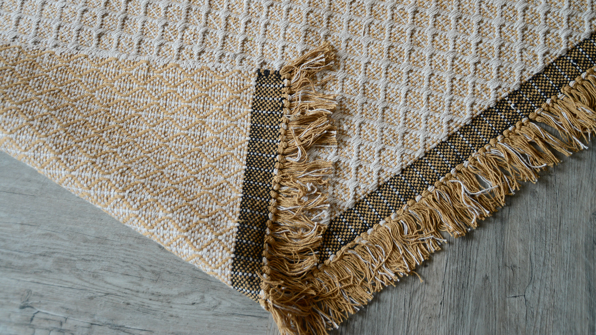Black:Â Black and ivory raised diamond pattern, with a mustard stripe along two edges. Finished off with a black fringe along two edges. Mustard:Â Mustard and ivory raised diamond pattern, with a black stripe along two edges. Finished off with a black and mustard fringe along two edges.