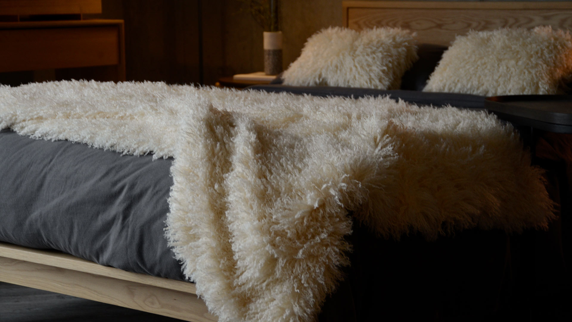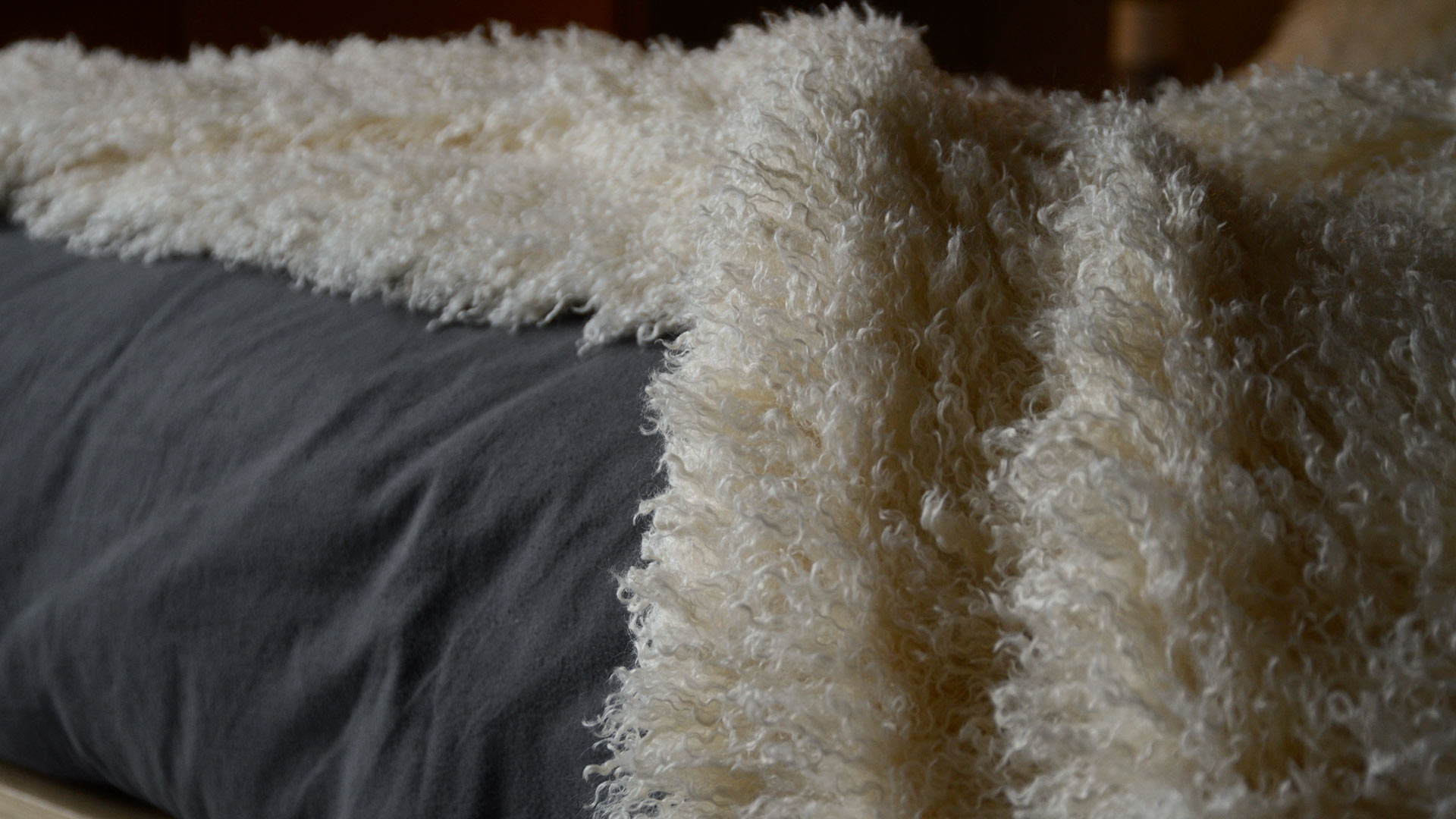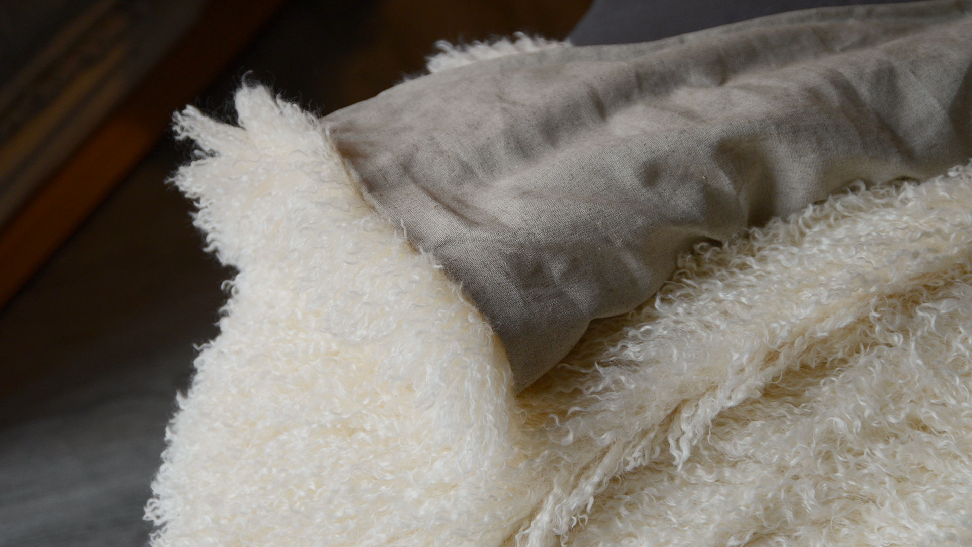 A new, cosy faux fur throw in pale cream, ‘curly’ Afghan faux fur with a deep pile. This ‘fur’ is incredibly soft! The reverse is in a light linen colour fabric.