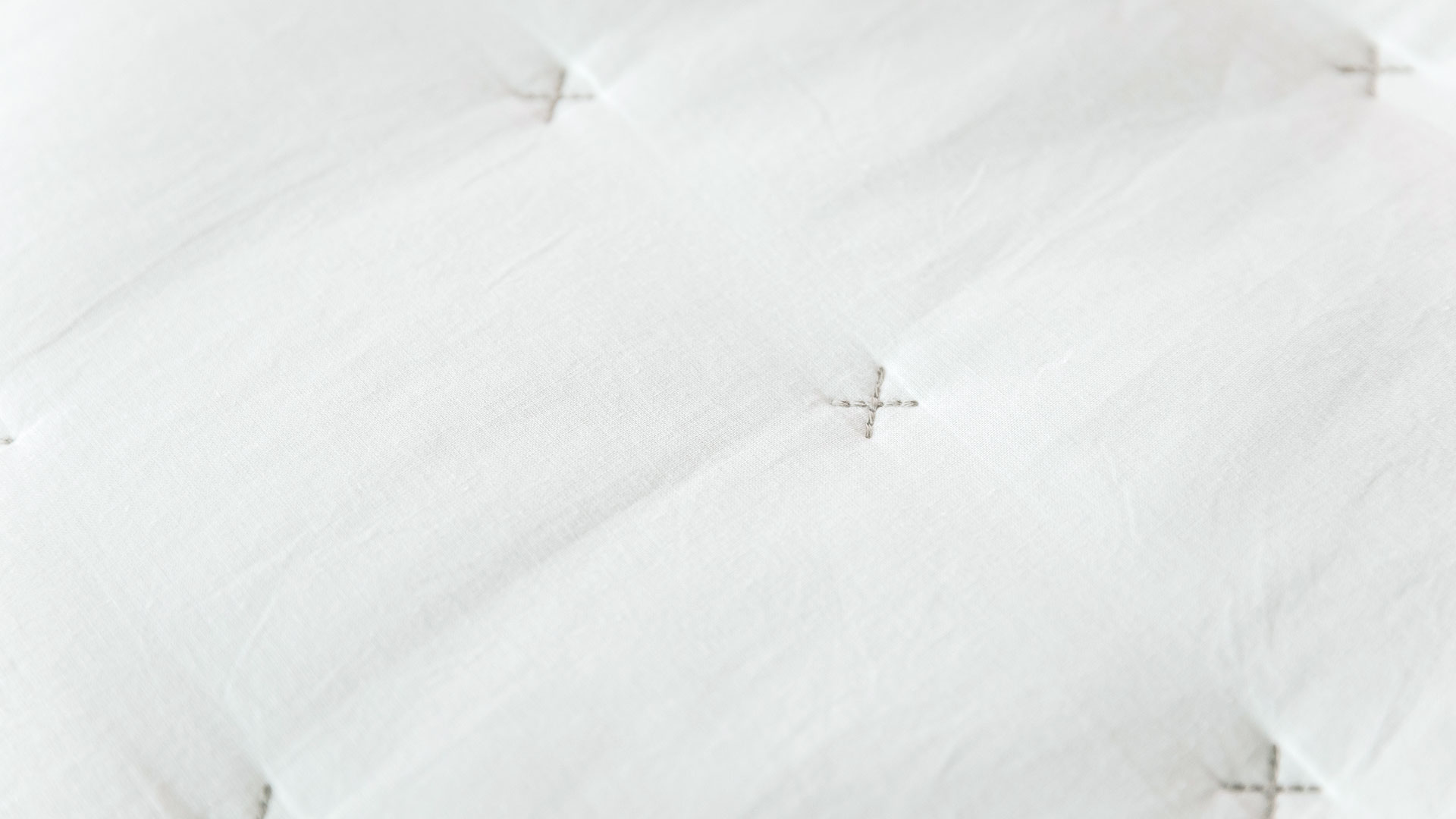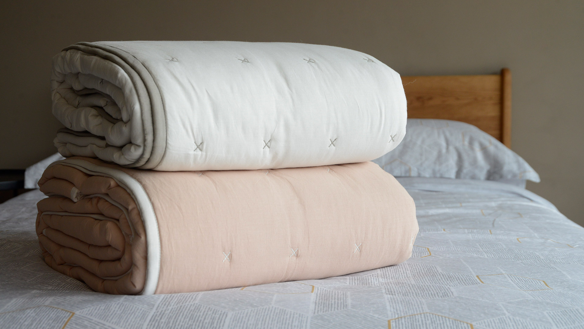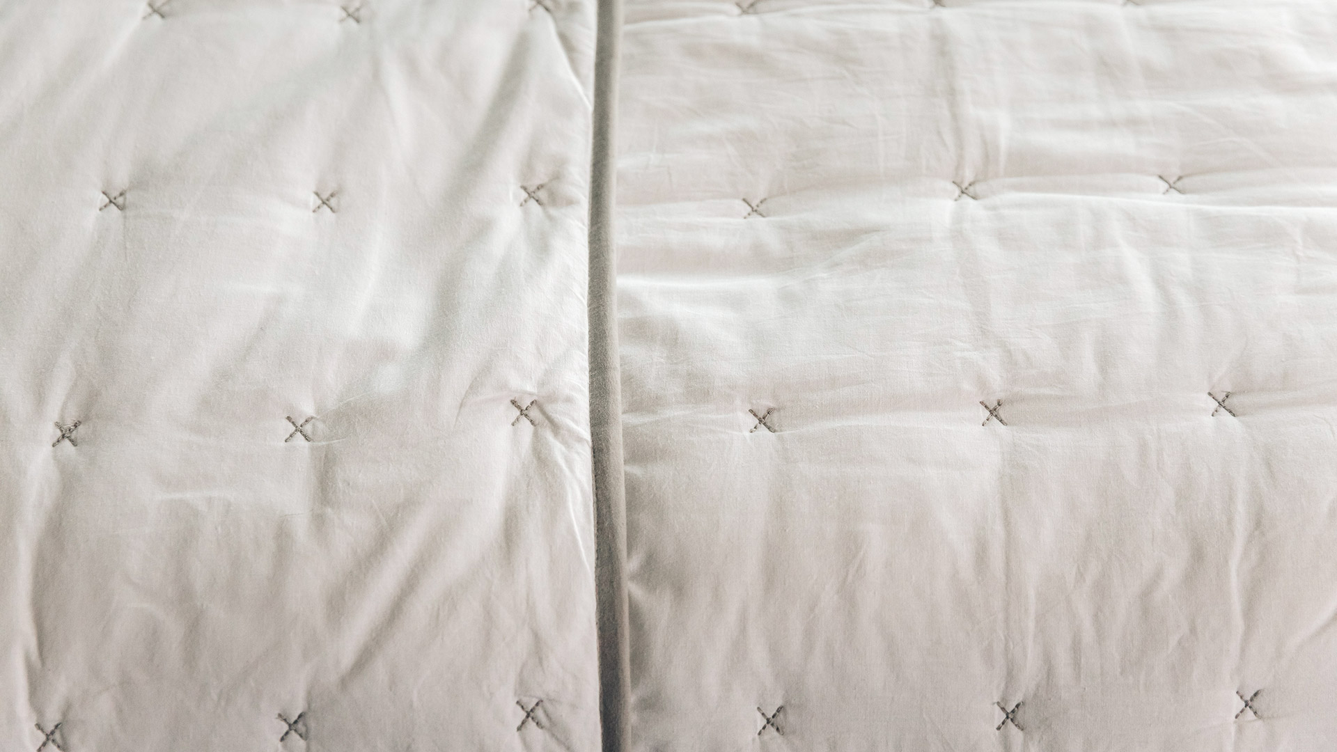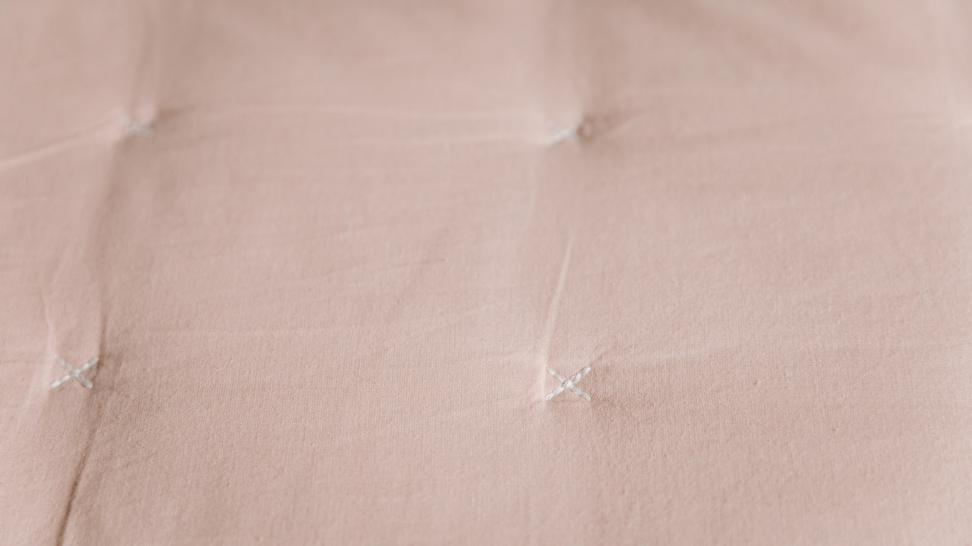 Pink & White – pale, peachy, blush-pink quilt with white cross stitches and white piping to the edges White & Grey – soft, warm-white quilt with grey cross stitches and grey piping to the edges