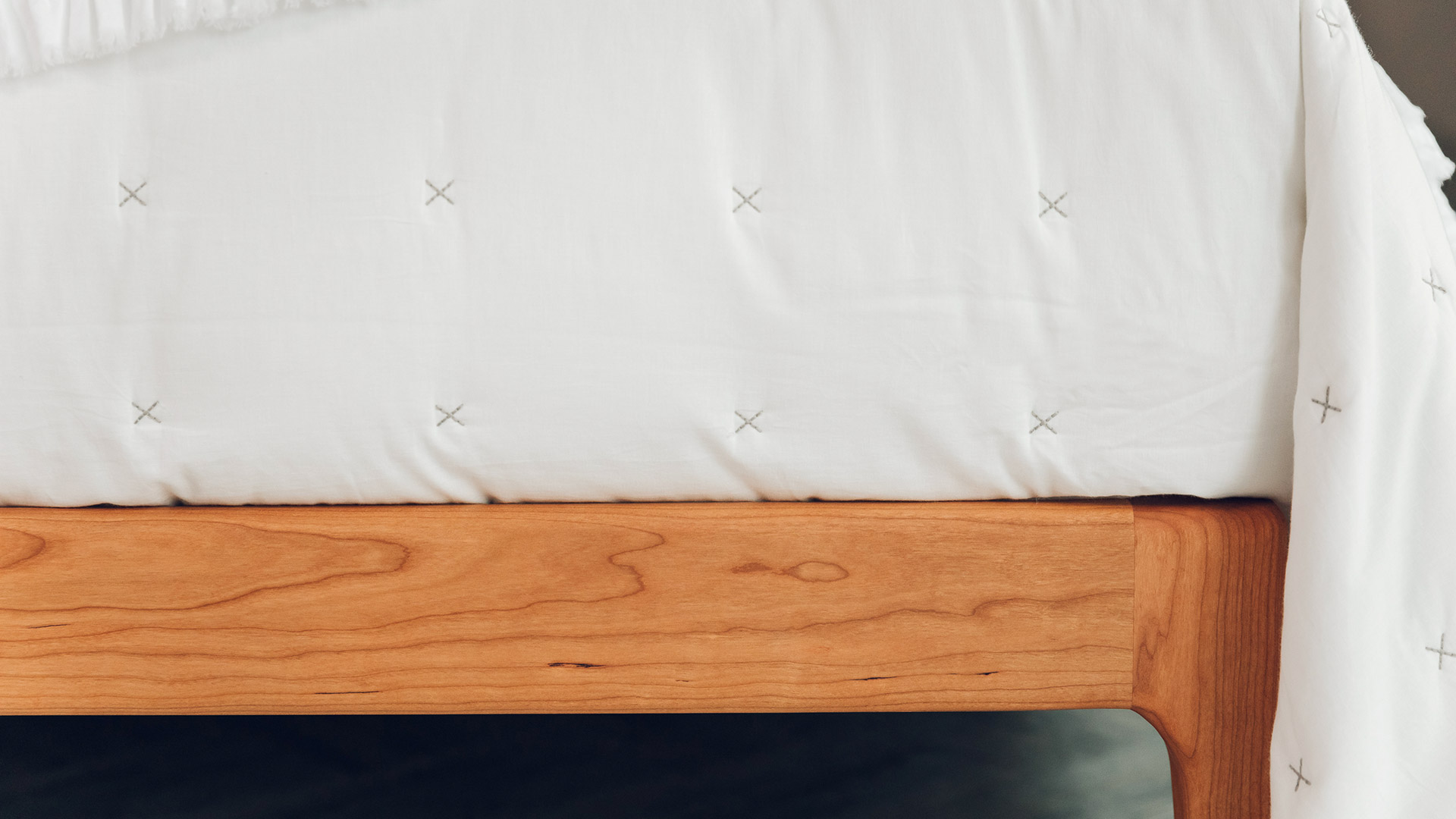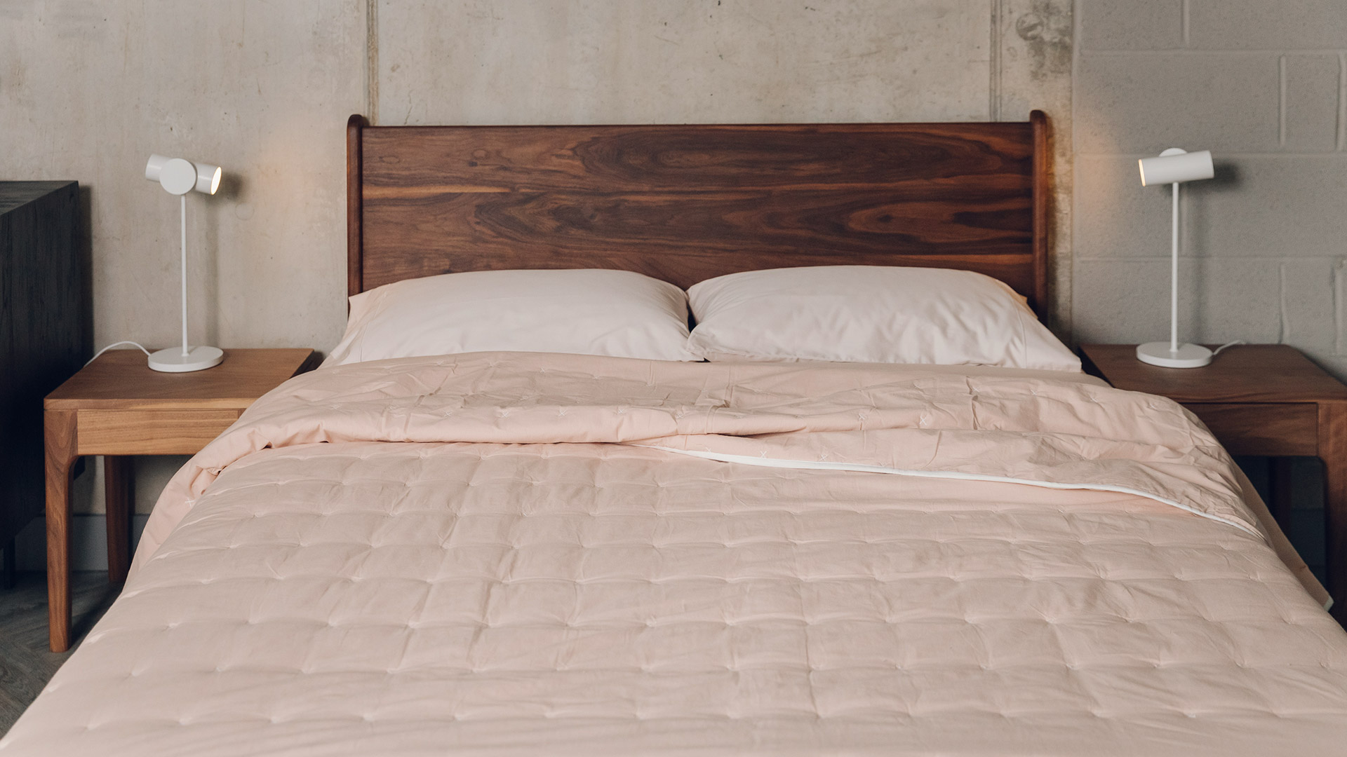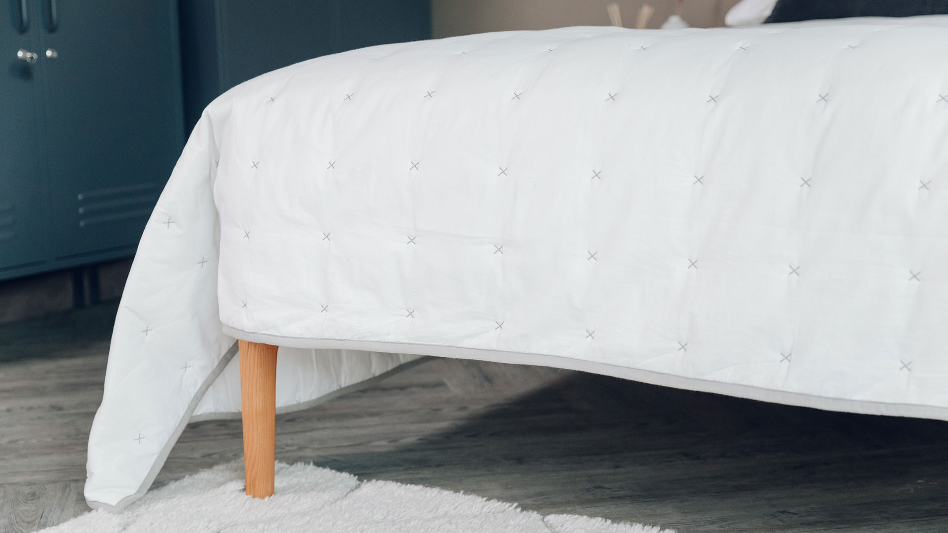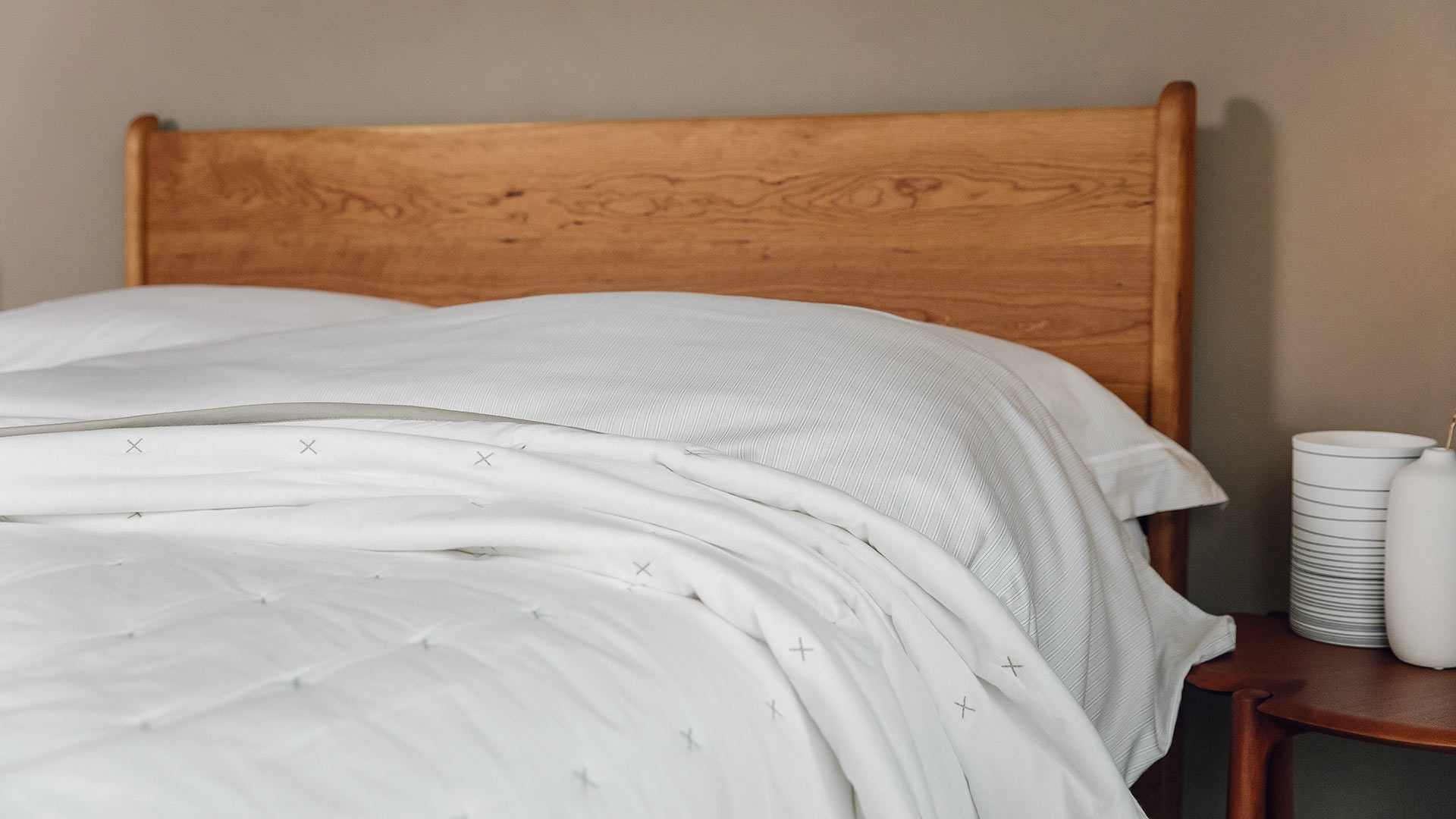 Pink & White – pale, peachy, blush-pink quilt with white cross stitches and white piping to the edges White & Grey – soft, warm-white quilt with grey cross stitches and grey piping to the edges
