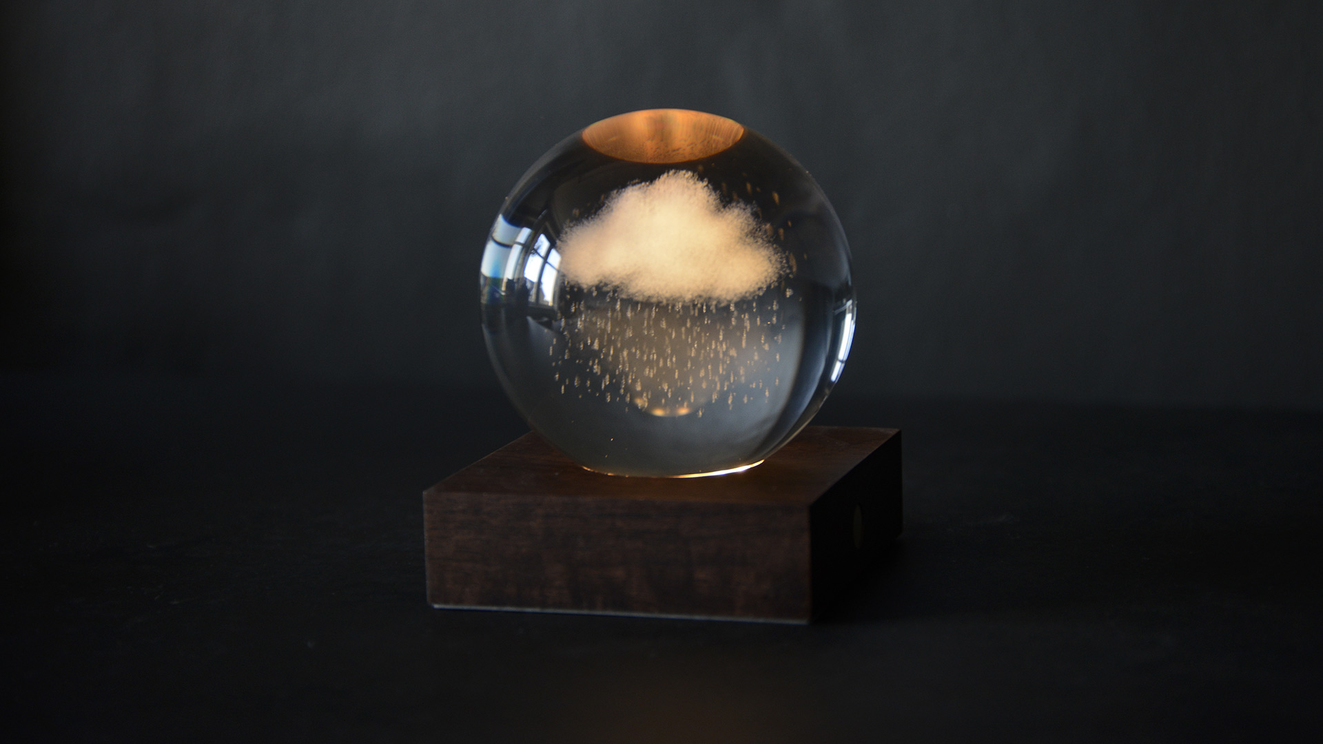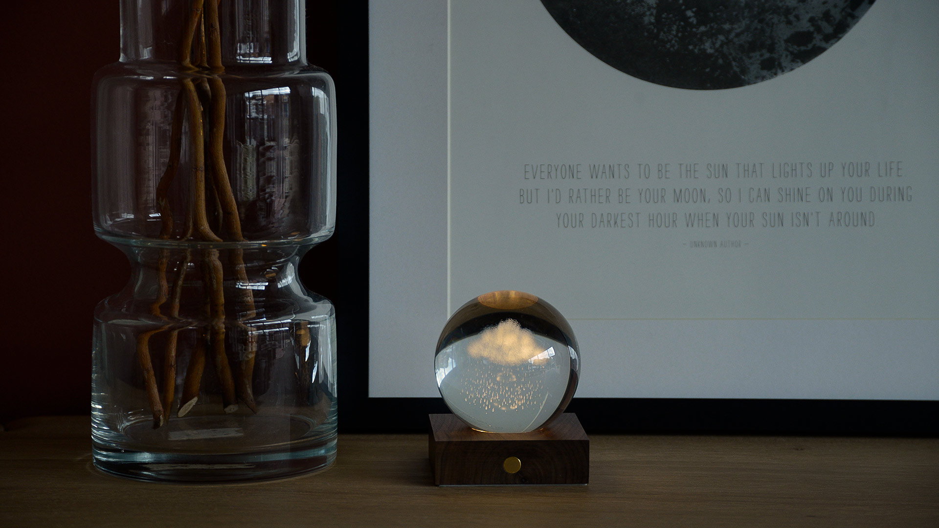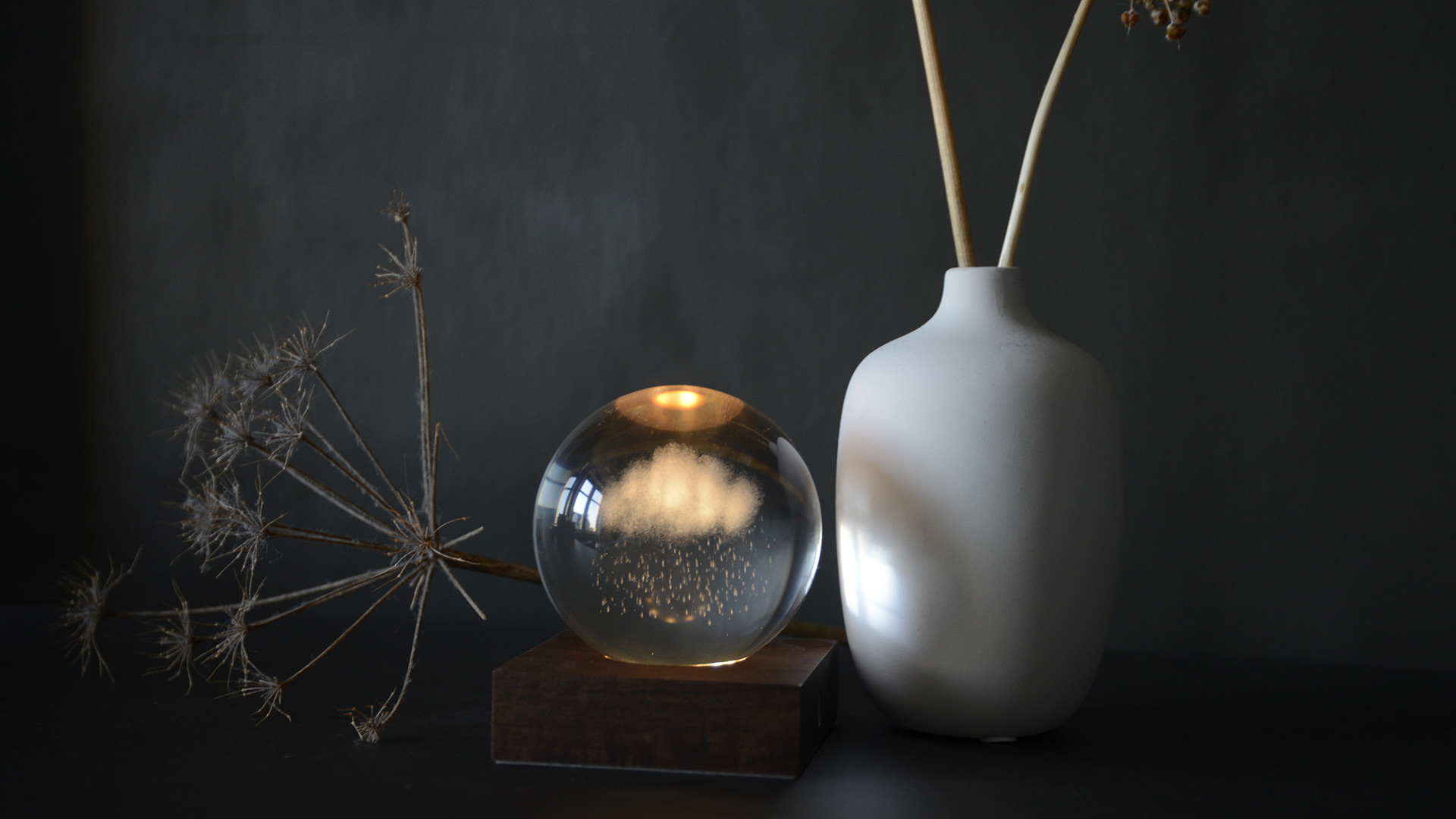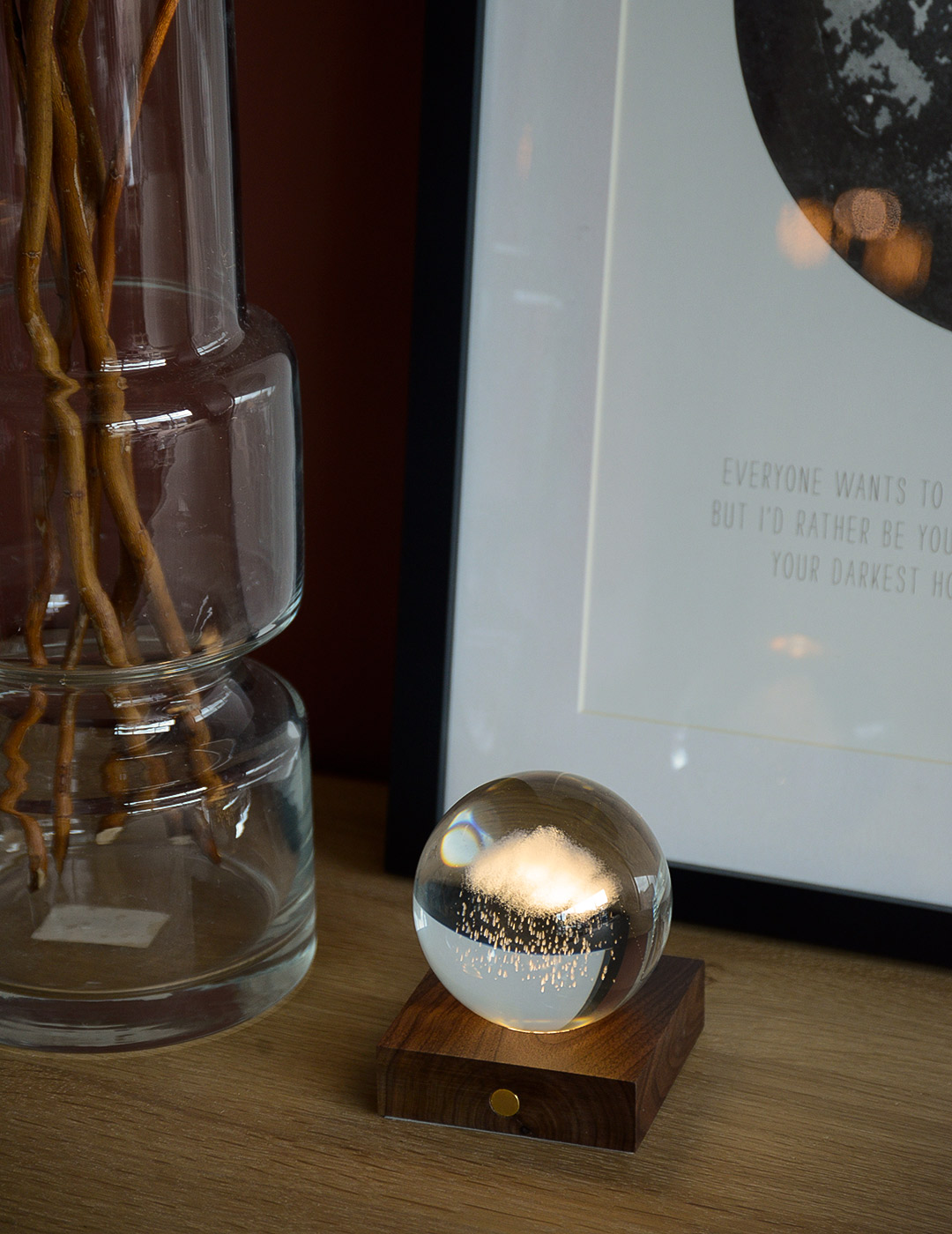 An atmospheric crystal ball light with moody raincloud design. Add visual interest and a subtle glow to your desk, shelf or mantelpiece. This item would make a beautiful gift!