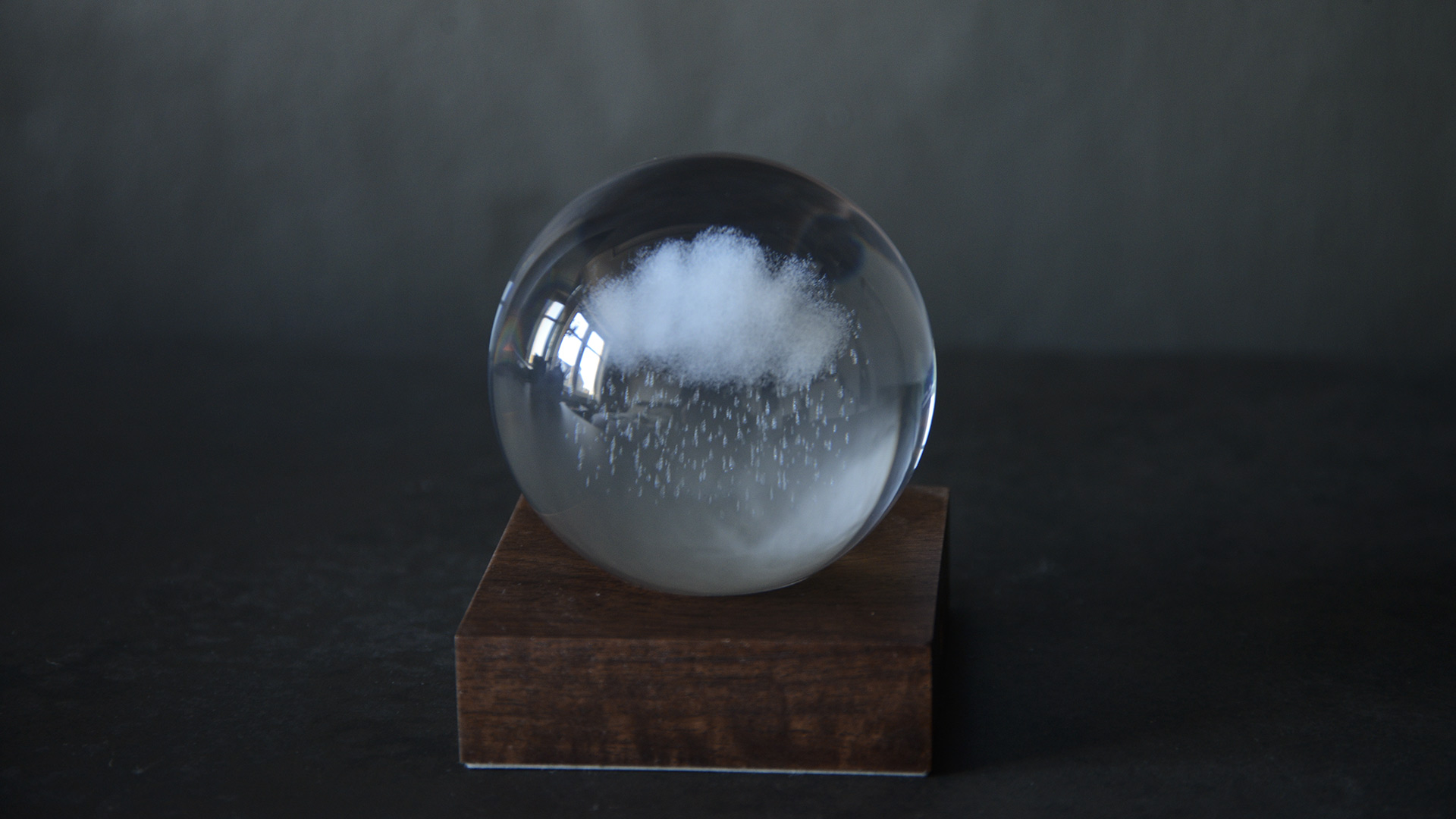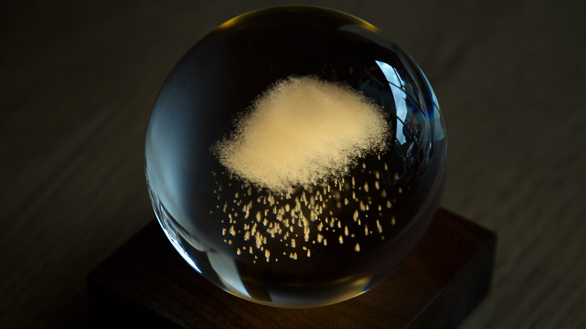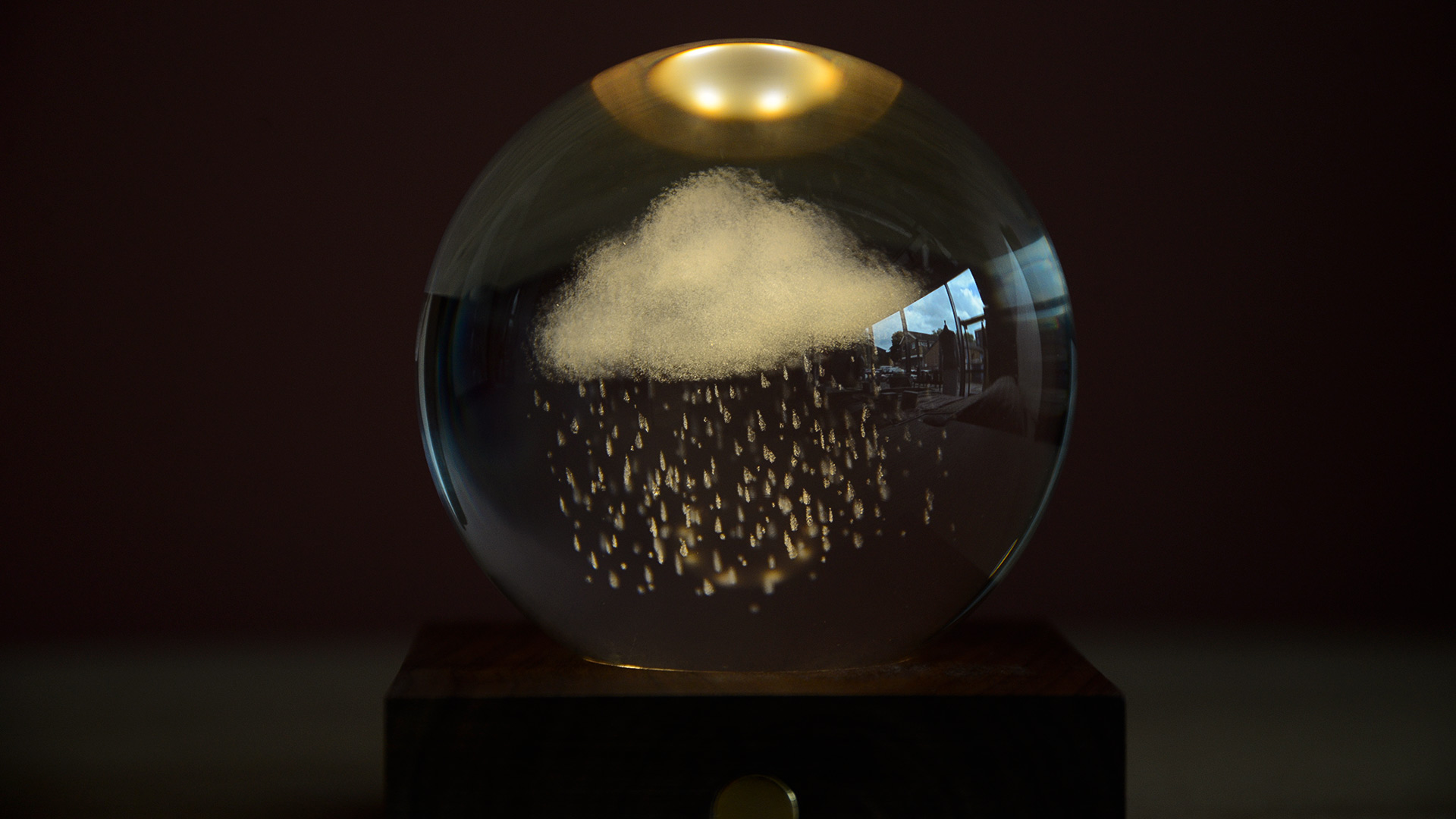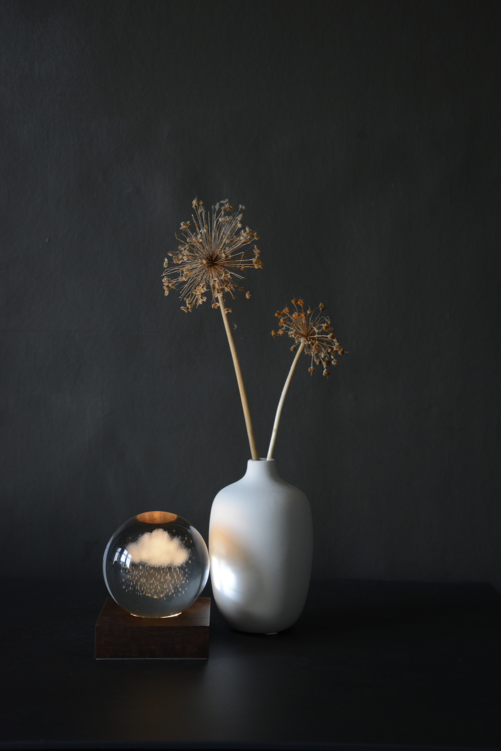 An atmospheric crystal ball light with moody raincloud design. Add visual interest and a subtle glow to your desk, shelf or mantelpiece. This item would make a beautiful gift!