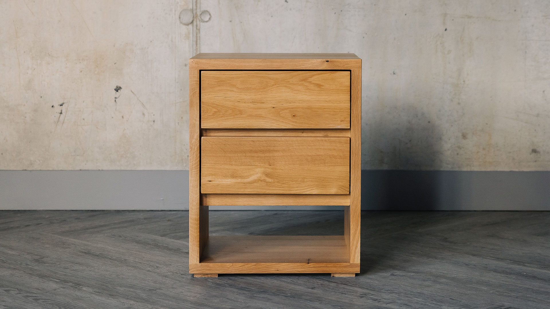 This stylish and compact bedside drawer table is made in oak and now has a coating of clear lacquer in a soft, matte finish. Please note previous batches from this range had a soft satin finish. Exclusive to Natural Bed Company – the Cube Bedside Table with Two Drawers is part of our Black Lotus Collection of contemporary, oak bedroom storage. This unit has two slim drawers and a low shelf – a useful storage unit that takes up very little floor space – it is ideal for smaller bedrooms.