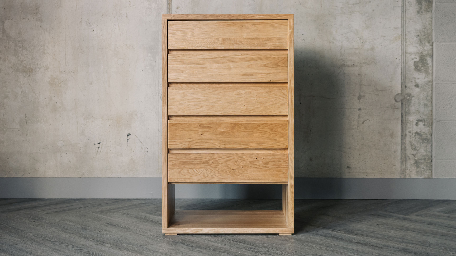 This large, cube style solid oak tallboy is a contemporary storage unit with a modern style. A particularly useful, tall chest of drawers made using natural oak. This cube style chest boasts five large, wide drawers and a low shelf below as part of the frame. The ideal storage solution for your bedroom.