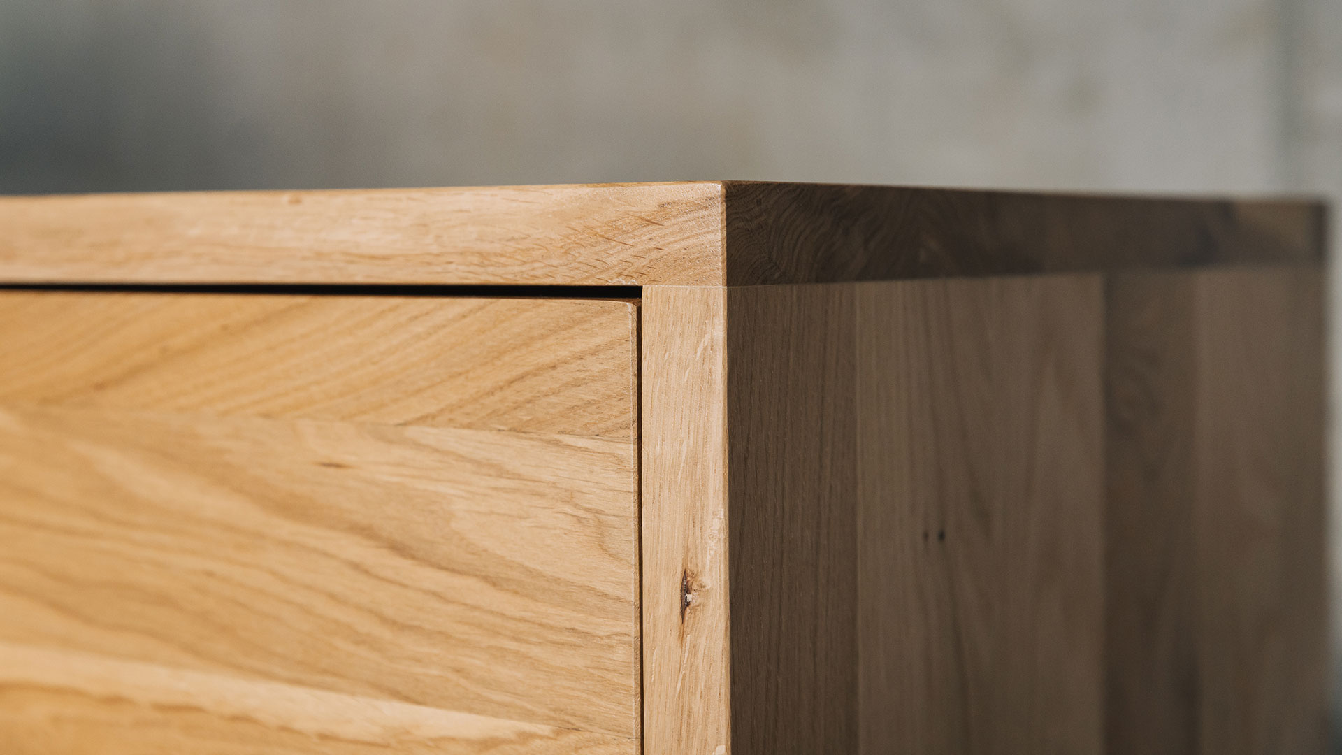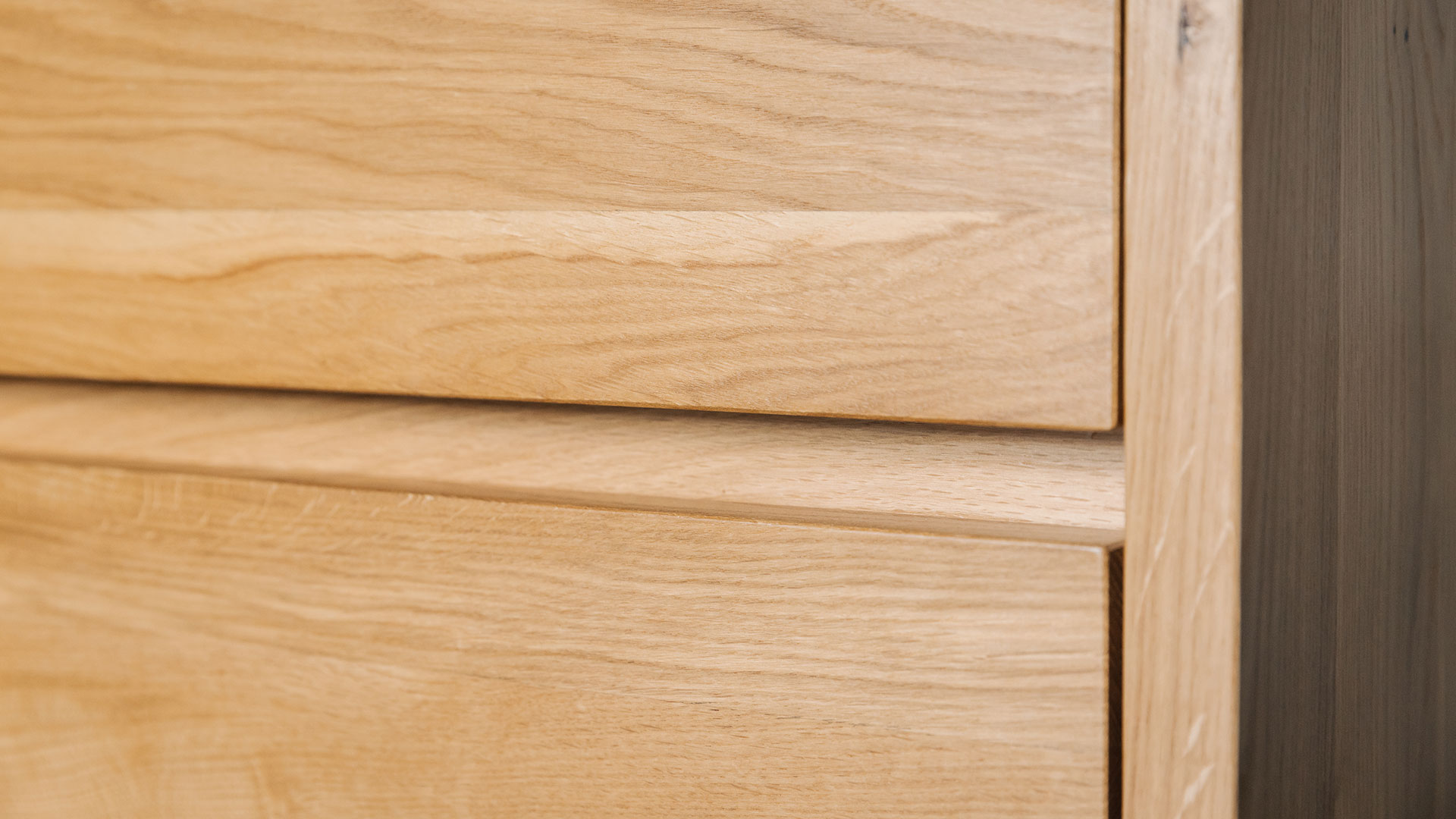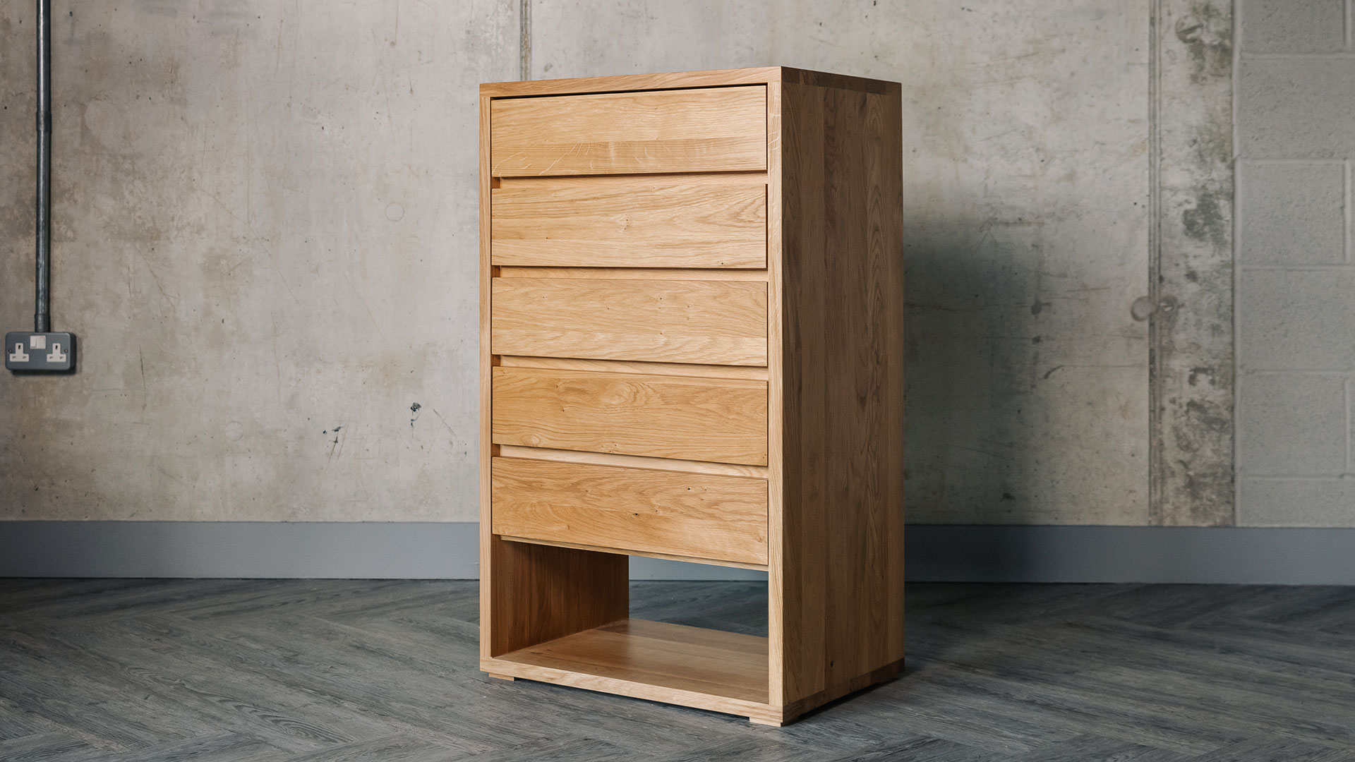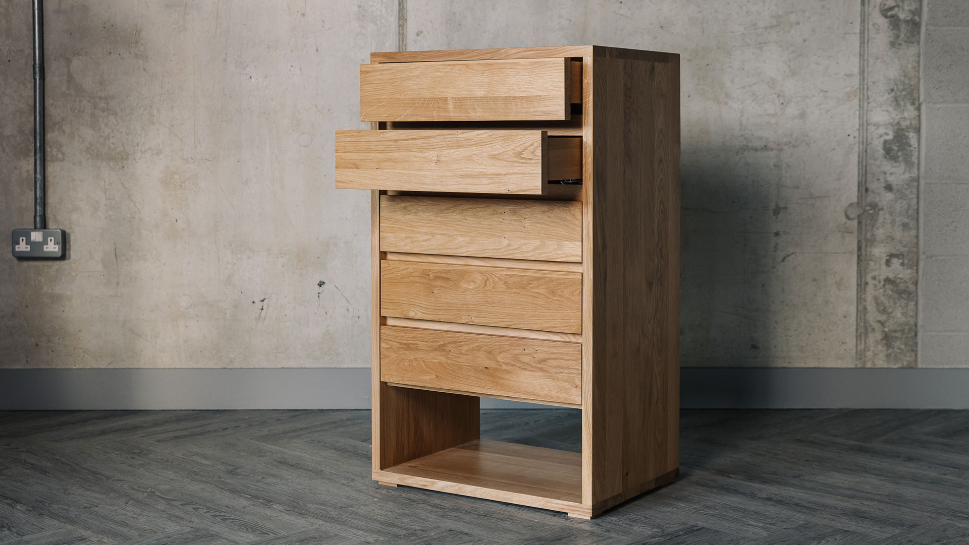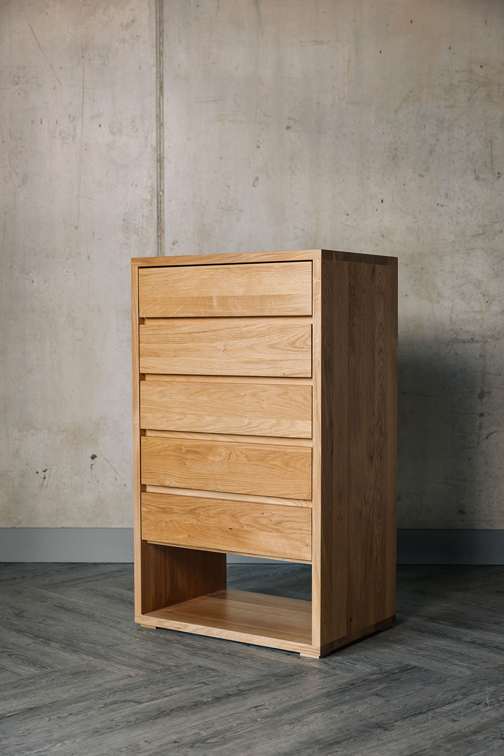 This is a contemporary tall drawer unit made using solid oak with a coating of clear lacquer in a soft satin finish.