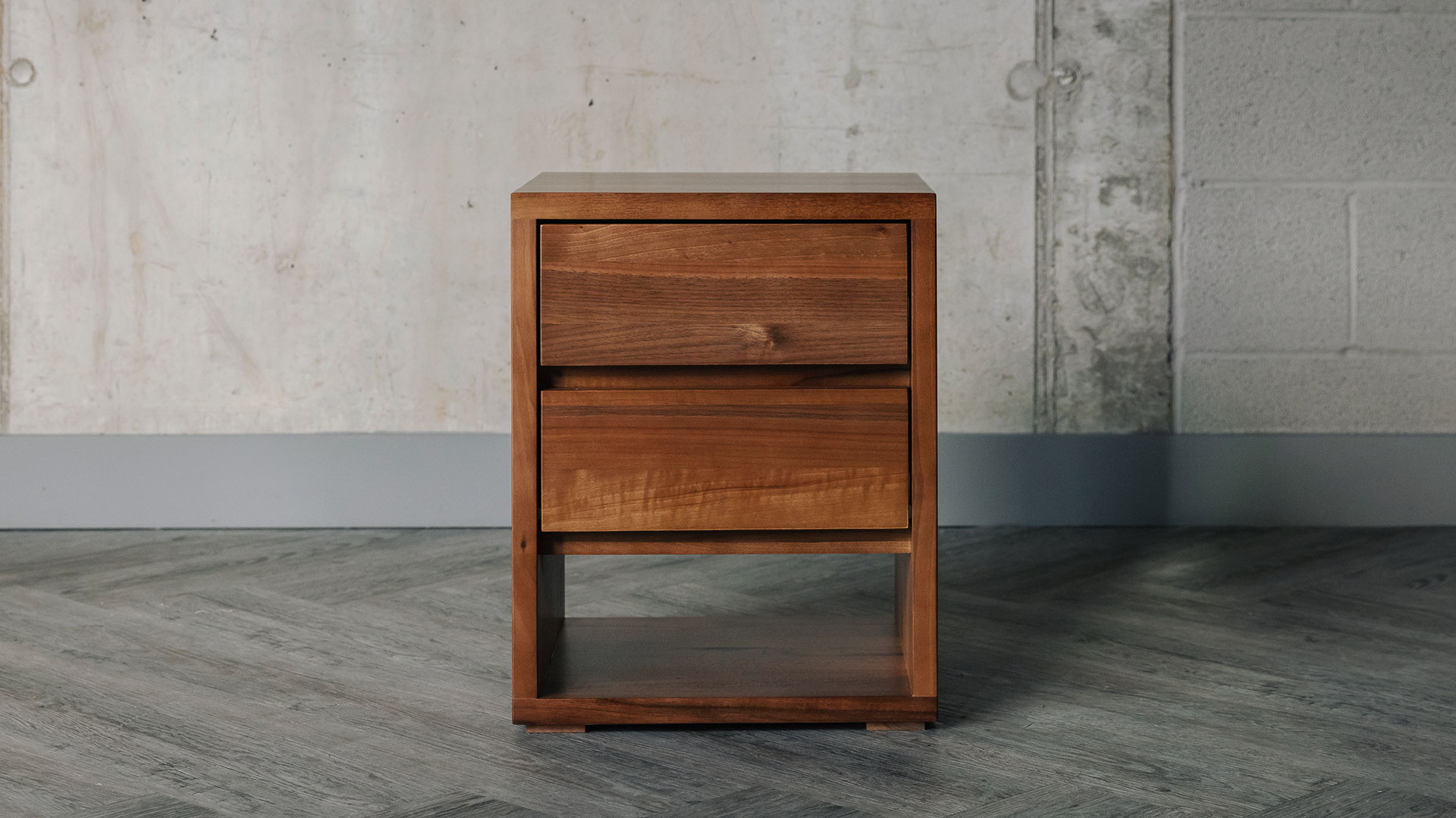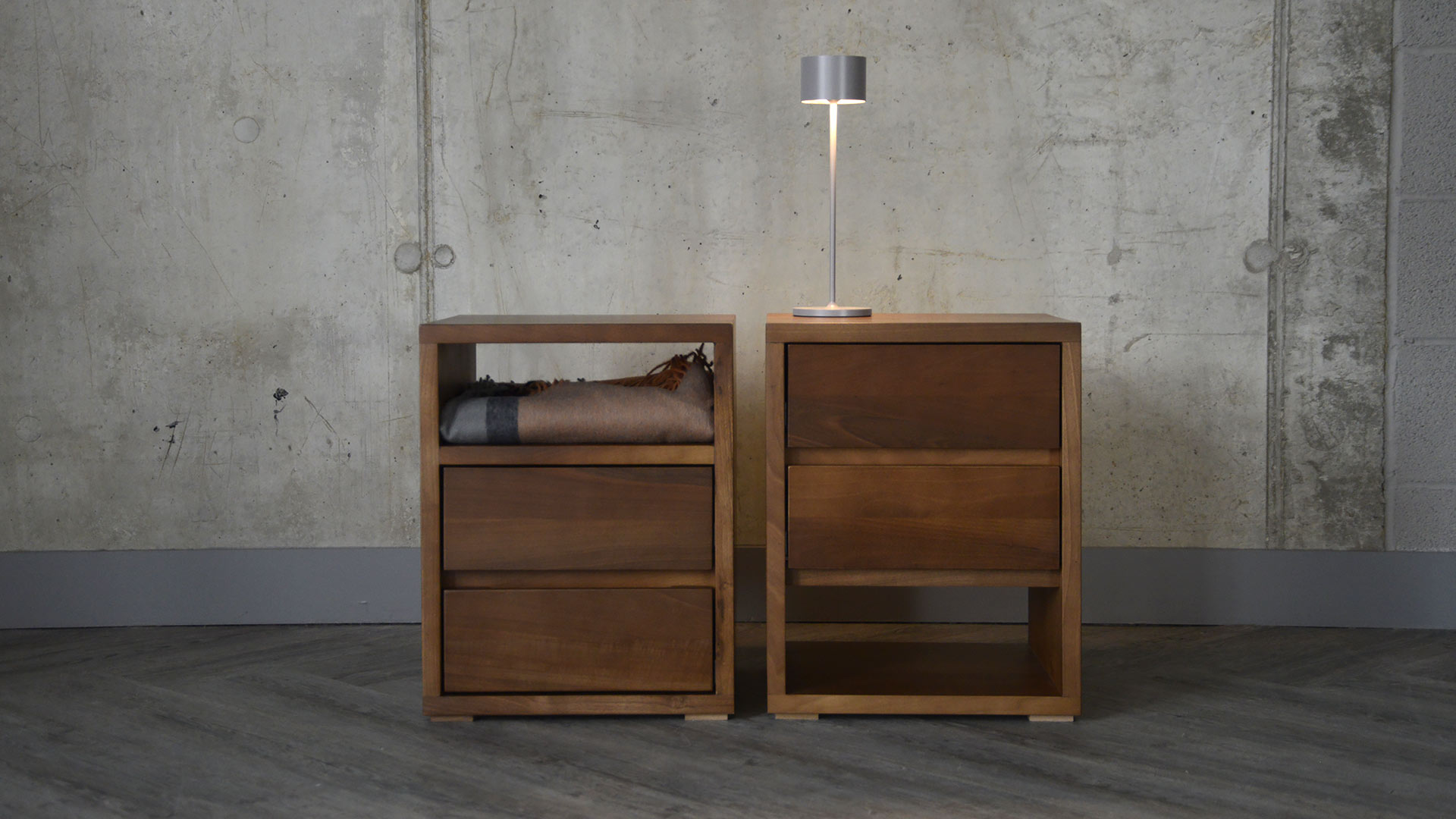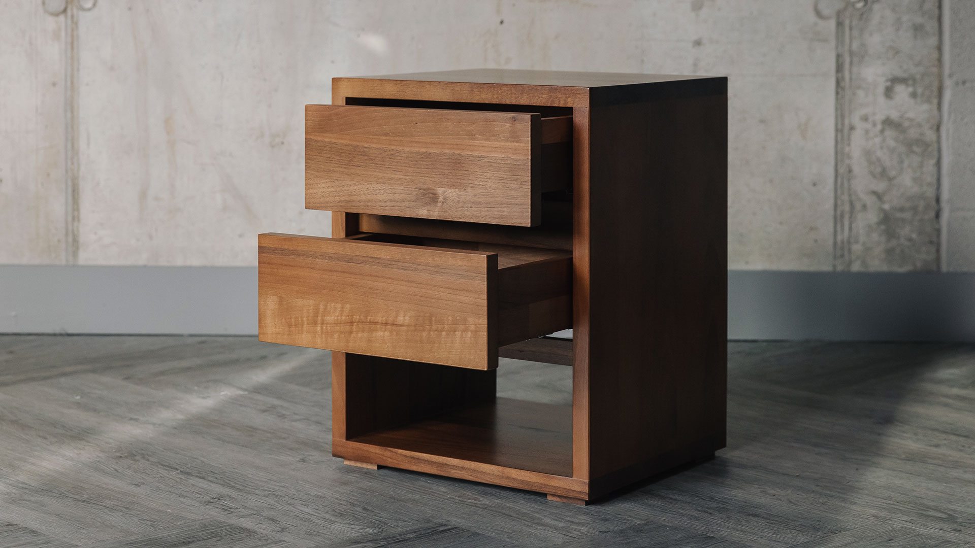 This stylish, compact two-drawer bedside unit is made in solid walnut with a coating of clear lacquer with a soft matte finish. Exclusive to Natural Bed Company – the Cube Bedside Table with Two Drawers is part of our Black Lotus Collection of contemporary, bedroom furniture. Available in solid oak or solid walnut.