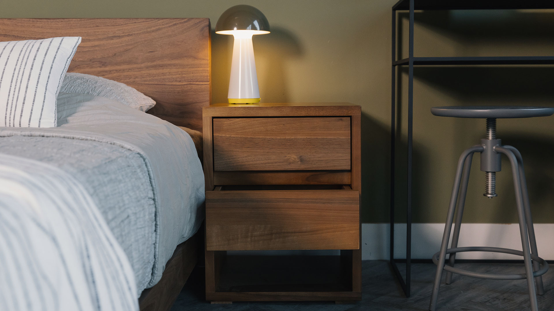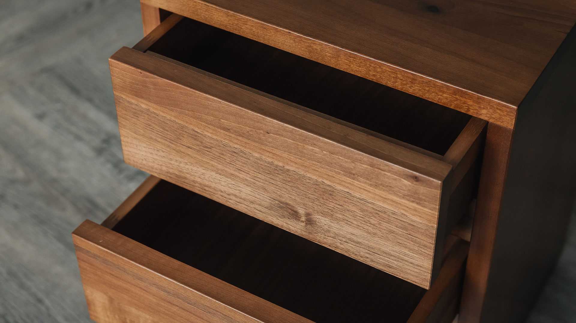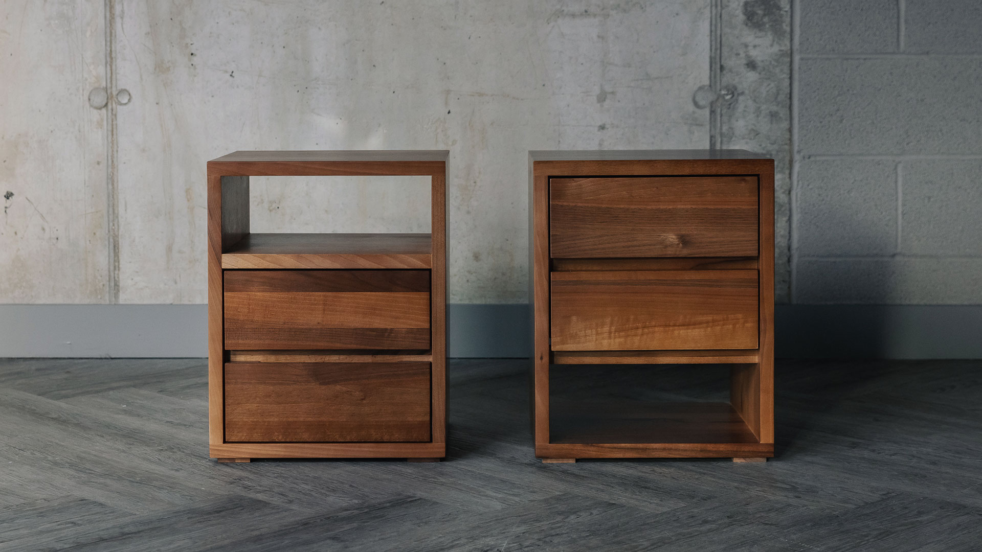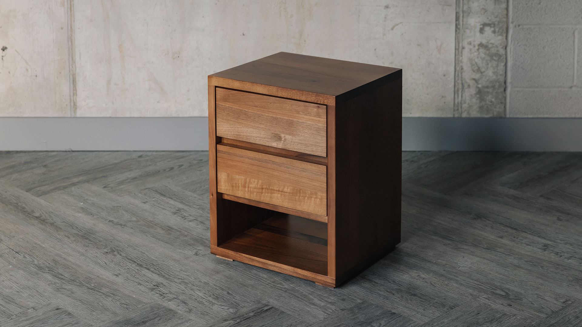 This stylish, compact two-drawer bedside unit is made in solid walnut with a coating of clear lacquer with a soft matte finish. Exclusive to Natural Bed Company – the Cube Bedside Table with Two Drawers is part of our Black Lotus Collection of contemporary, bedroom furniture. Available in solid oak or solid walnut.
