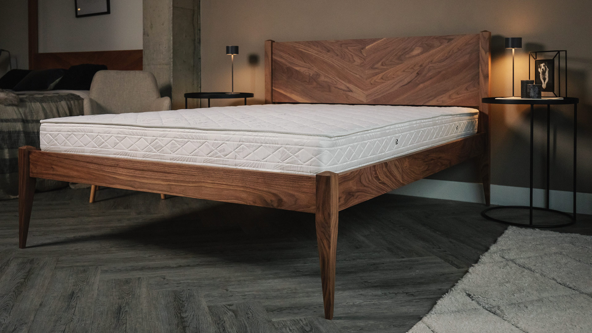The Dalston is a beautiful, handmade, solid wood bed with elegant tapered legs and a bold chevron patterned headboard. A timeless, mid-century design perfect for styling in new or existing bedroom schemes. Pictured here in solid Walnut (some details in Cherry).