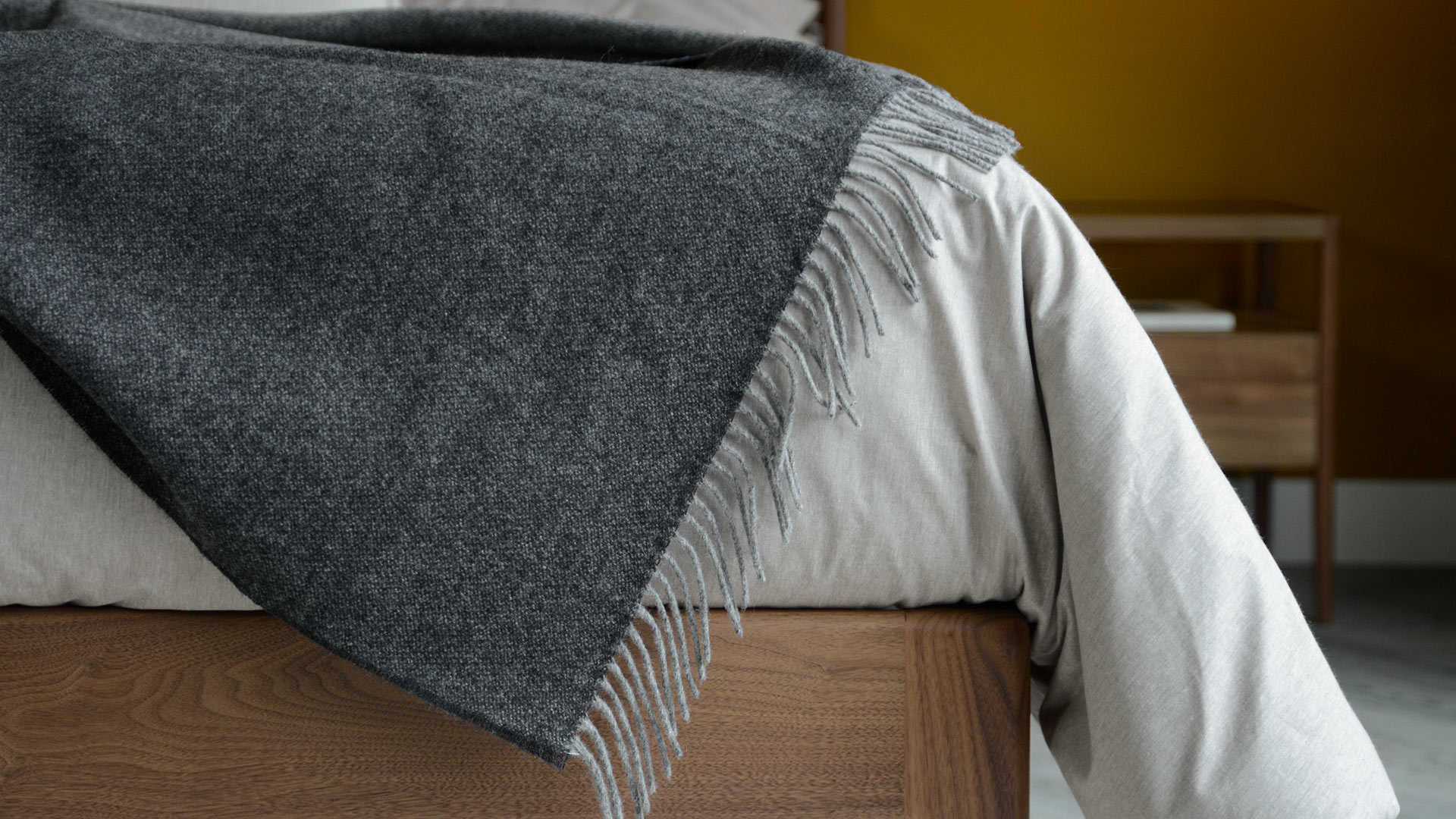 A cosy, dark grey reversible throw made from pure merino lambswool. A dark, almost charcoal grey to the font, contrasted with a light warm grey to the reverse. Ideal for snuggling under on the bed or sofa.