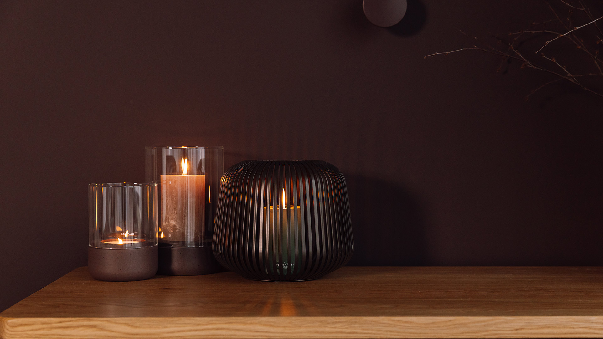 Modern & stylish dark mauve and glass candle holders, with a weighted, deep purple/brown base and ‘lift-off’ glass top to enable you to easily light your candle. Available in two sizes. More information can be found below.