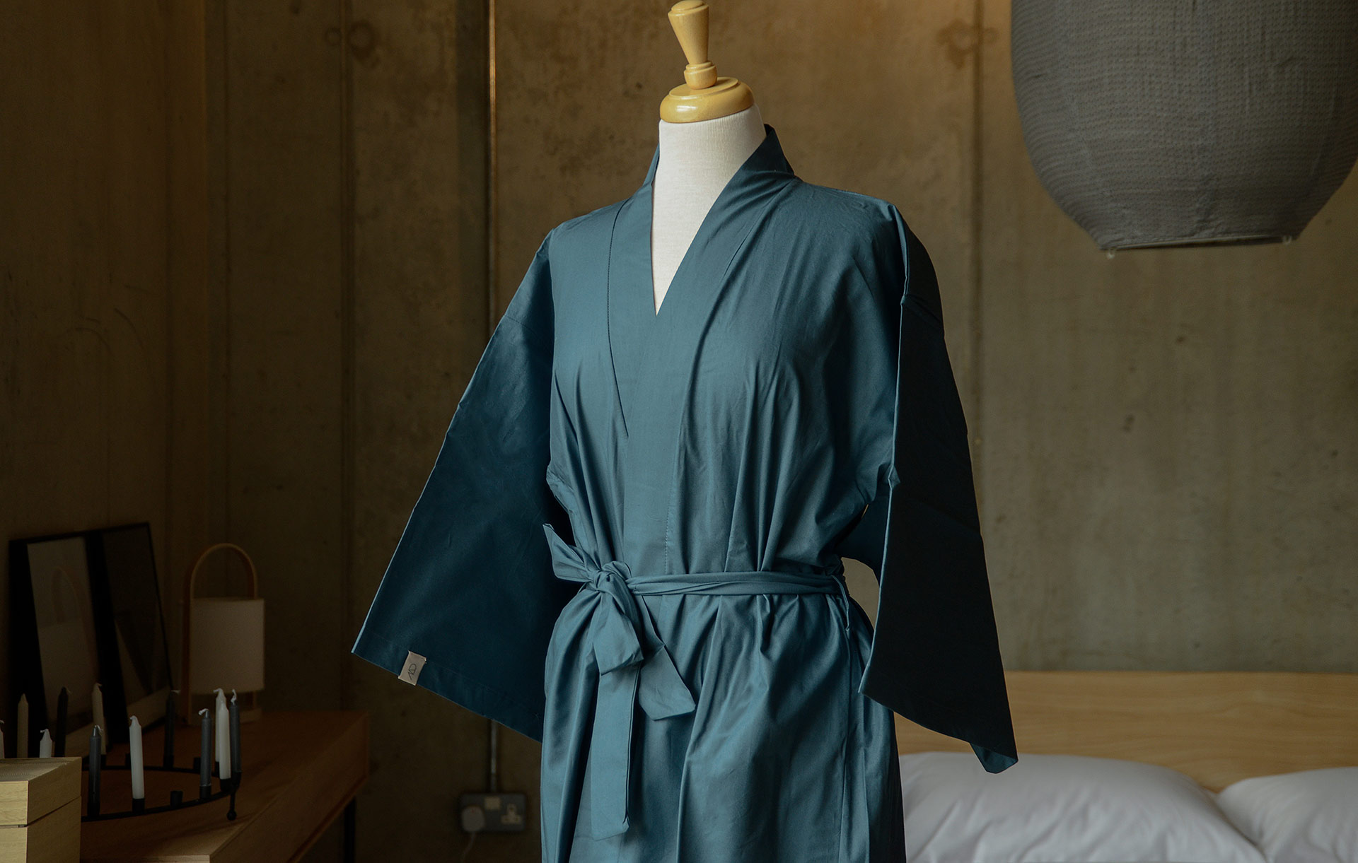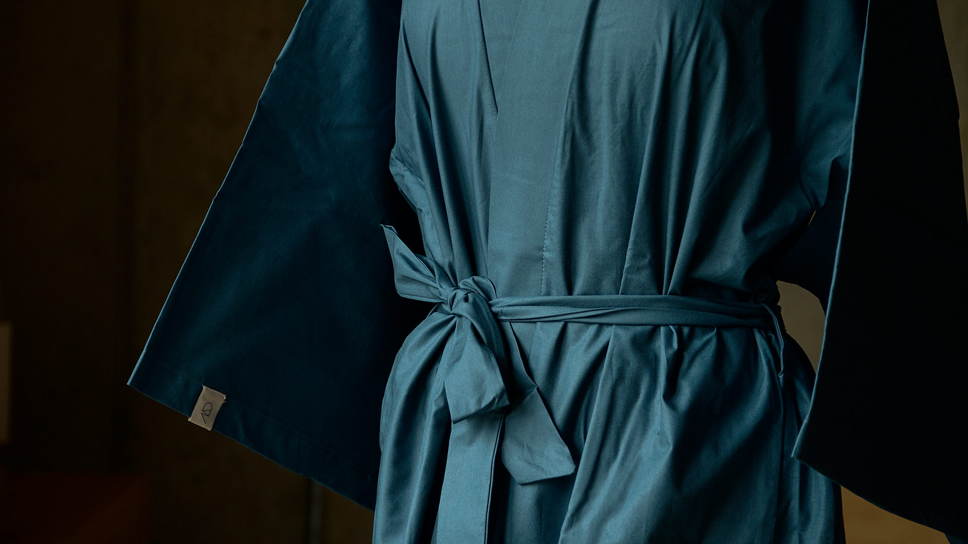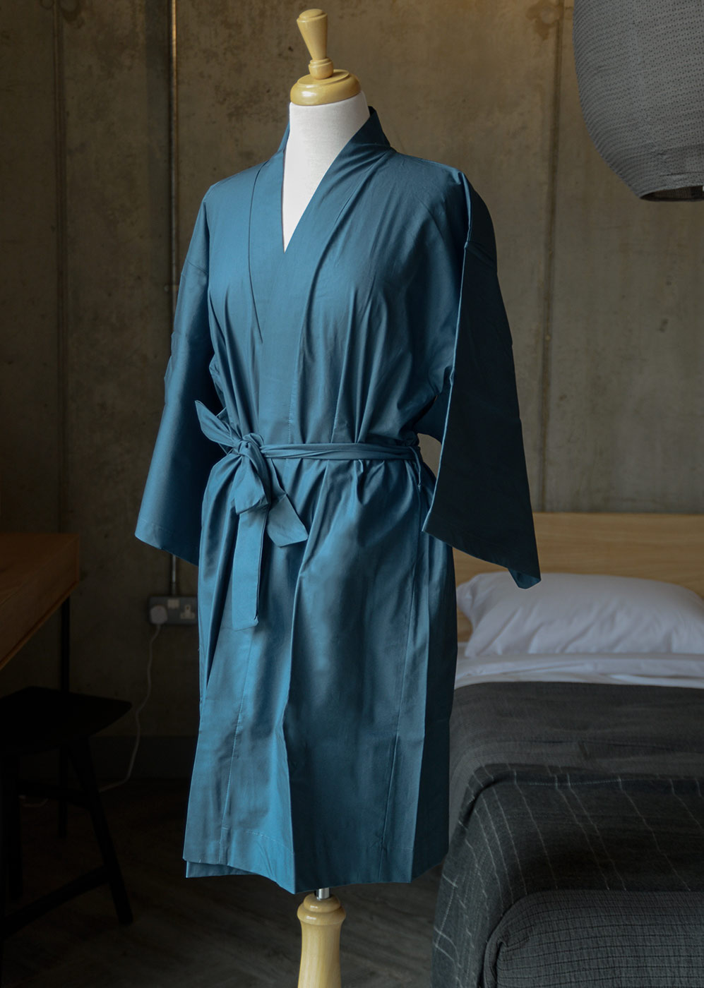 This dark teal kimono robe is made from pure, soft cotton. A light-weight, airy robe, crafted in a muted, navy-teal shade. Complete with a cotton tie belt and 3/4 length sleeves, finished off with a kimono-style shape (not open under the arm as traditional kimonos). An easy-to-wear item with an elegant, luxurious feel; the perfect addition to your bedtime routine.
