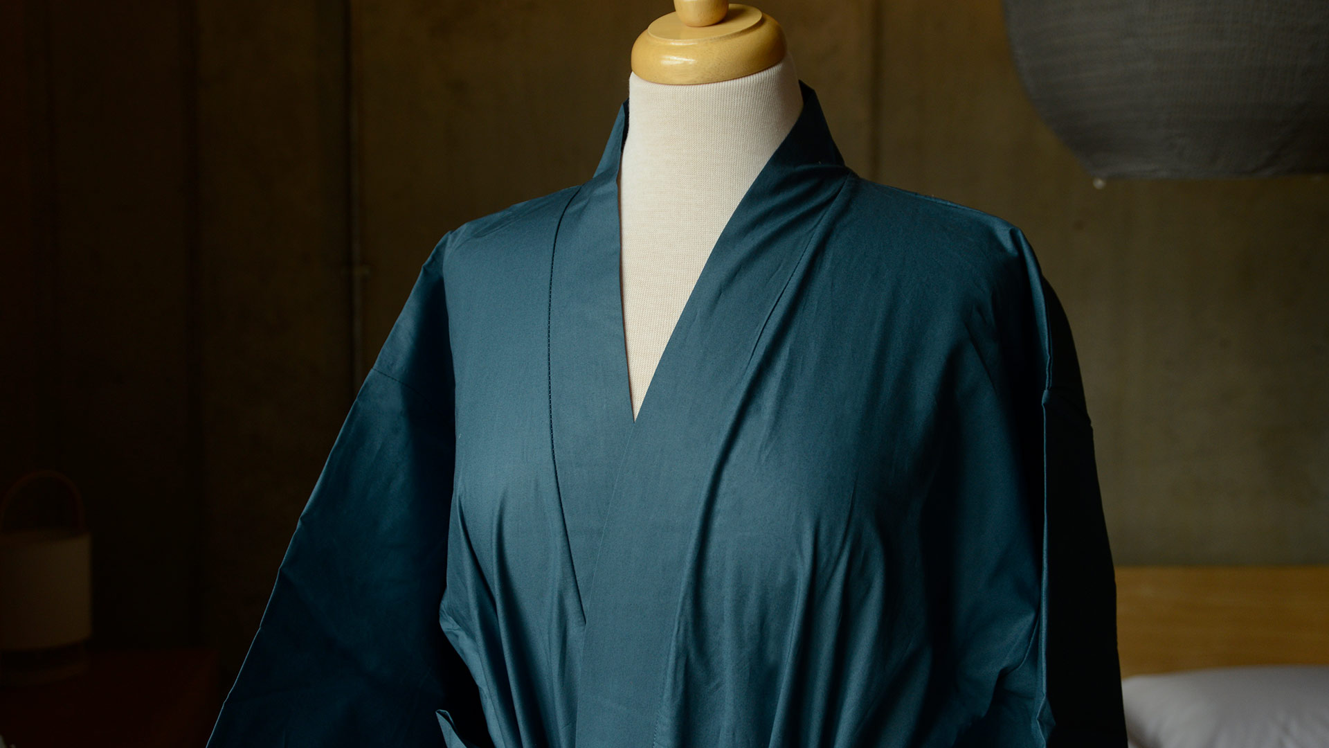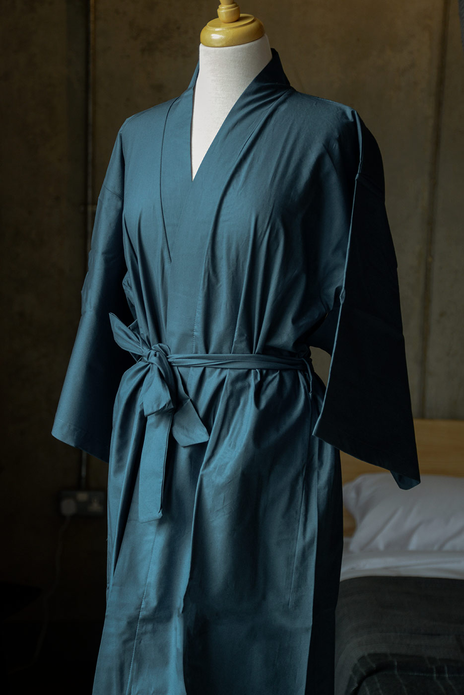 A lightweight, soft cotton kimono robe in a deep muted teal shade. The robe has 3/4 length sleeves in a traditional kimono shape (though not open under the arms) and a tie belt.