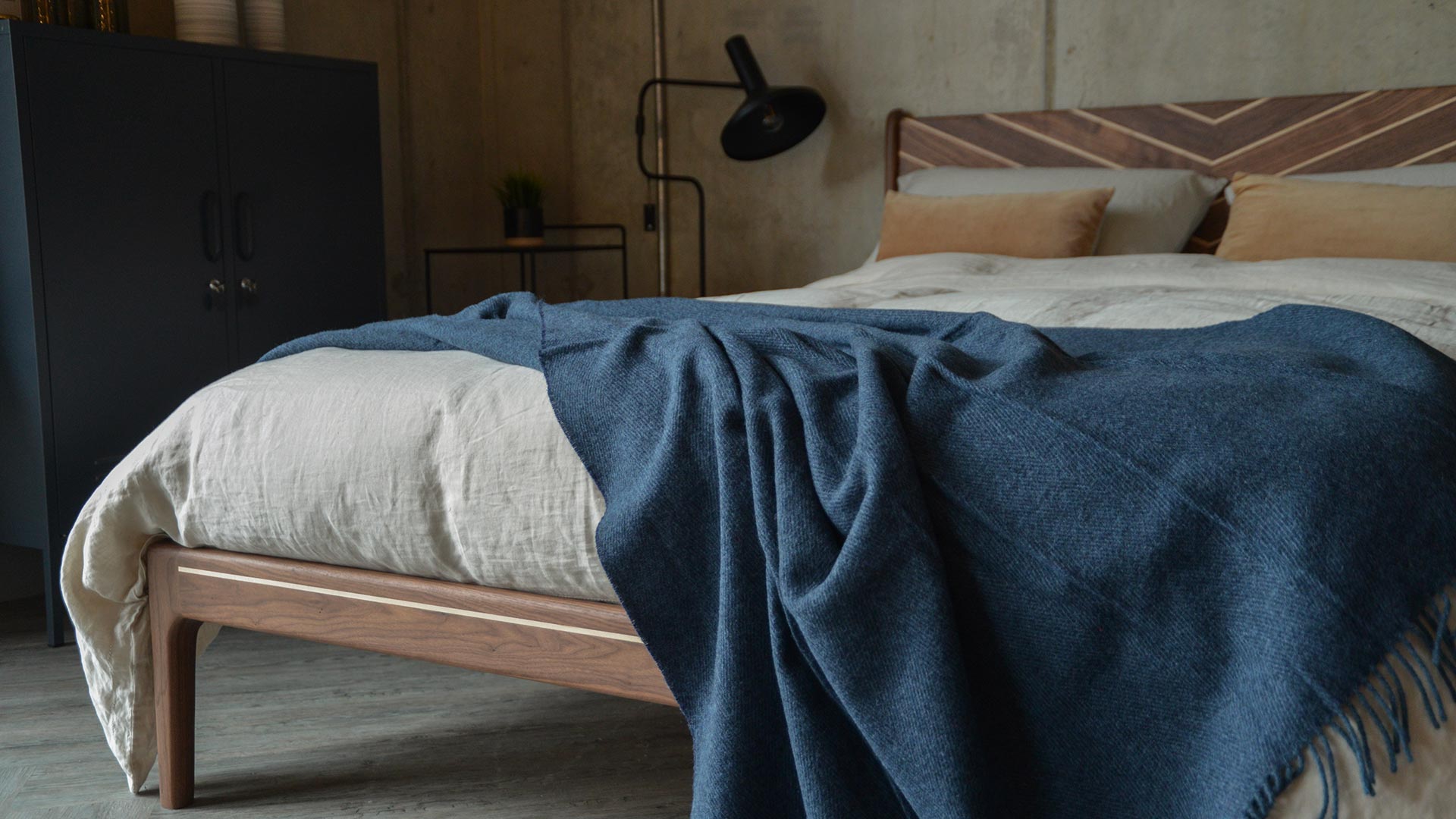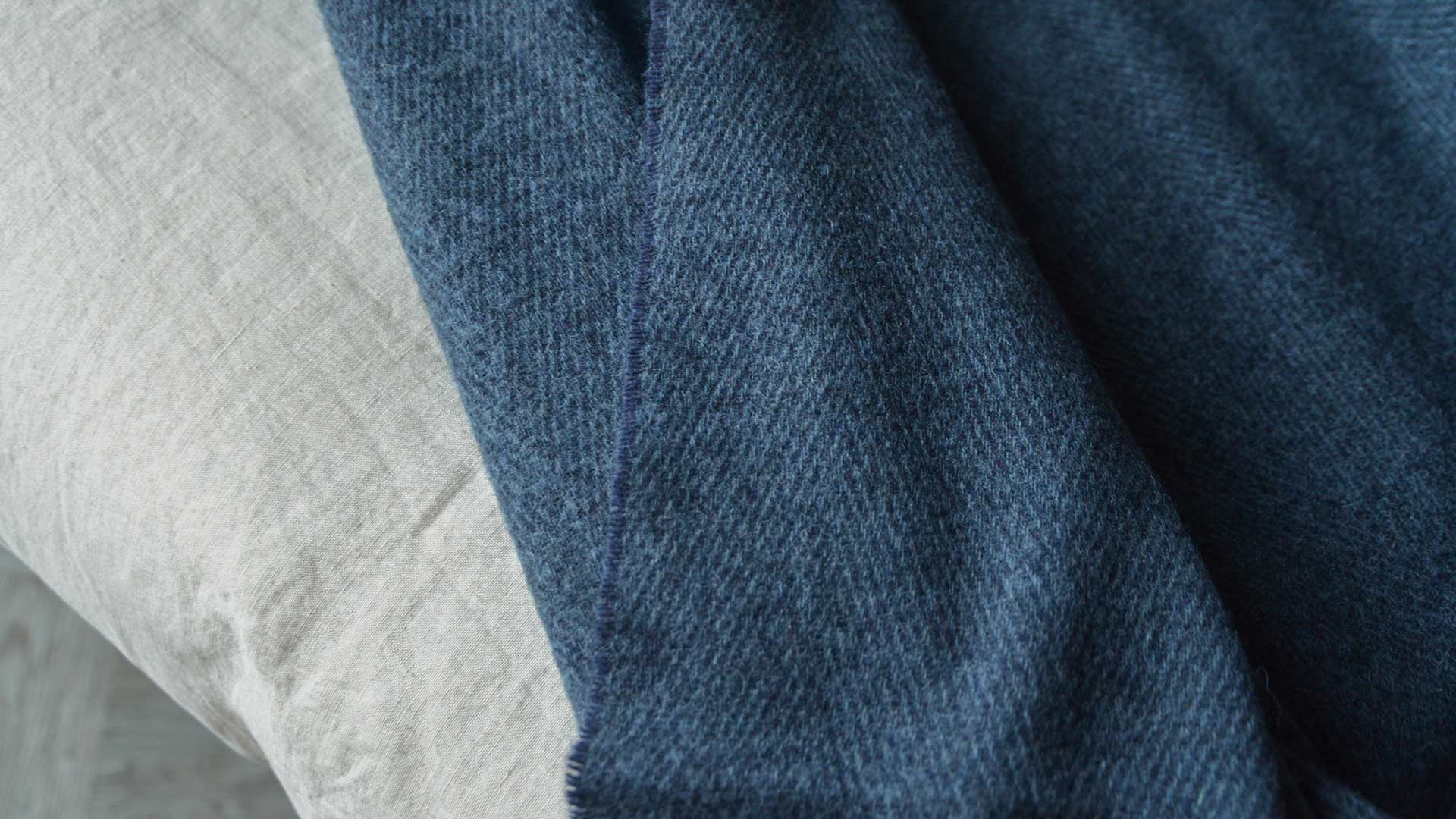 A cosy, deep blue pure wool throw. This muted, deep blue throw has a subtle herringbone pattern in lighter and darker shades of blue.