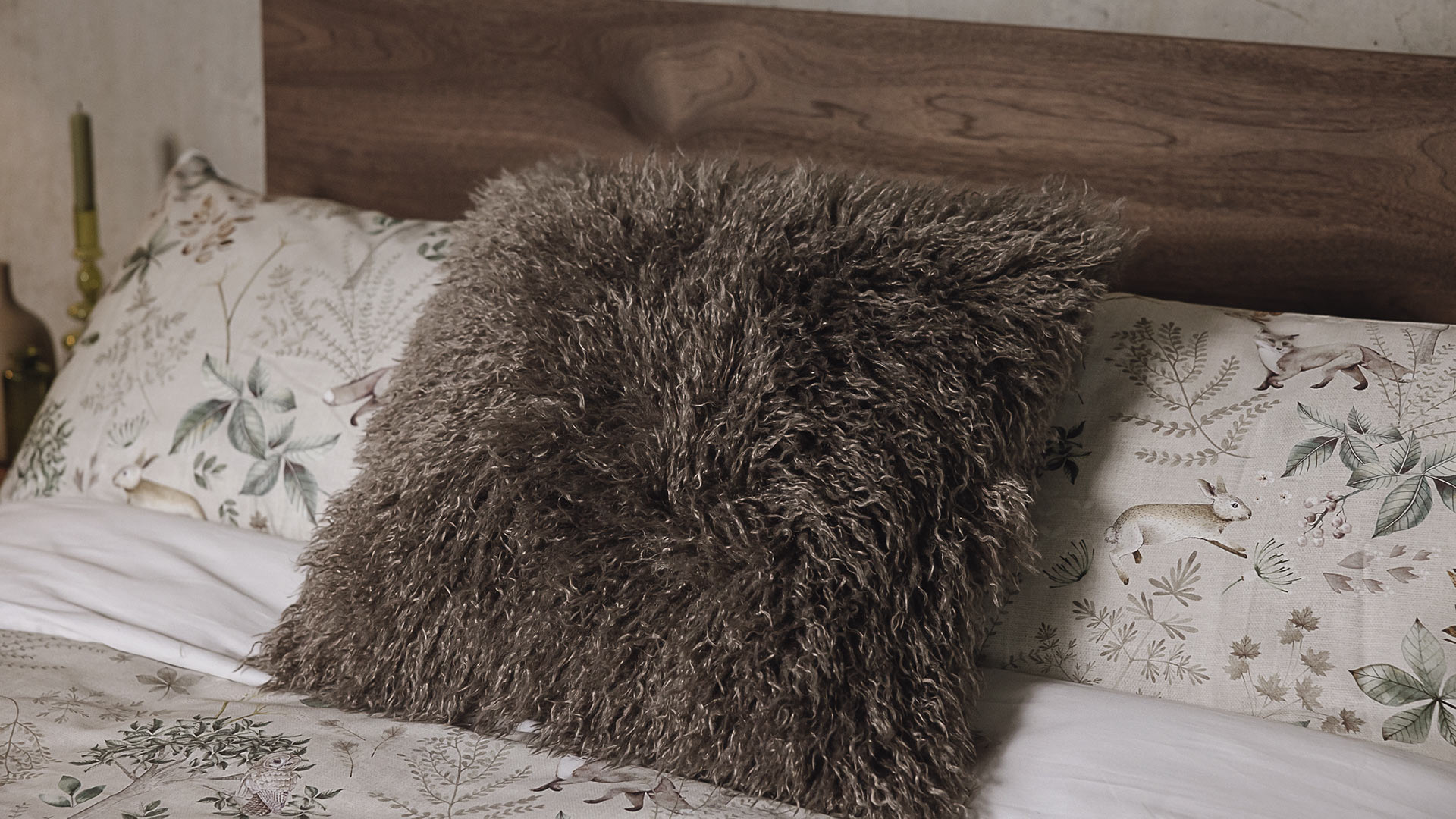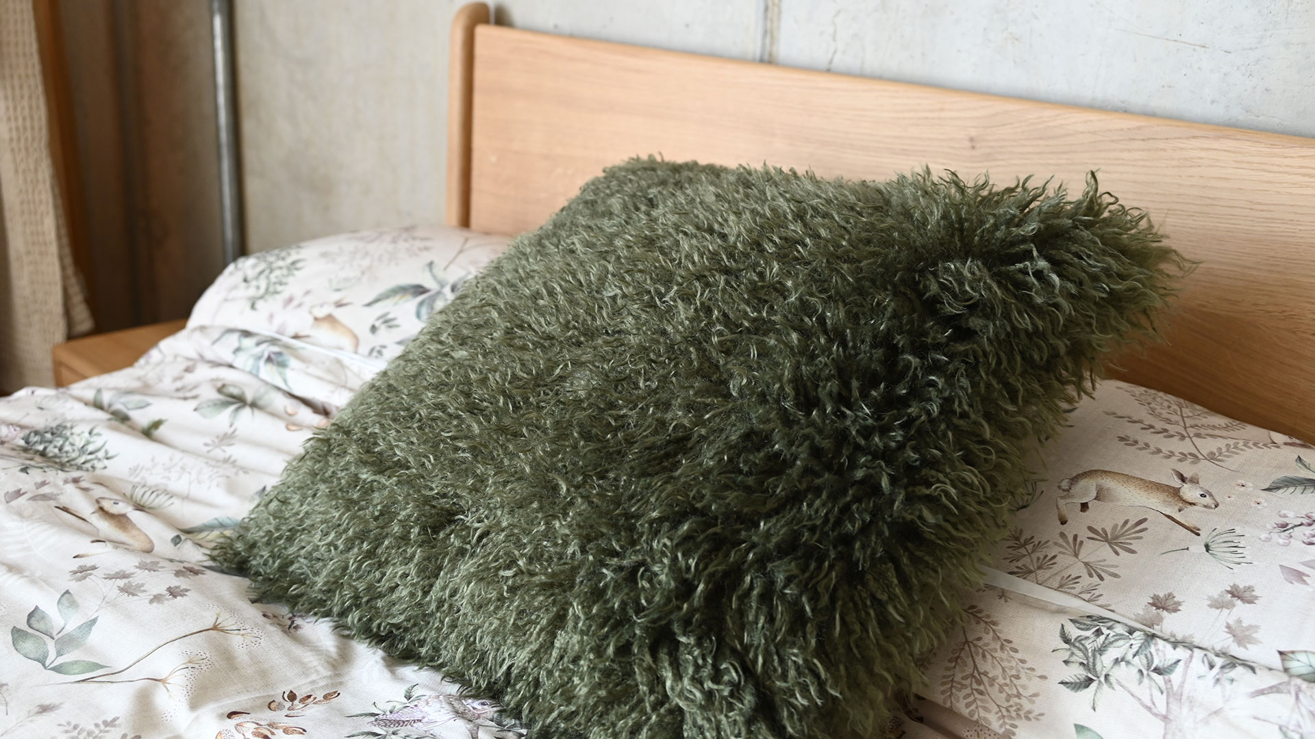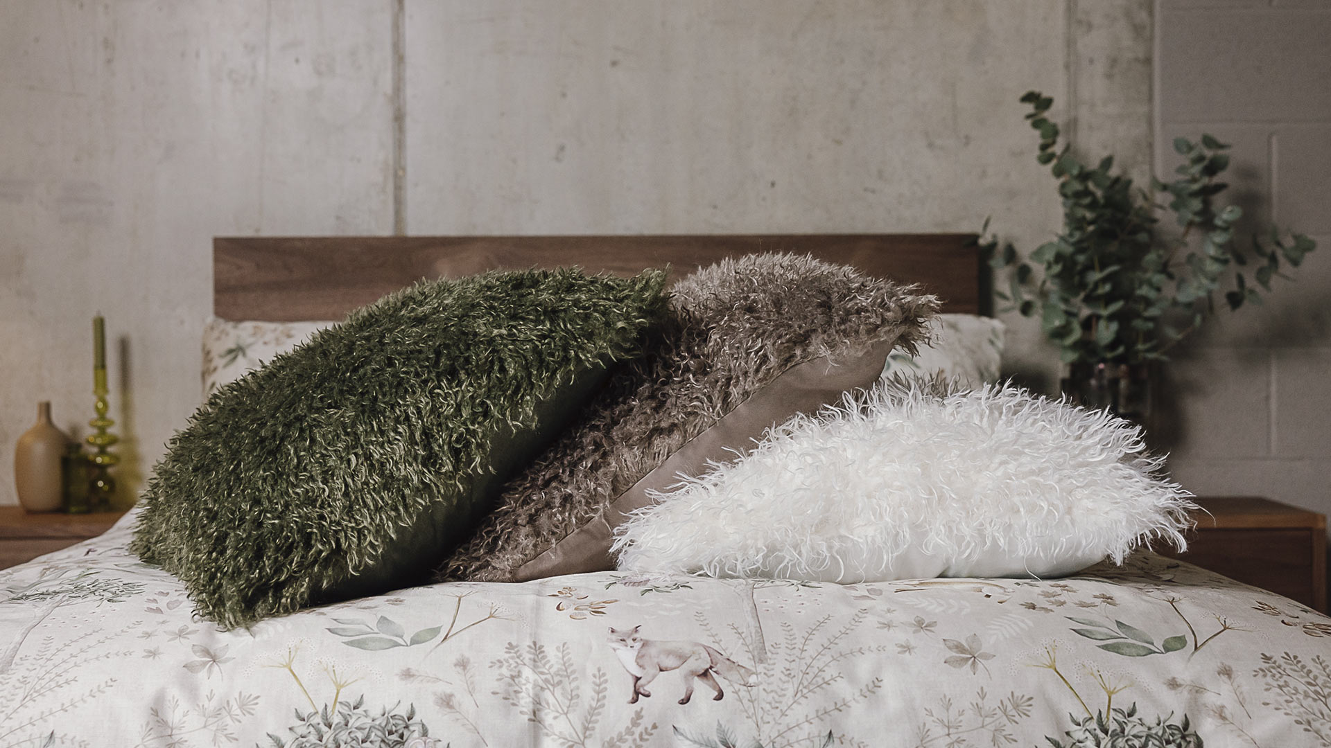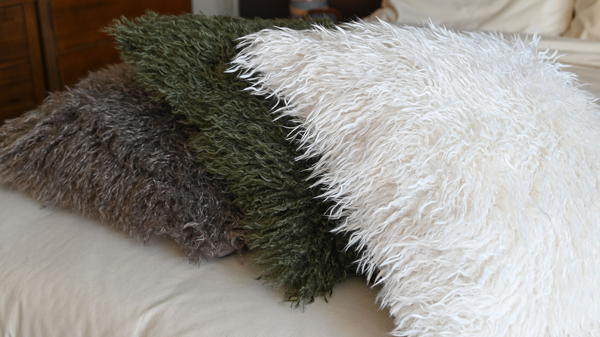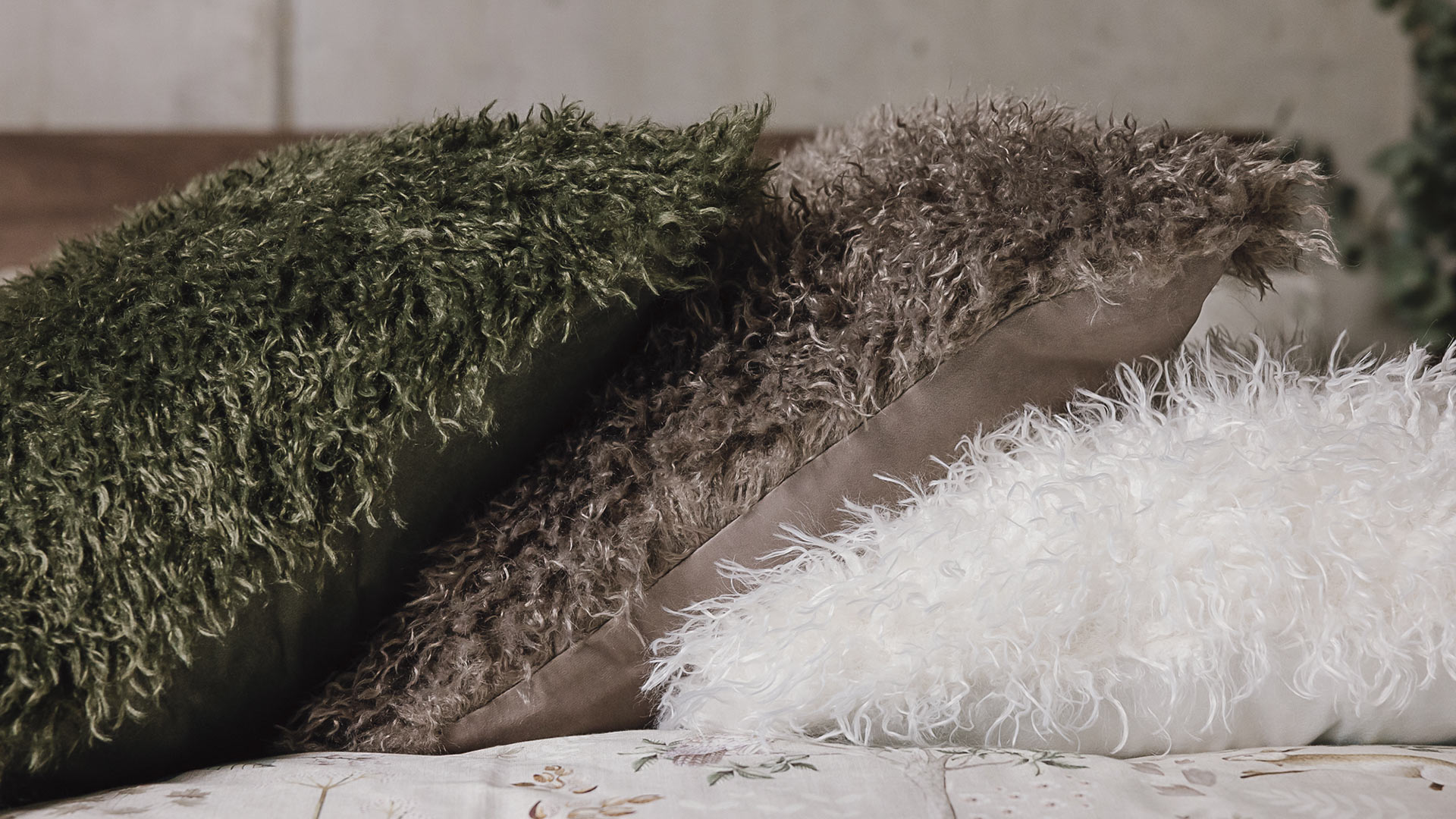 Super soft, plush cushions with faux fur covers – available in three colours with a deep pile. Choose from either olive green, pale ecru or warm grey to suit your colour scheme. A fun accent to any room.