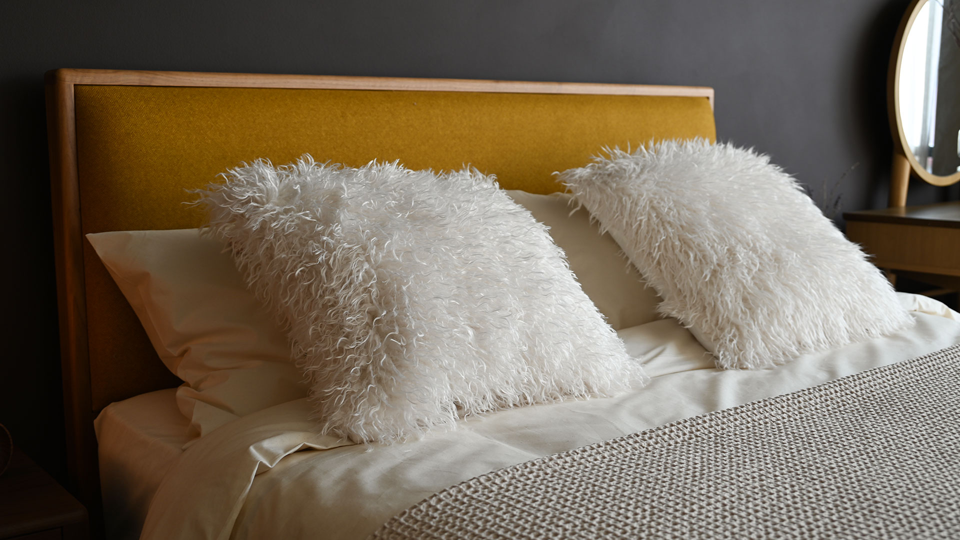 The reverse is in a short pile velvet in a matching colour. You can also find matching throws in the same three colours.