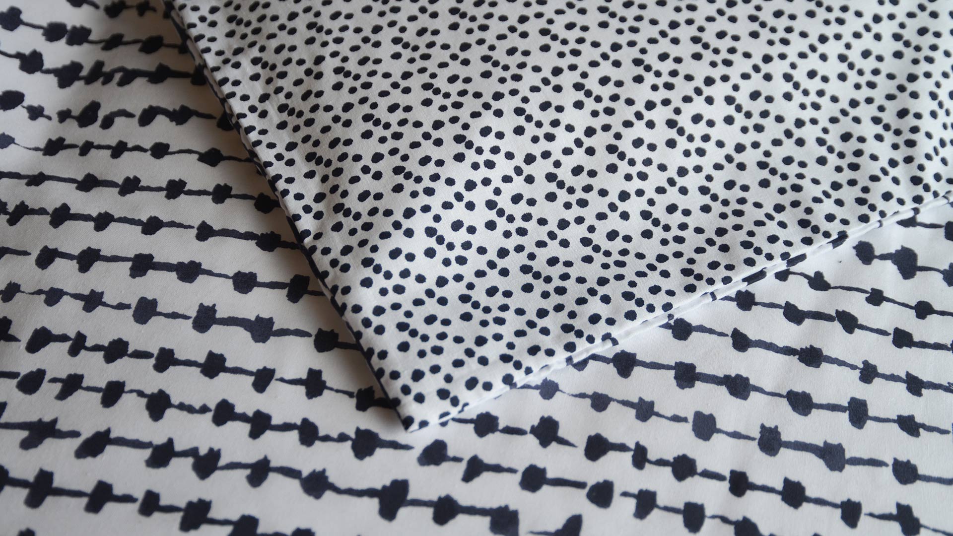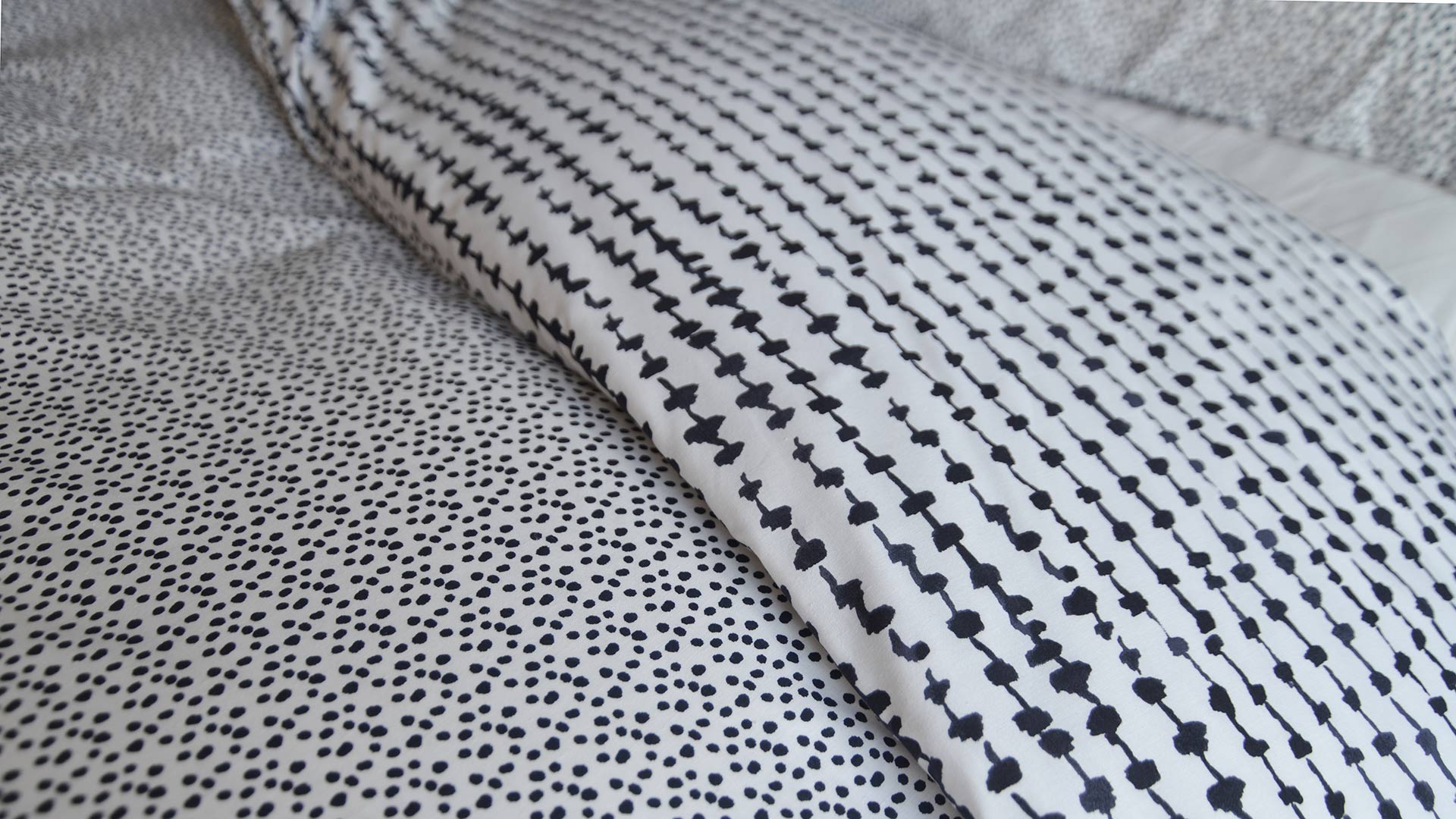 A reversible duvet set with a modern dash and dot print in black on ivory, cotton blend fabric. Available in single, double, king and super-king.