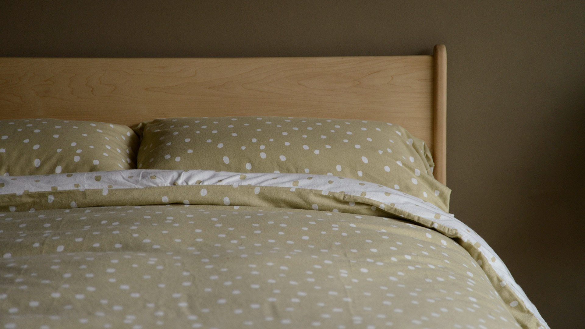 An incredibly soft and cosy duvet cover set, available in a standard double and king-size, and inclusing two matching pillowcases. One side features a pale olive green backdrop with white dots, with the reverse featuring a white backdrop with light olive dots.
