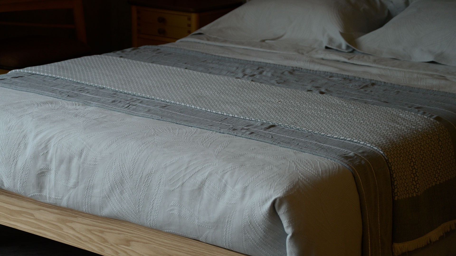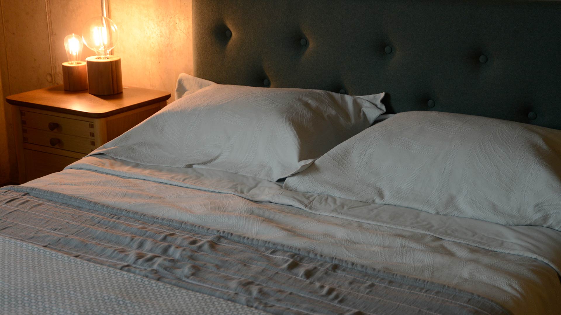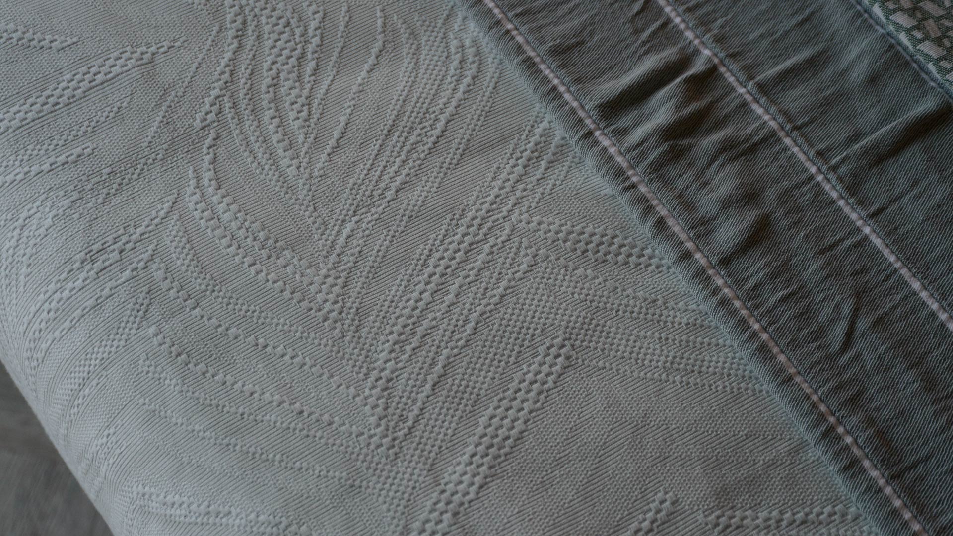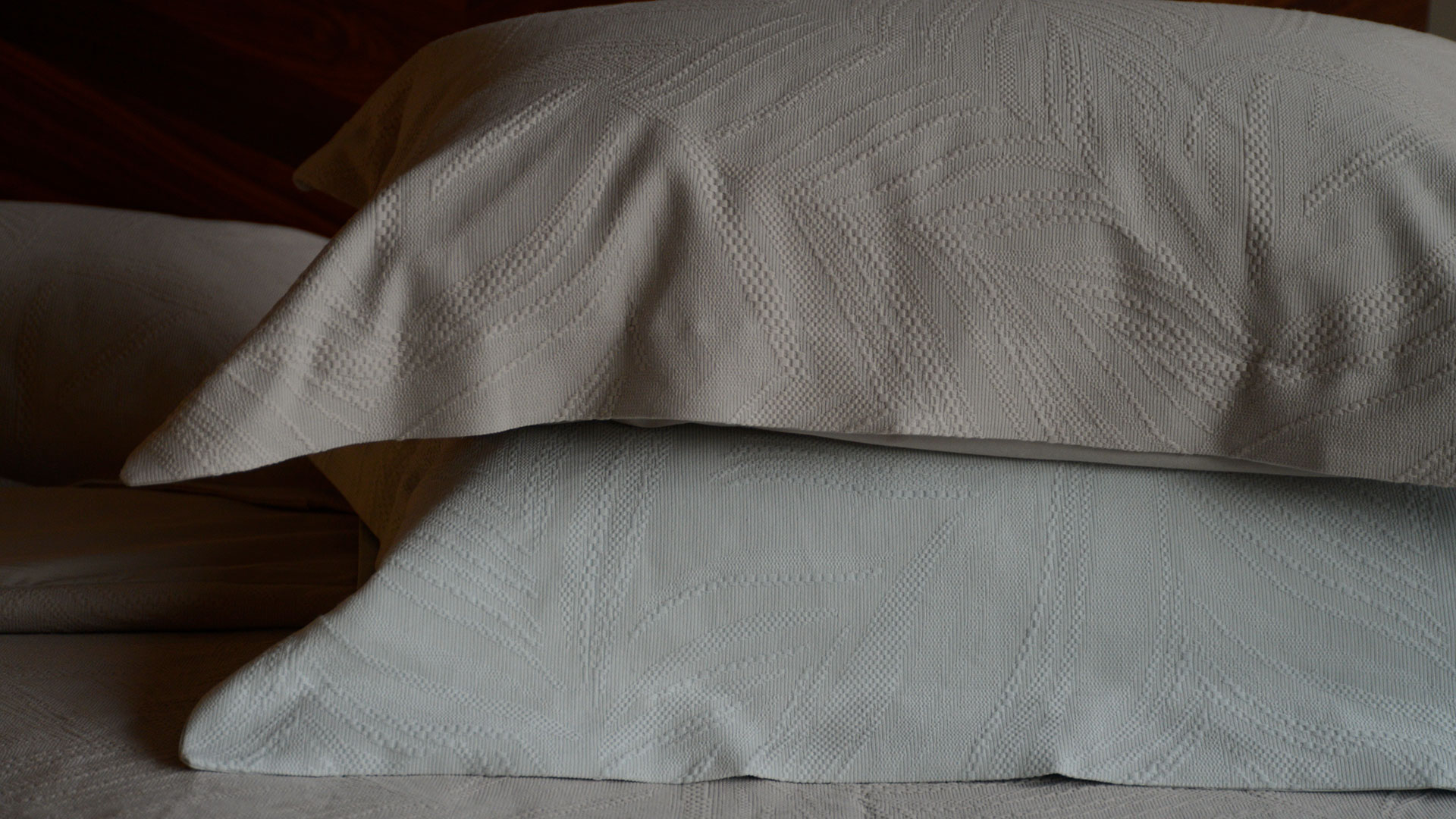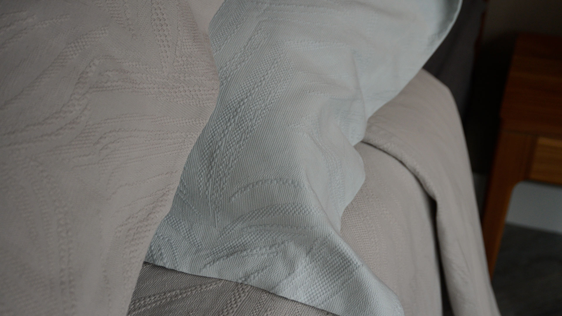 The duvet and pillowcase front are in a textured fabric, while the reverse is in a soft plain cotton. A two-in-one solution: soft as classic cotton bedding, but with the texture and pattern of a bedspread. The sets detailed below include two matching Oxford pillowcases with a 5cm flap.
