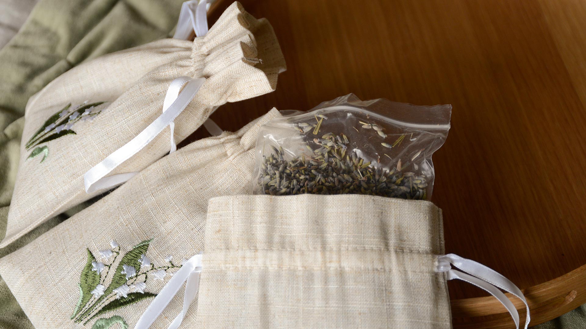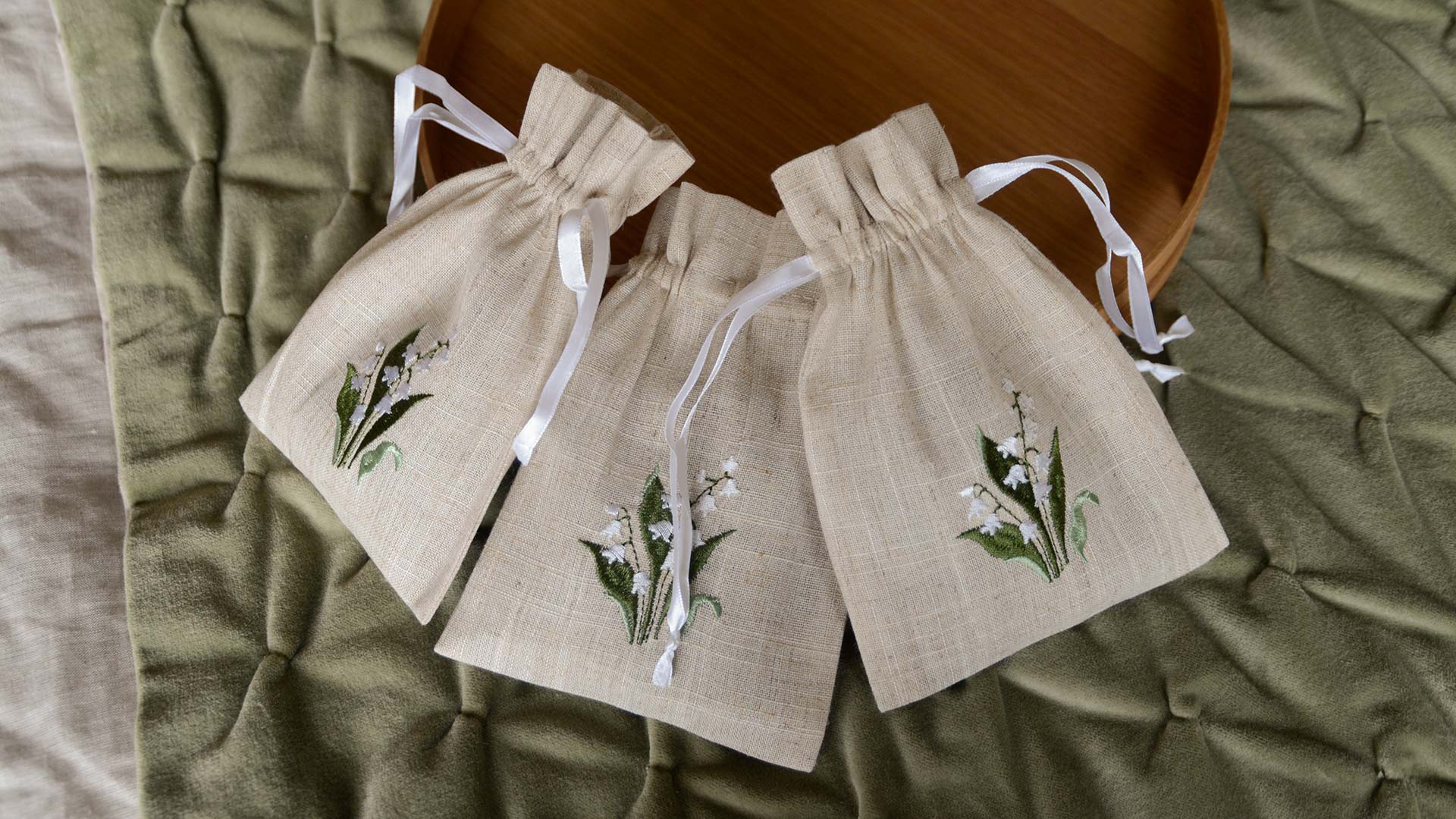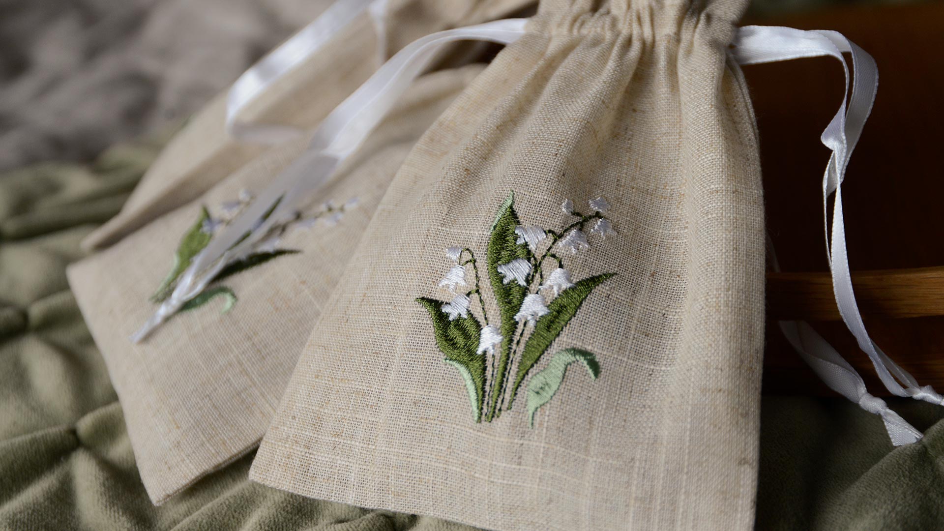 Ribbon-tied lavender filled bags, embroidered with a beautiful Lilly-of-the-Valley flower pattern. A gift set of 3 bags, ideal for hanging in your wardrobe, around the home or in your suitcase.
