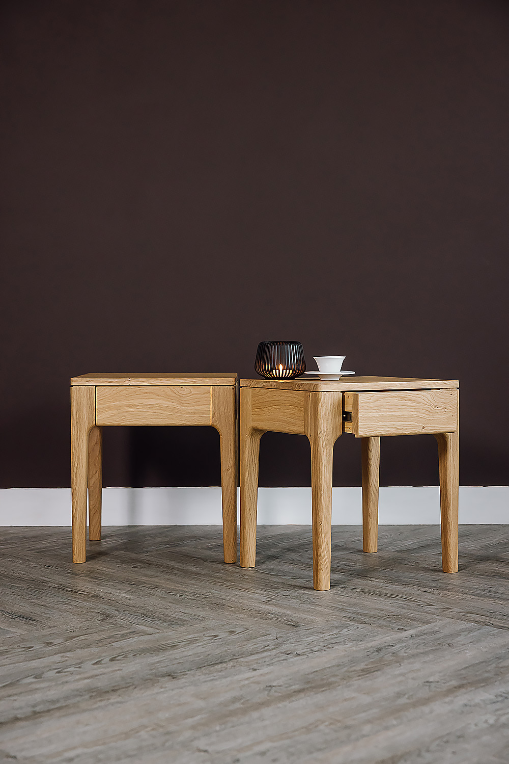 Our ever-popular Camden Drawer Tables, but made here as special editions in locally-sourced English Oak. The Camden drawer tables are a stylish, compact bedside table – handcrafted in solid wood. Curved and tapered legs support a table top with a gently curved corners and a small drawer for bedside storage.