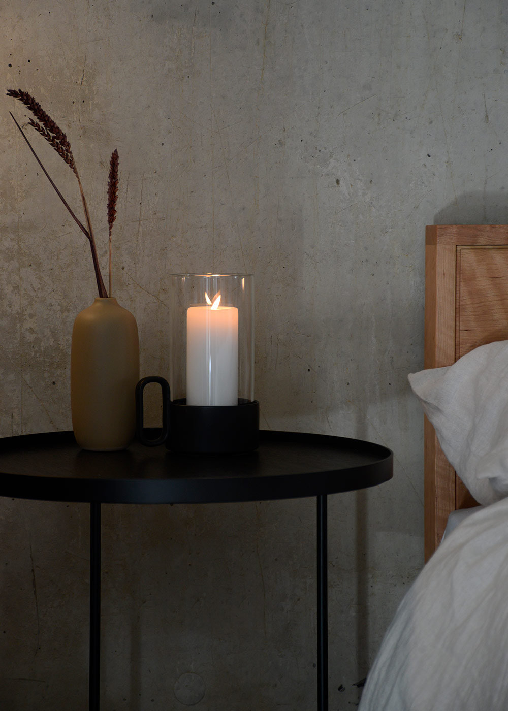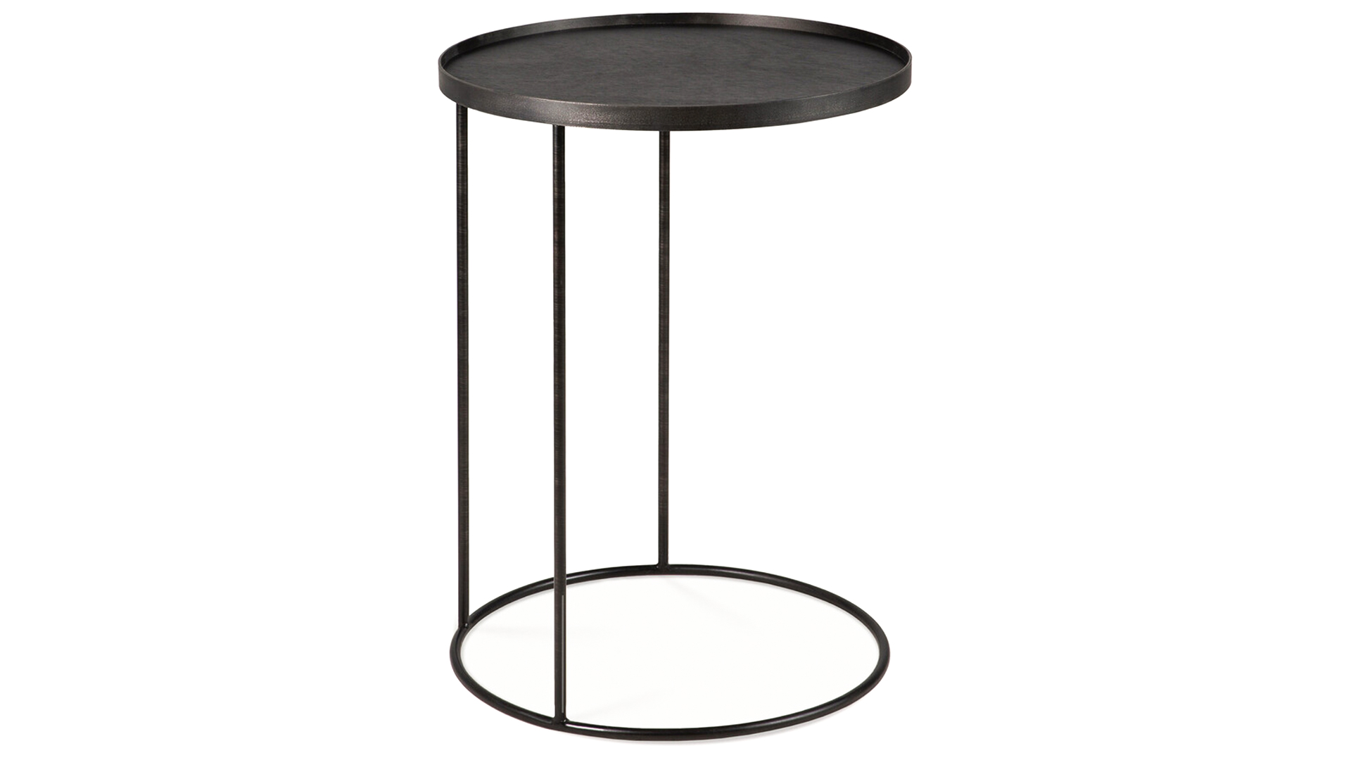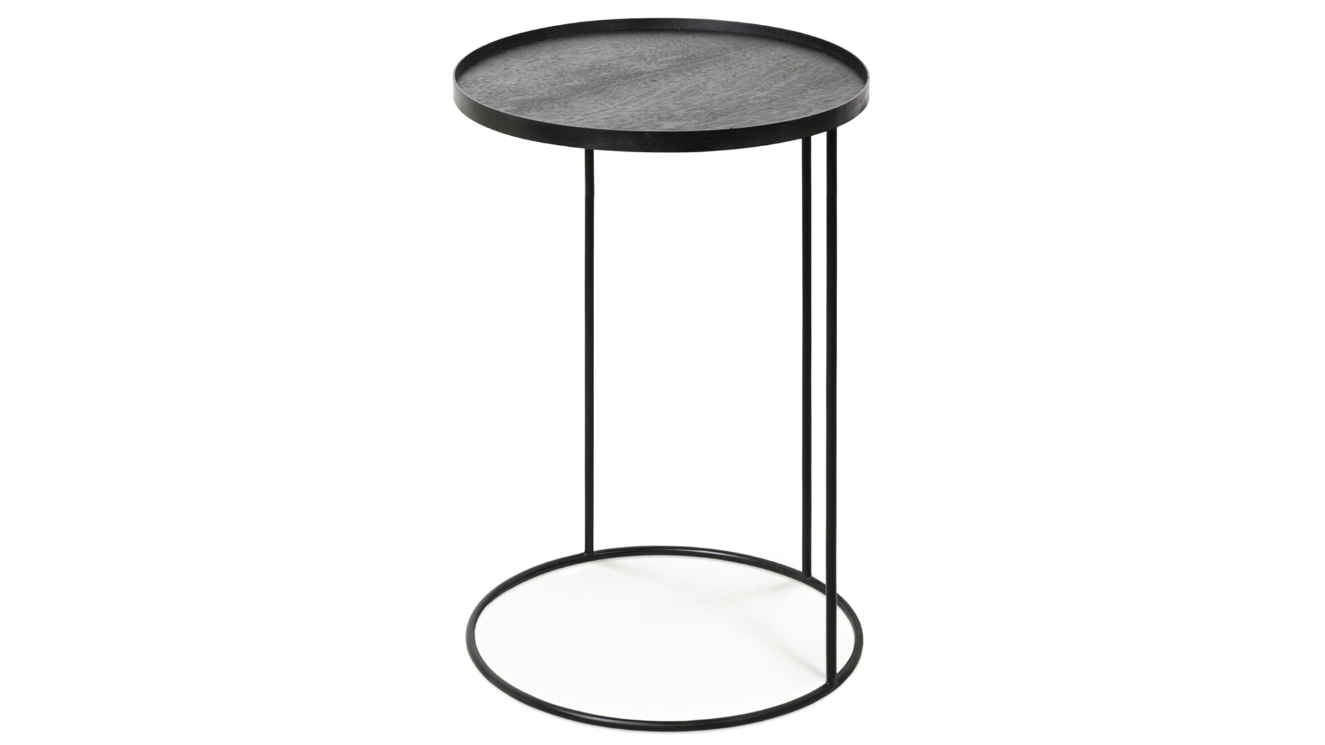A collection of black side tables. With table tops made in black-tinted wood and a water-based varnish finish, complete with black metal frames. These luxe black side tables are the ideal shape for sitting just over the edge of a bed or sofa – perfect for when you need to keep a cup of tea, book or the TV remote close at hand!