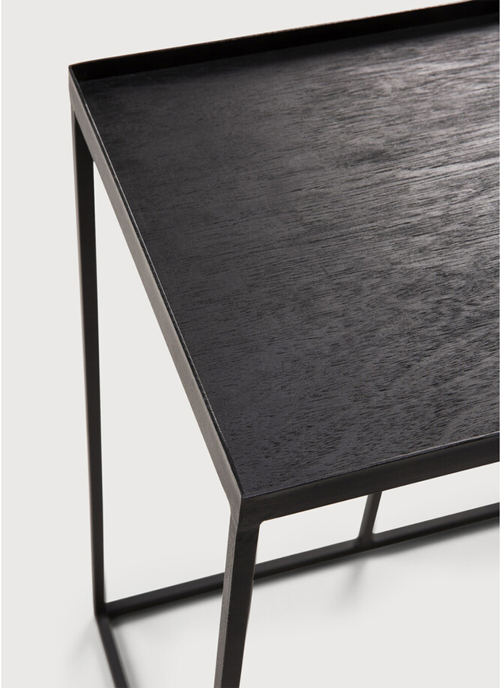 Contemporary, black side tables – each has a square section metal frame in black, with a black stained wooden top.
