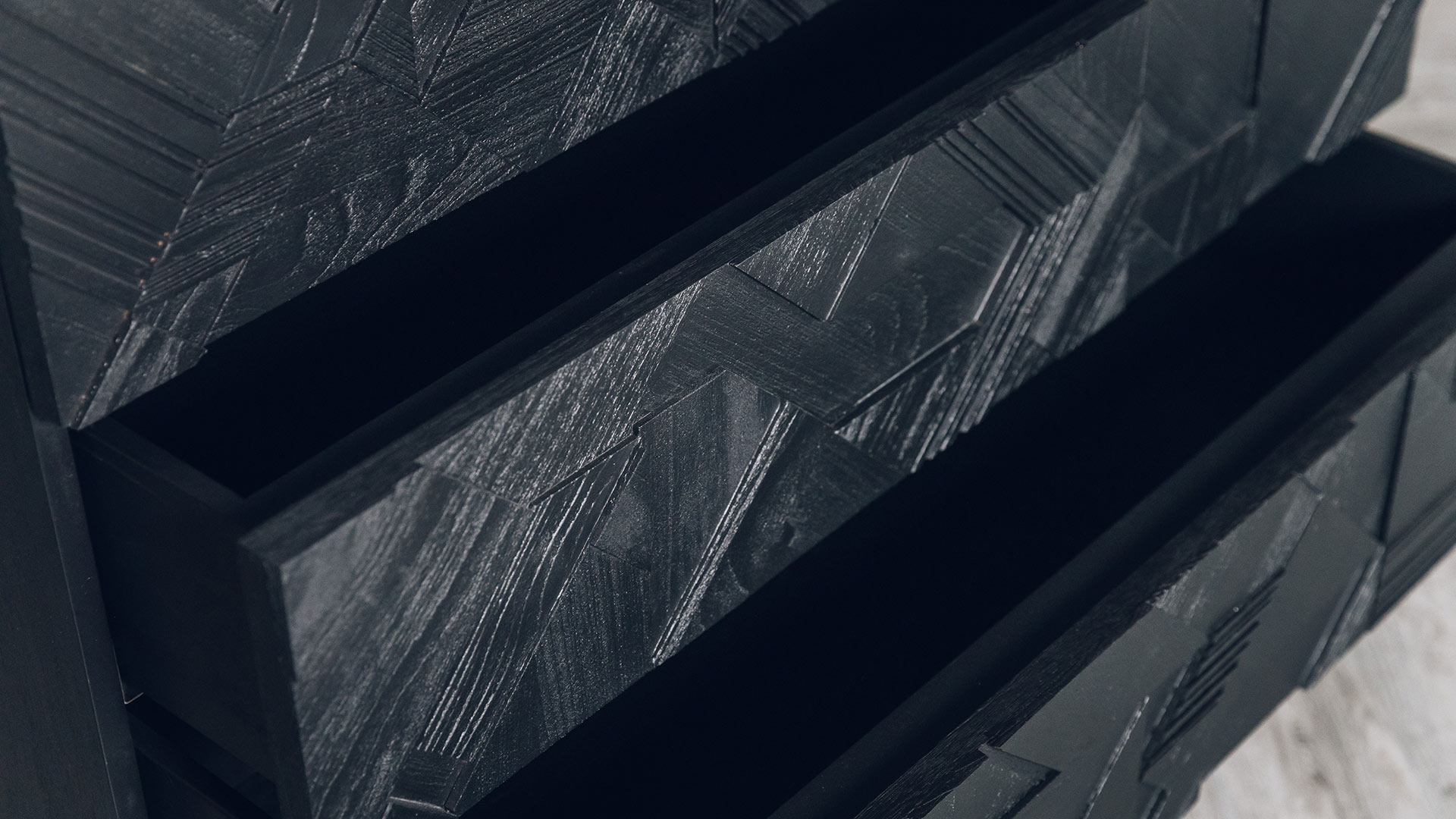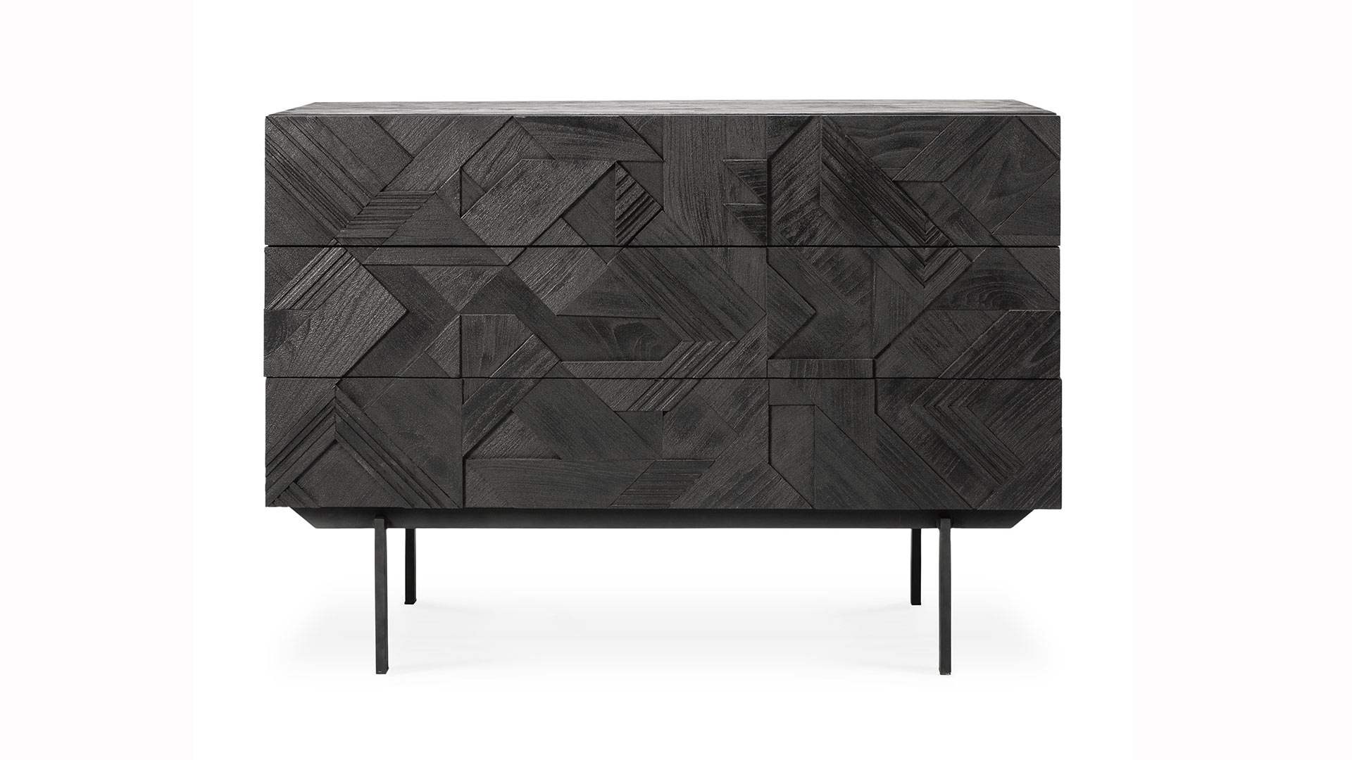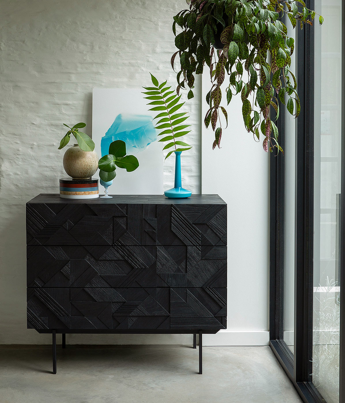 Made using solid, black stained teak, the Ethnicraft Graphic Dresser is a unique, striking piece. This contemporary chest of drawers is layered with triangle design in an opaque black finish. Ideal for use in either the hallway, bedroom or lounge, this item makes a bold statement, but keeps an understated profile.