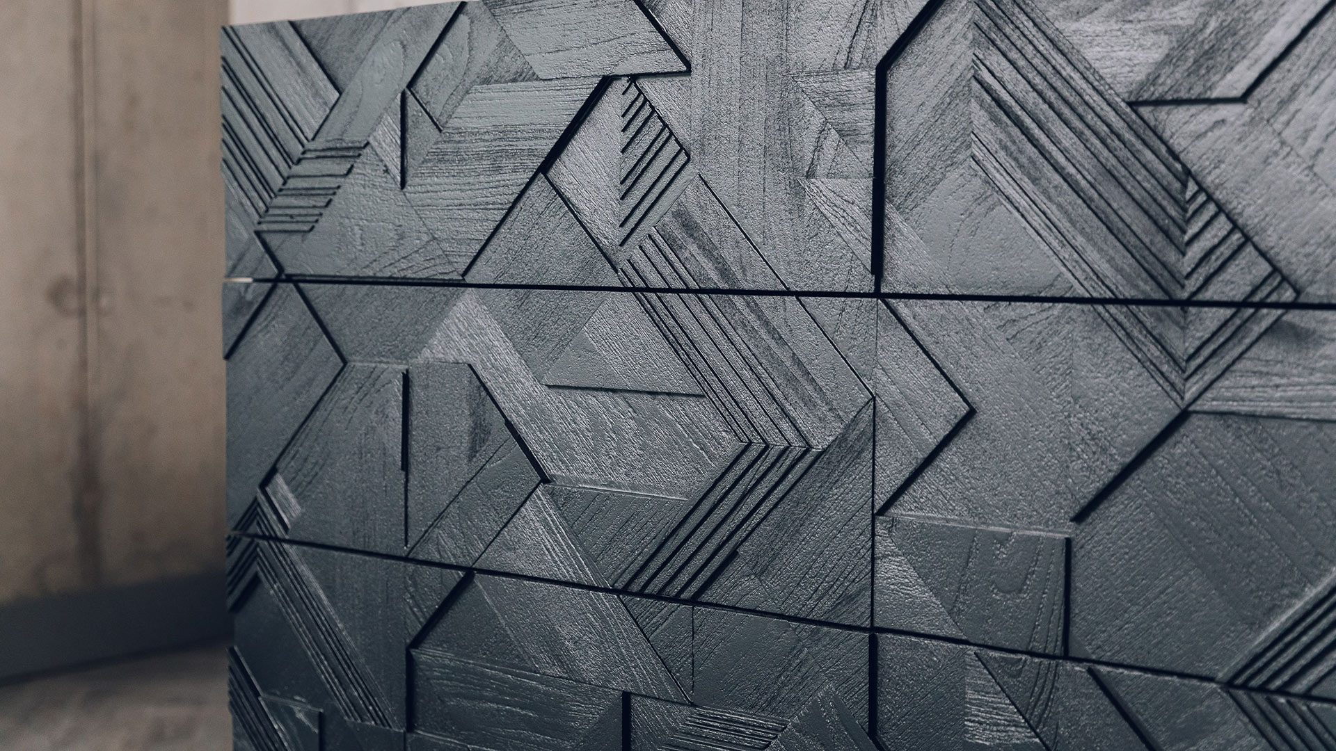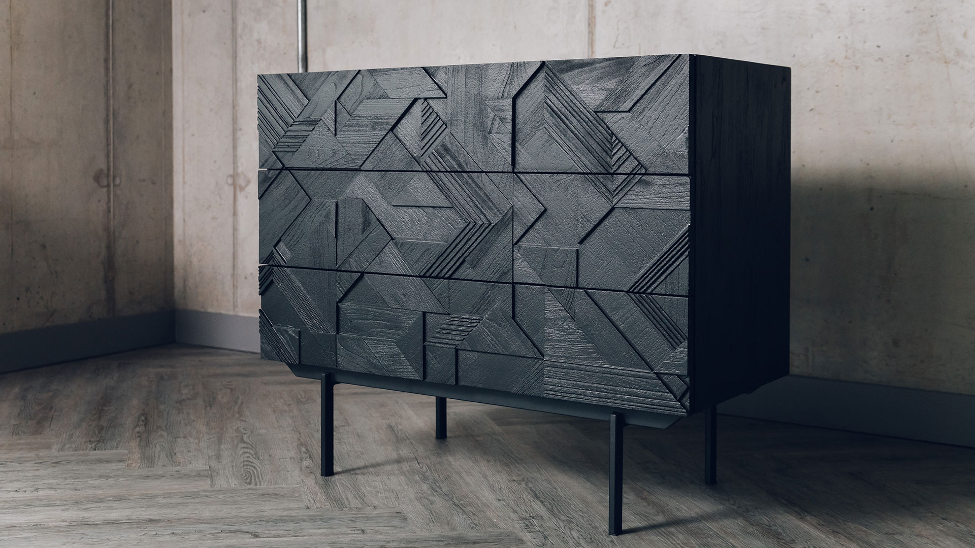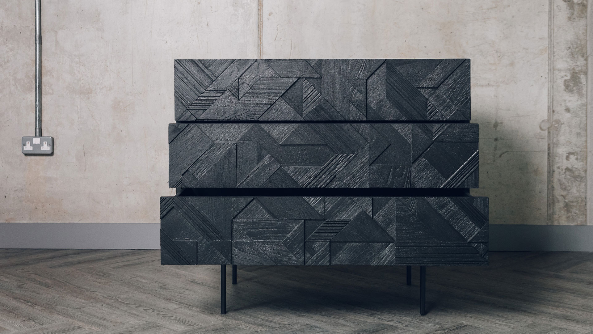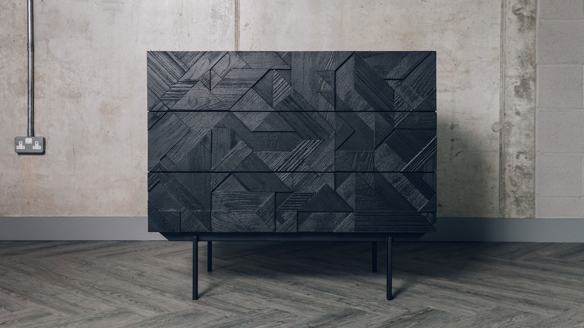 Made using solid, black stained teak, the Ethnicraft Graphic Dresser is a unique, striking piece. This contemporary chest of drawers is layered with triangle design in an opaque black finish. Ideal for use in either the hallway, bedroom or lounge, this item makes a bold statement, but keeps an understated profile.