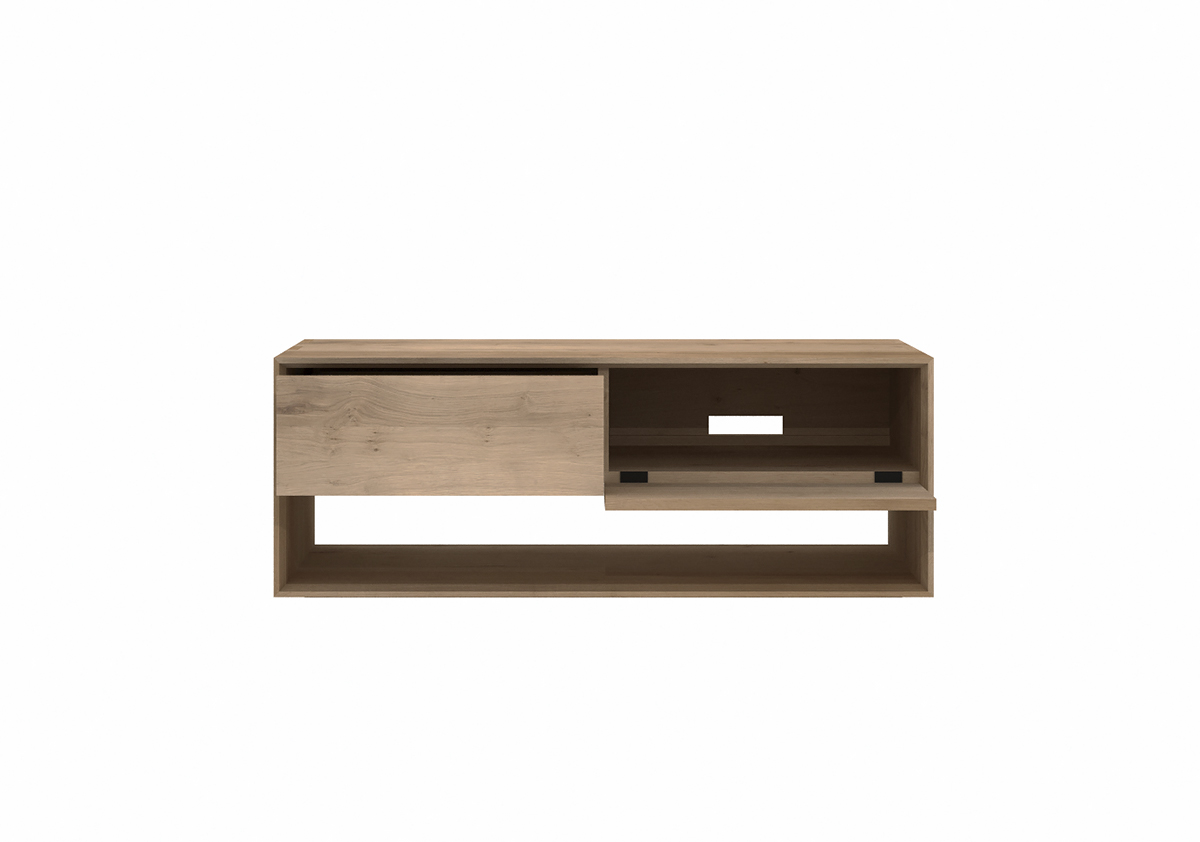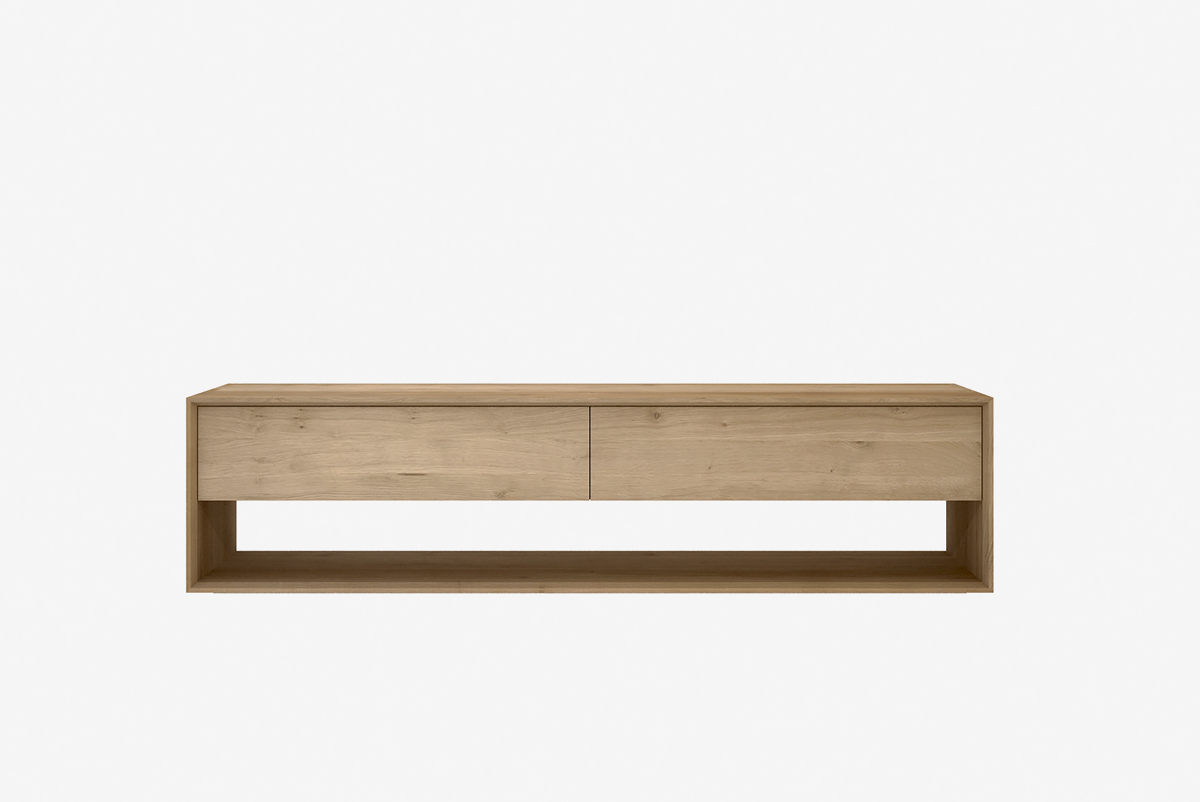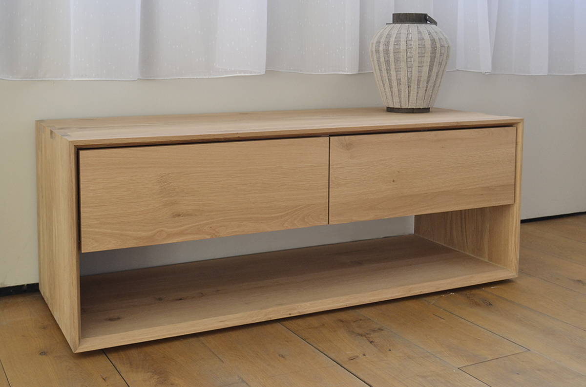 These Ethnicraft Low Storage unit is made of solid timber. Their simplistic design lends itself perfectly to minimal, modern homes. They come with one drawer, and one drop-down storage space; see pictures above for details. Choose from two different widths depending on your space.