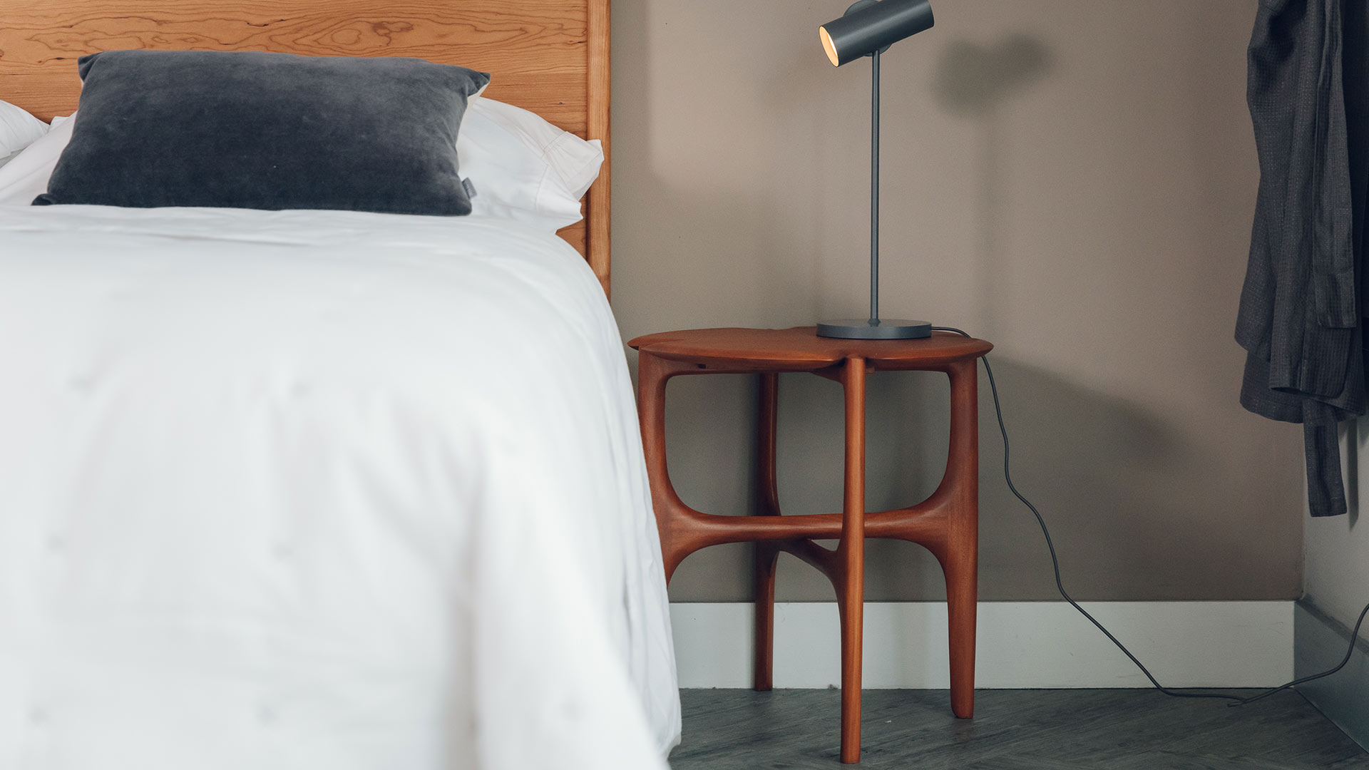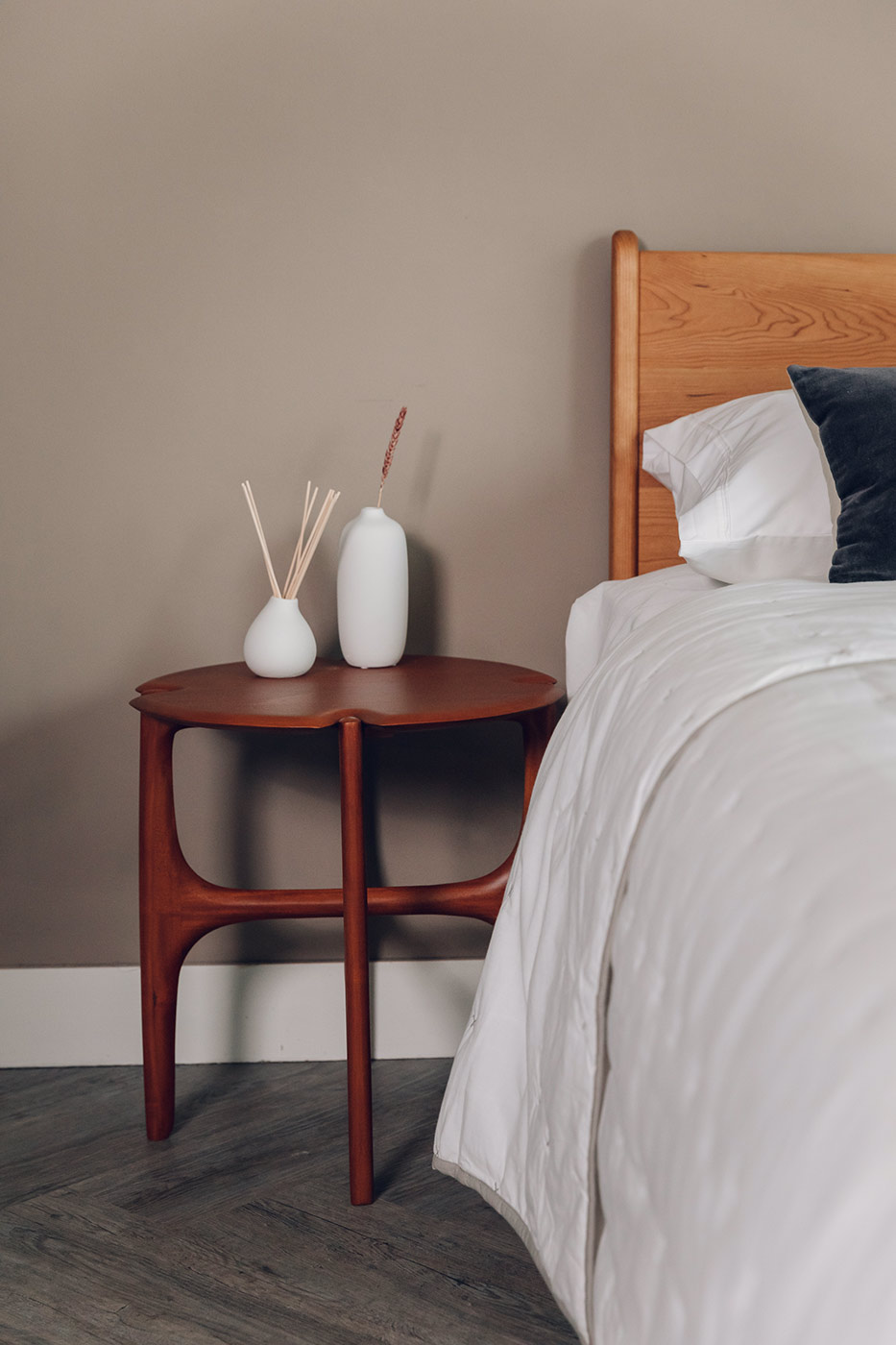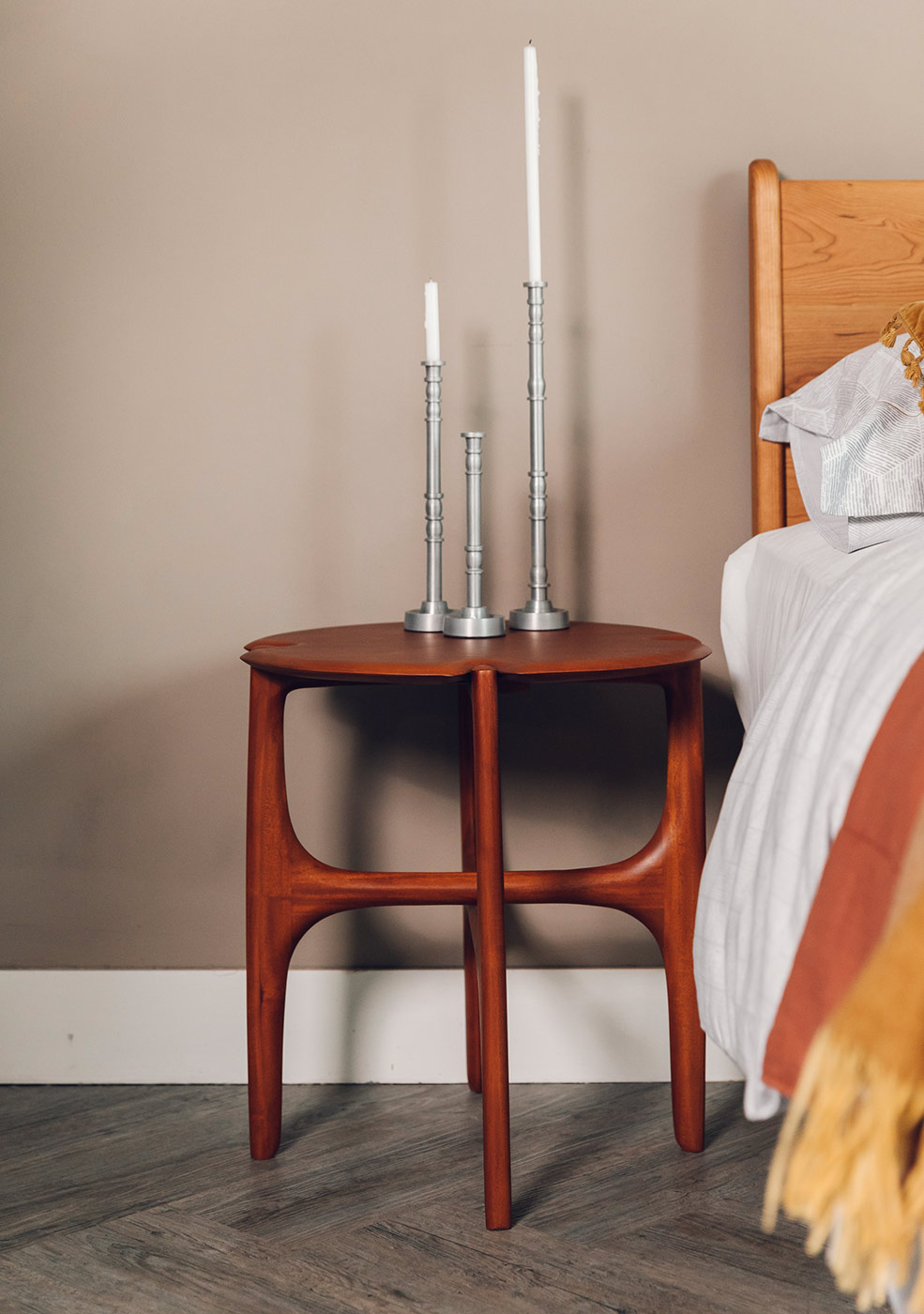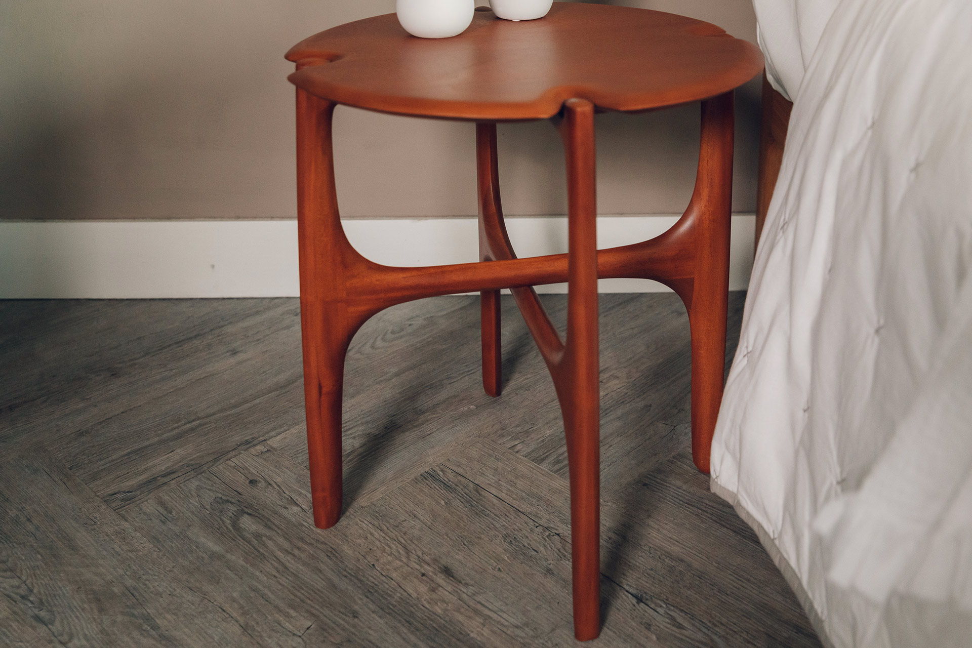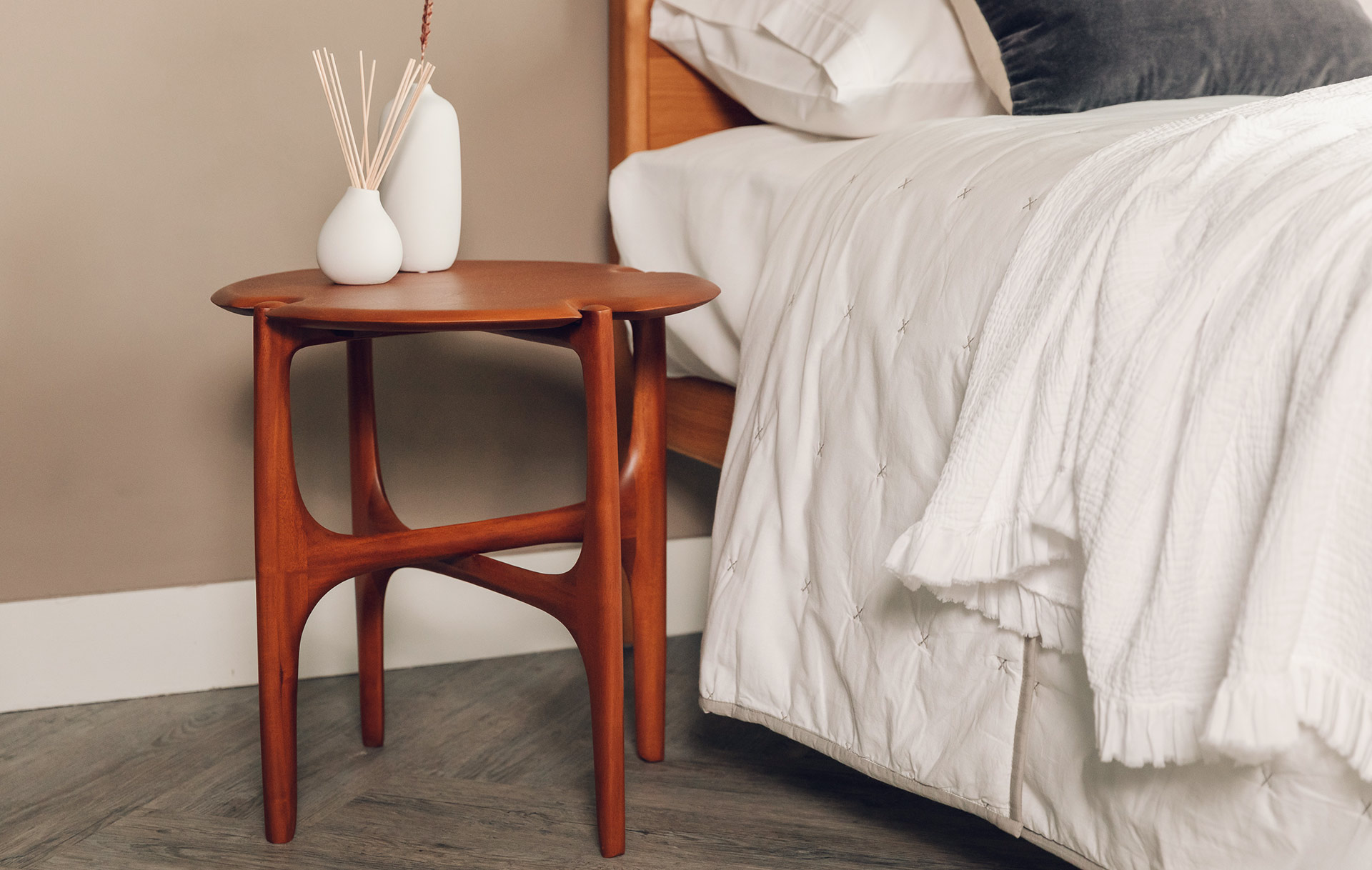 The Ethnicraft PI side table is a stylish addition to any space. With elegantly curved, tapered legs and shaped table top. Made in solid mahogany with a clear finish, this timber has rich, reddish tones. The perfect partner to a living room set, or as a bedside table. Please read below if looking to match to a Natural Bed Company bed.