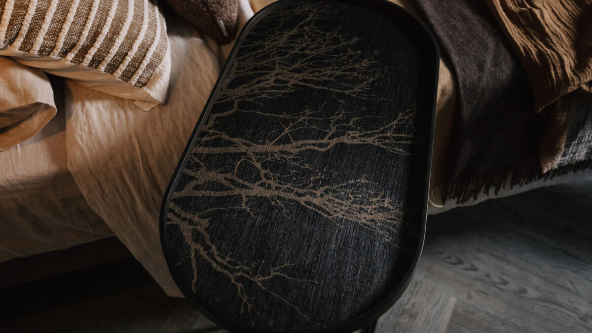 An oblong tray side table available either with or without its matching tray. Made with black-tinted wood in a water-based varnish, this table top is stylish and perfectly designed to hold the matching tray. The frame is also in sleek black metal, with the accompanying hand-painted tray being made from silk-screen printed wood.