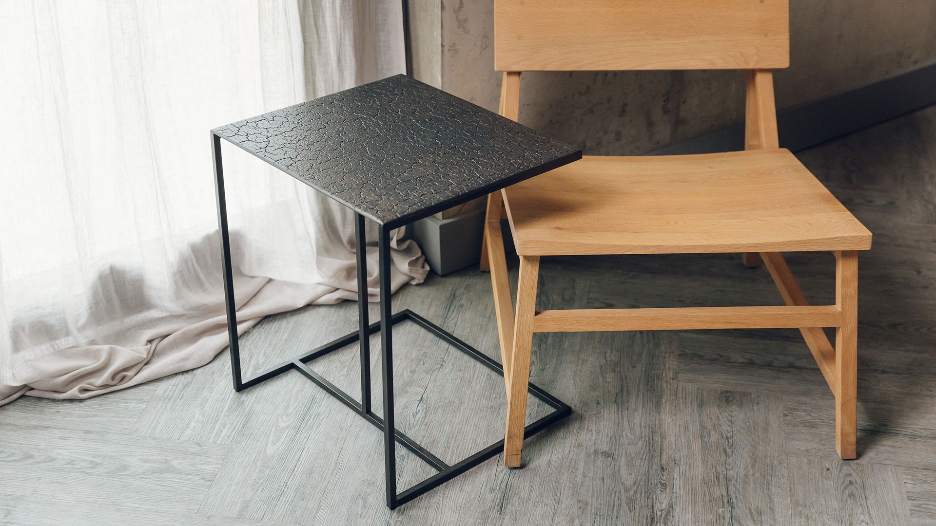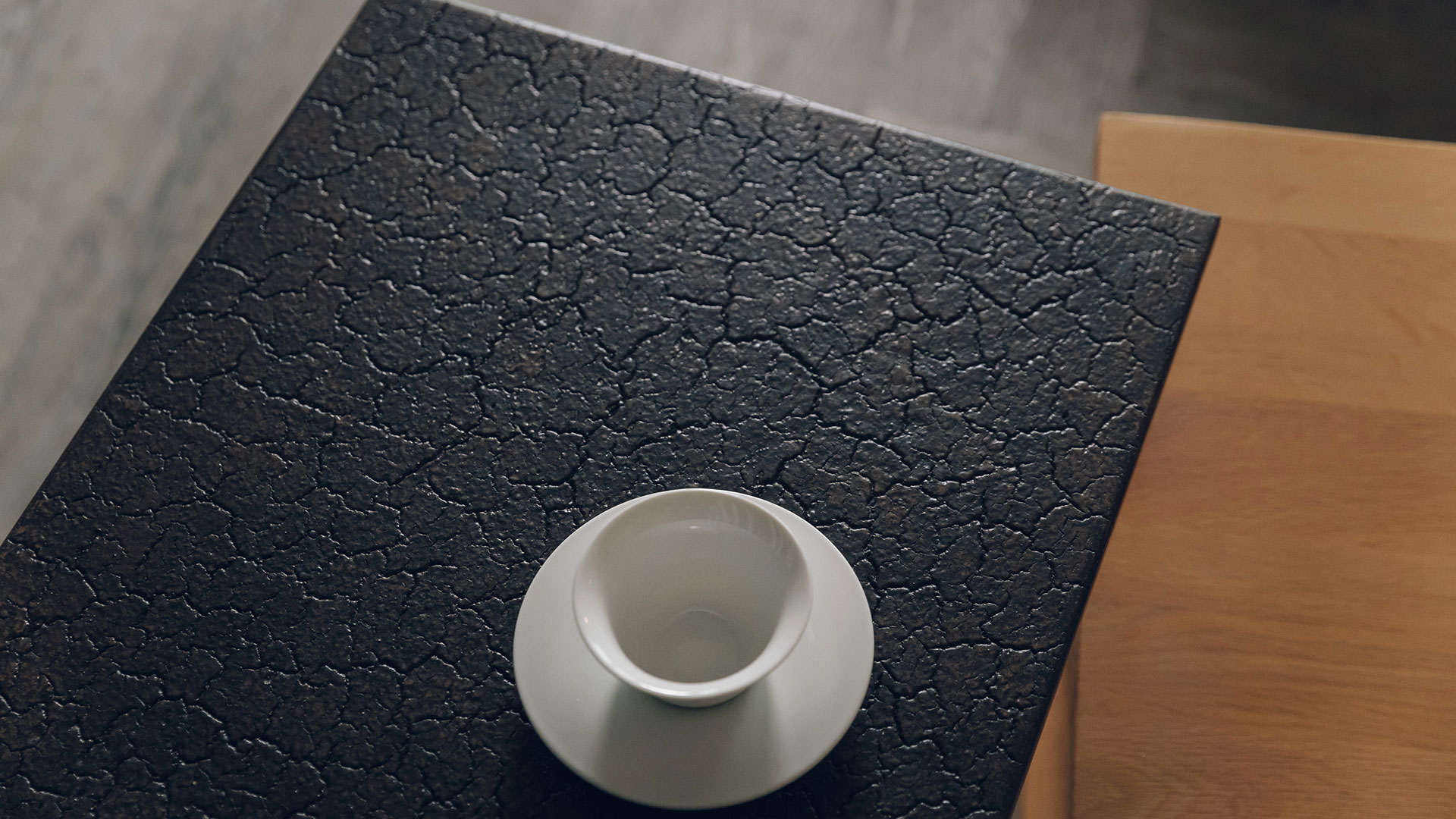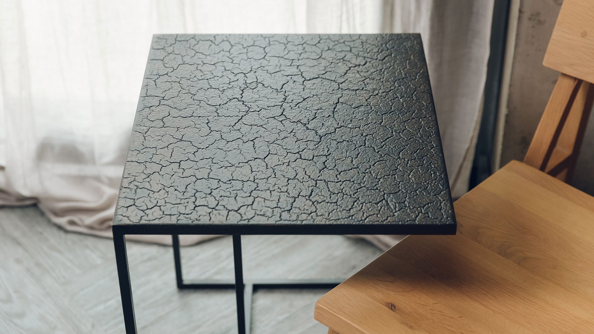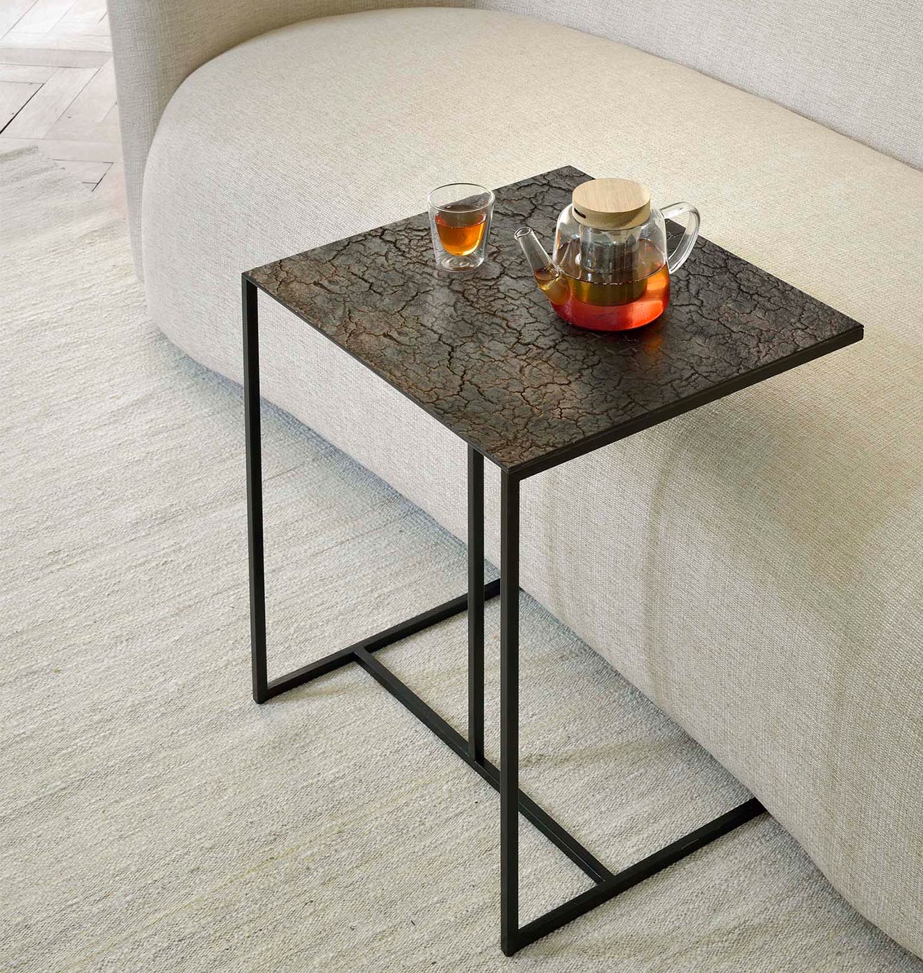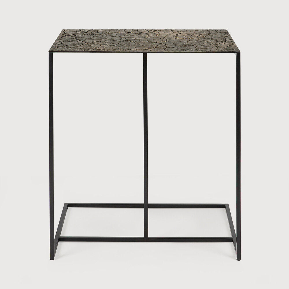 Made from a combination of mineral powders, water, earth and natural colour pigments, this unique side table from Ethnicraft features a distinctive crackled top in a combination of black and bronzed tones.
