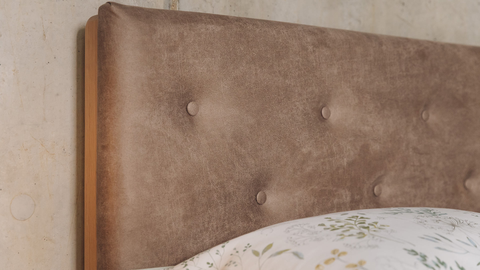 Available here in a standard king-size (fits a 150x200cm mattress) and made from solid oak. The headboard is upholstered in the Vaquero – Fawn Fabric.